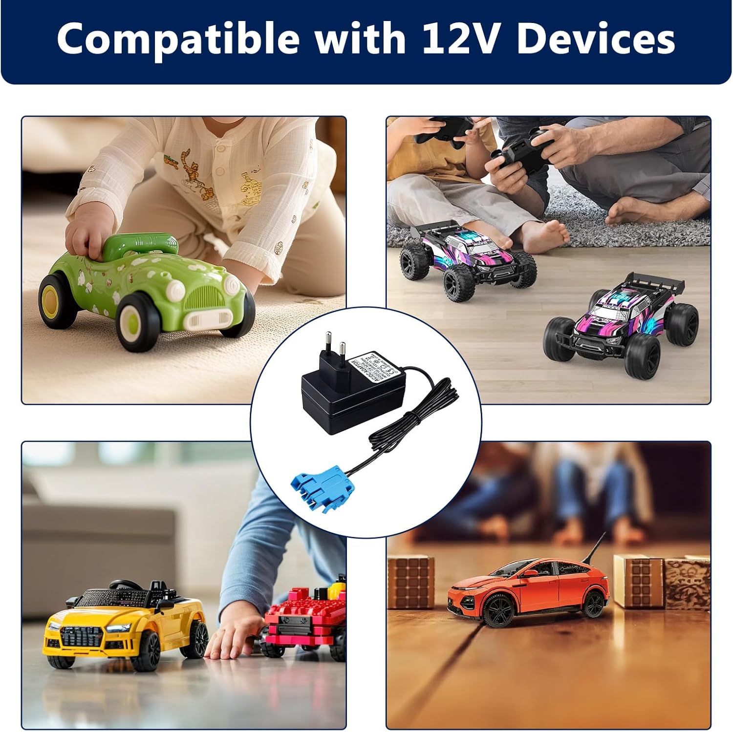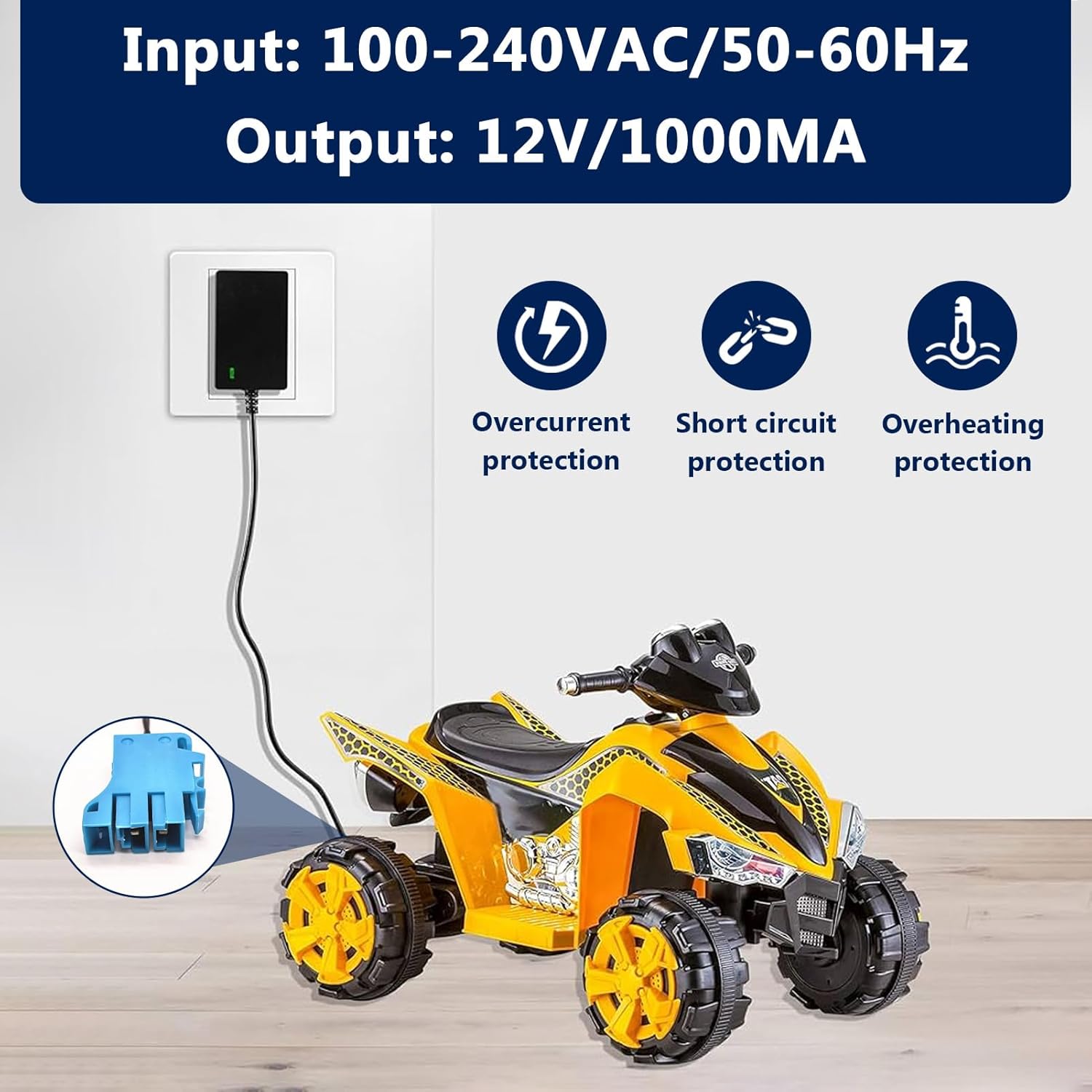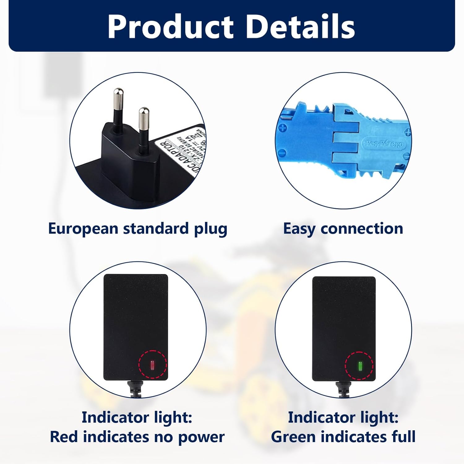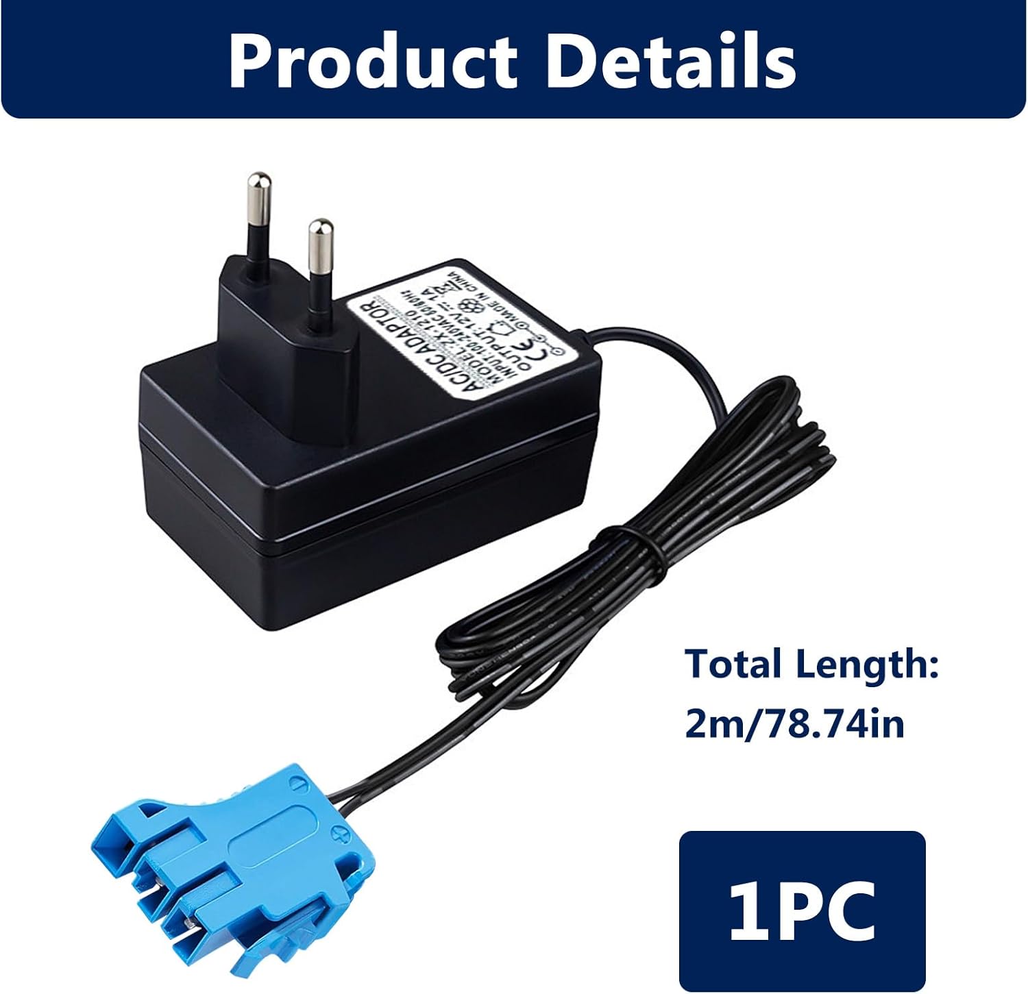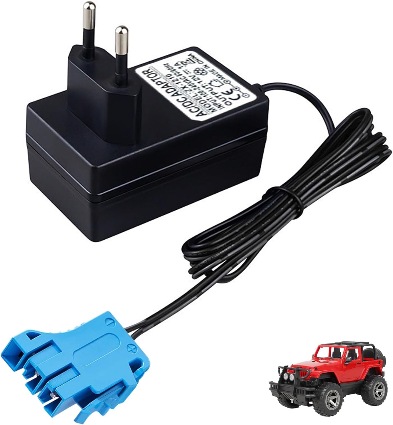【Ampia compatibilità】 Caricabatterie da 12 V progettato per Peg-Perego, Force Tractor, John-Deere Gator XUV, Pollaris Outlaw, Citrus, RZR 900, SUV, ATV, moto e giocattoli compatibili con batterie Blue Top da 12 V. 【Pratico indicatore LED】 Indicatore luminoso integrato: rosso durante la ricarica, verde a carica completa. Facile controllo visivo per una sicurezza ottimale e un monitoraggio della ricarica, anche a distanza. 【Ricarica rapida ed efficiente】 Uscita: 12 V 1000 mA, ingresso universale 100-240 V, 50-60 Hz. Consente una ricarica affidabile in poche ore, per consentirti di utilizzare il tuo veicolo elettrico più a lungo. 【Facile da installare】 Nessuna configurazione richiesta: collega il caricabatterie alla presa a muro e poi al veicolo elettrico. Funzionamento intuitivo adatto a tutti, senza bisogno di attrezzi o regolazioni complesse. 【Lunghezza del cavo 2 metri】L'adattatore è dotato di un cavo da 2 metri per maggiore flessibilità e praticità, consentendo un collegamento facile anche quando la presa è lontana. Ideale per uso domestico o in garage.