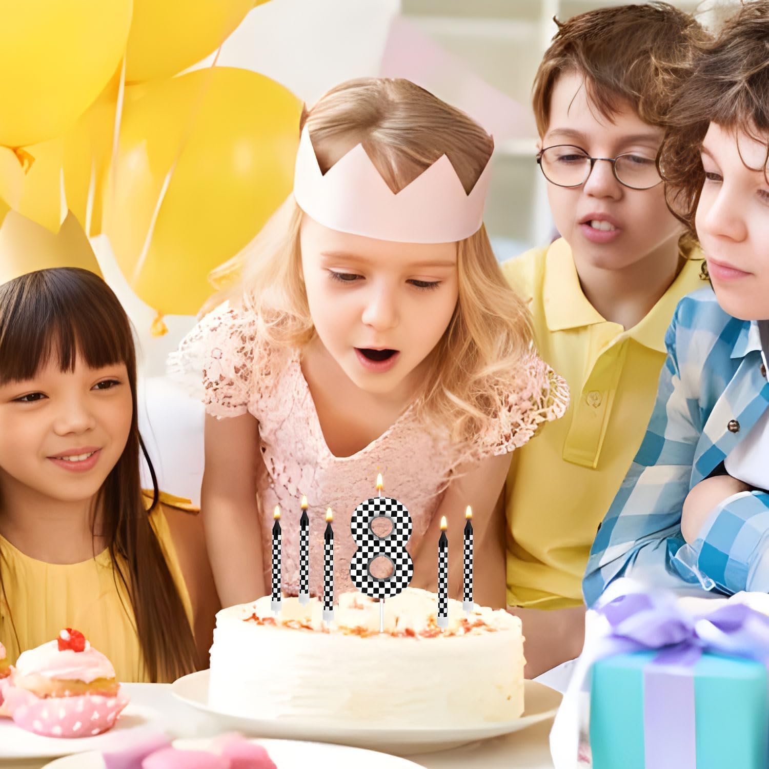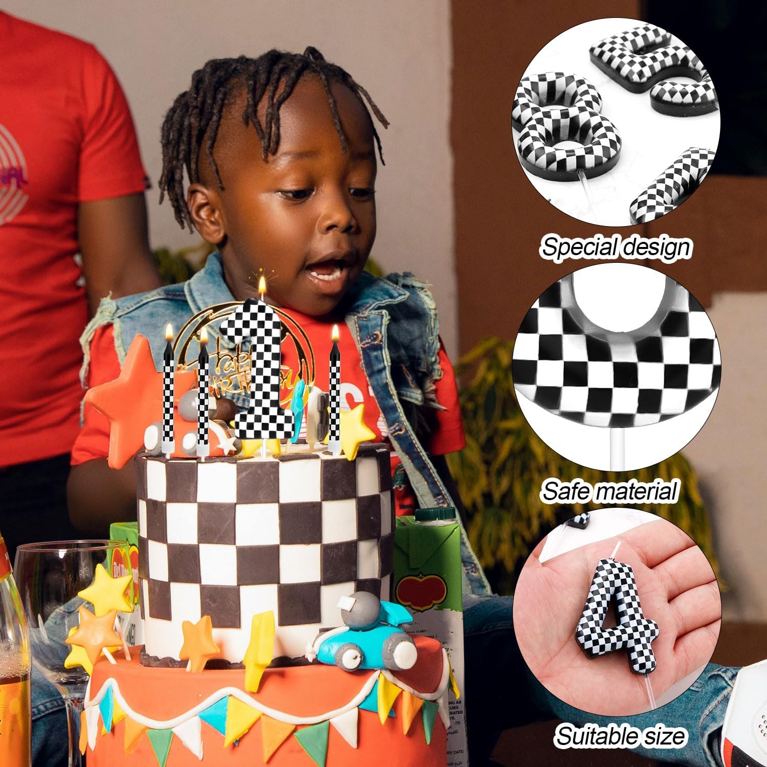 Contenuto del prodotto: il pacchetto include 13 pezzi di candele buon compleanno a tema per auto da corsa, tra cui 12 candele a scacchi e 1 candela di numero di compleanno.Sufficiente per soddisfare le tue esigenze di decorazione della torta di compleanno. Design unico: la candela di compleanno dispone di un design a scacchi in bianco e nero, creativo e unico, perfetto per feste di compleanno a tema da corsa e celebrazioni, queste candele impressiranno sicuramente i tuoi ospiti. Materiale affidabile: le nostre candele di compleanno per auto da corsa sono realizzate con paraffina premium, sicure e affidabili, bruciano in modo uniforme e vivace, facili da inserire, portandoti un'esperienza d'uso piacevole. Dimensioni del prodotto: la candela numerica misura circa 5,8 cm di altezza, mentre la candela lunga a scacchi misura circa 9,1 cm. Ampia applicazione: queste candele per torta di compleanno possono essere utilizzate per varie occasioni, come compleanni per bambini, feste a tema per auto da corsa, festa per videogiochi, festa di compleanno e docce per bambini, ecc. Creando un momento appassionato e memorabile per i bambini e i loro cari eamici.
