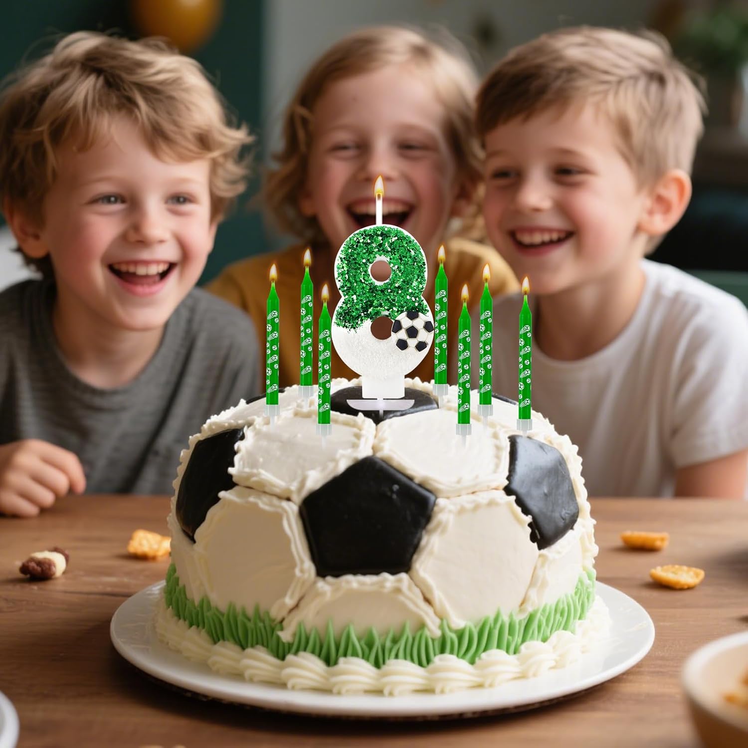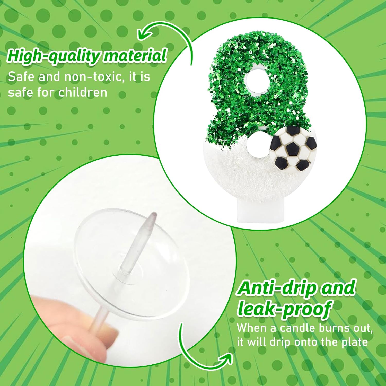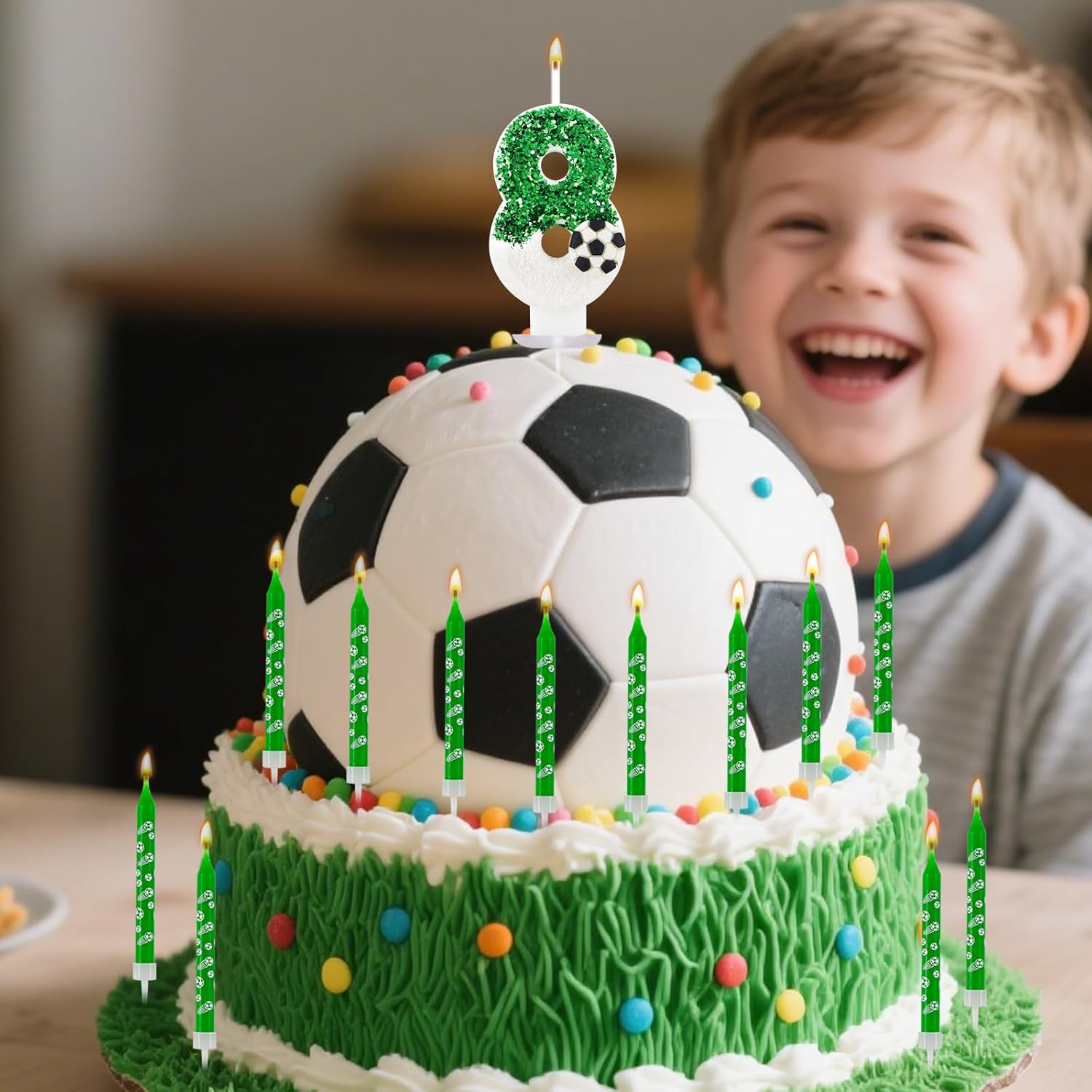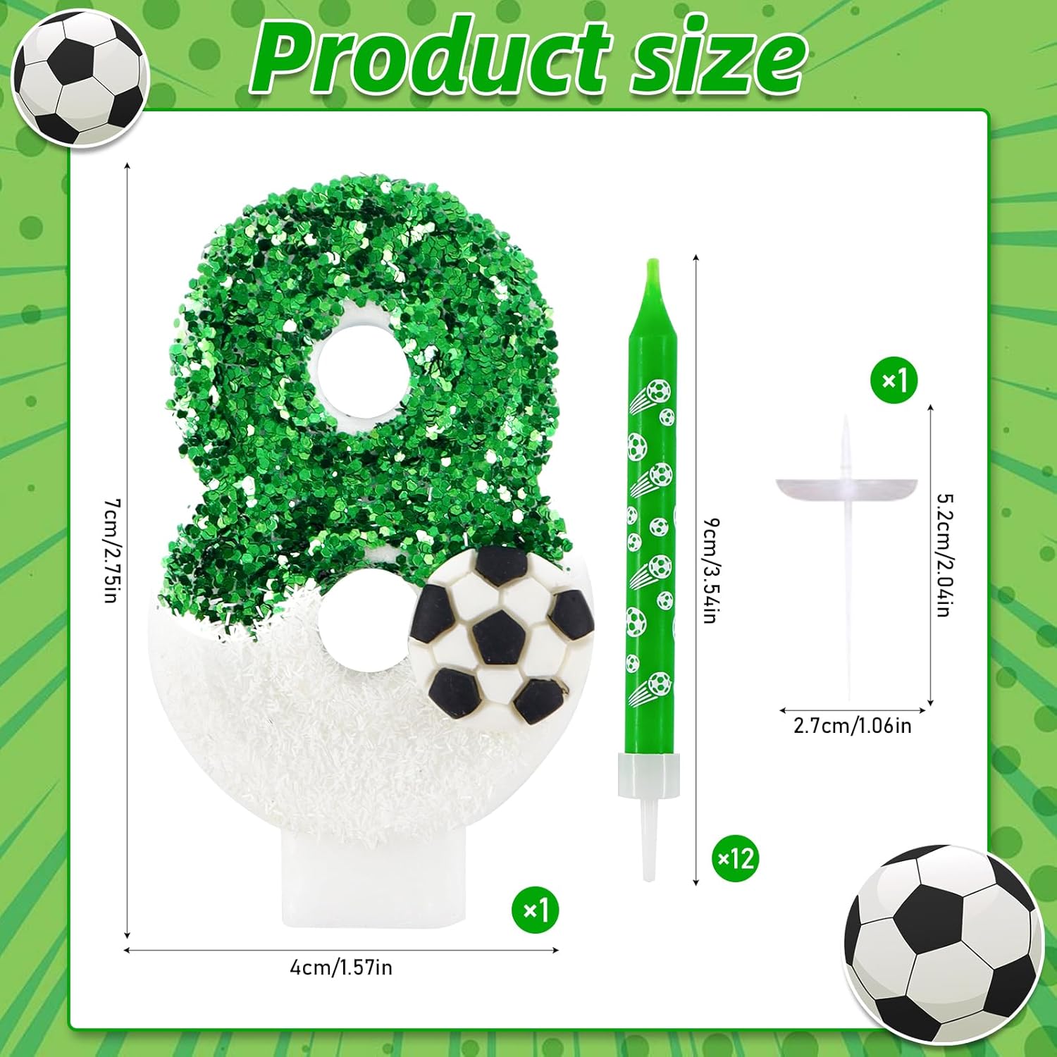 【13 Candeline di Compleanno a Forma di Pallone da Calcio】 Include una candela a forma di pallone da calcio con numero e 12 candeline lunghe per torta. Ogni candela con numero è confezionata singolarmente in una scatola di plastica per evitare danni durante la spedizione. 【Materiali di Alta Qualità】 Realizzata in cera di alta qualità, non tossica, inodore e innocua. Facile da accendere e brucia in modo uniforme. Attenzione: tenere le candele lontano da fiamme libere e bambini quando non vengono utilizzate. 【Decorazione per Torta a Forma di Pallone da Calcio con Numero 8】 Include tutto il necessario per la decorazione: una candela a forma di pallone da calcio con numero 8 e paillettes verdi e 12 candeline lunghe. Non è richiesta alcuna preparazione aggiuntiva; puoi decorare facilmente la tua torta subito dopo averla tolta dalla scatola, risparmiando tempo prezioso per la preparazione della festa e creando un'atmosfera da festa professionale. 【Candela a Forma di Pallone da Calcio con Paillettes Verdi】 Questa candela a forma di pallone da calcio con numero e paillettes verdi è lunga circa 7 cm (esclusa la spina) e larga 4 cm. La decorazione con paillettes verdi potrebbe staccarsi leggermente durante la spedizione, ma ciò non influirà sull'effetto finale. 【Regalo perfetto】 Un regalo che porta sorpresa e risate. Che tu lo regali a tuo figlio, tua figlia, tuo nipote o a un appassionato tifoso di calcio, questa candela a tema sarà il fulcro della festa, lasciando loro splendidi ricordi pieni di gioia e passione sportiva.
