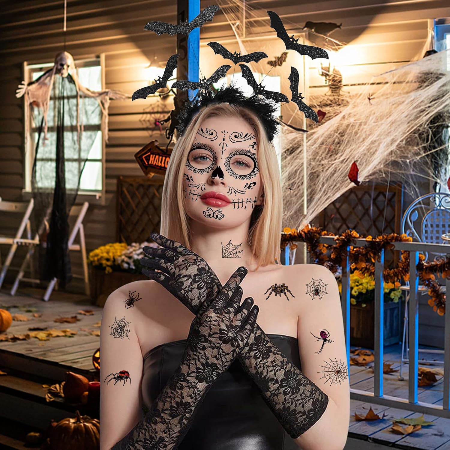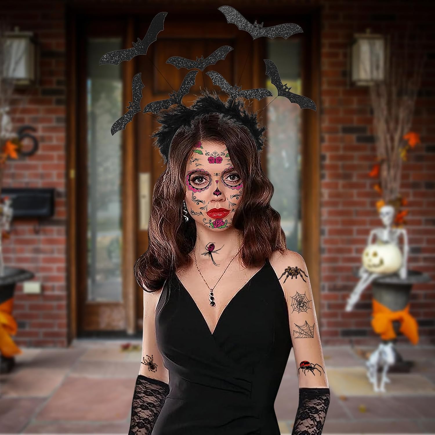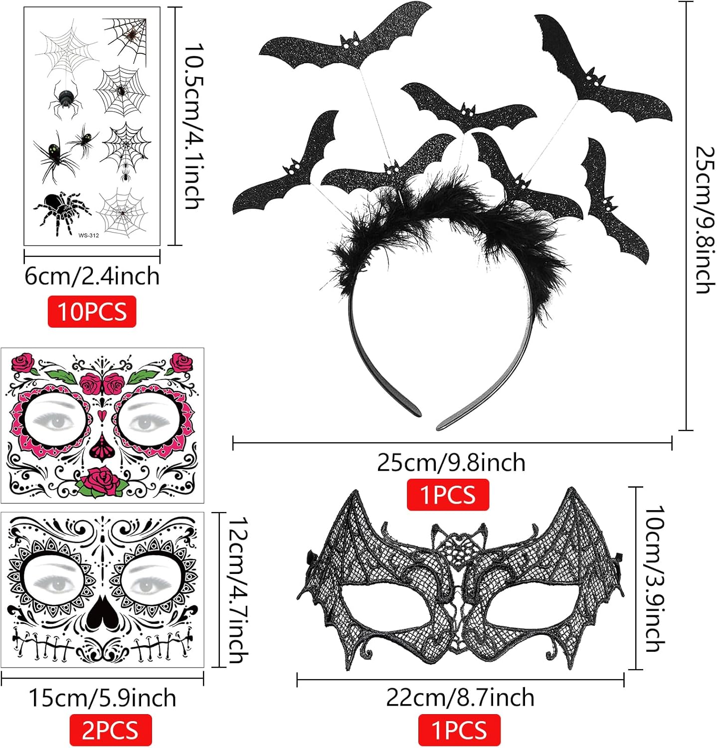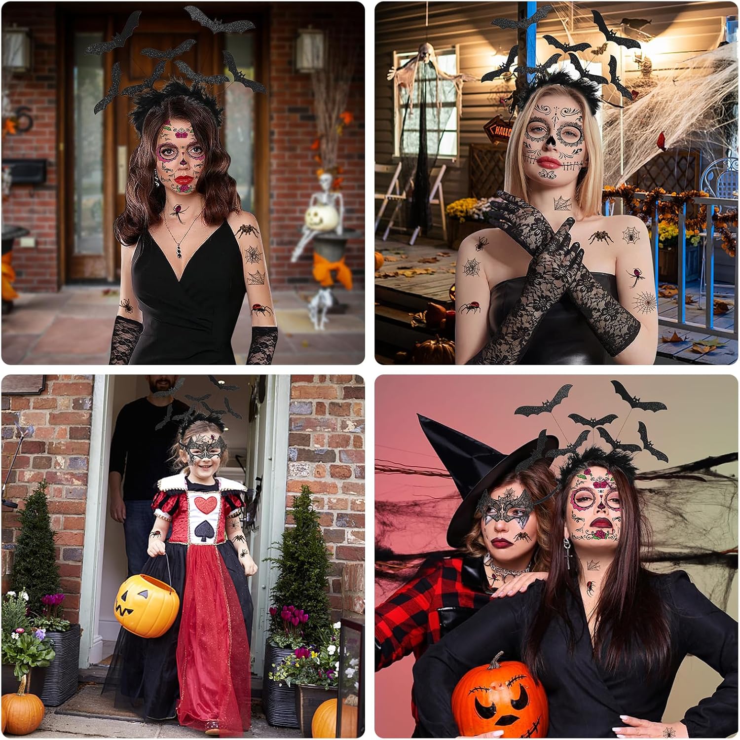 14 pezzi accessori per costume di Halloween con piume pipistrello Halloween cerchietto per capelli veneziano Masquerade Adesivi temporanei per tatuaggi vampiri Cerchietti per capelli