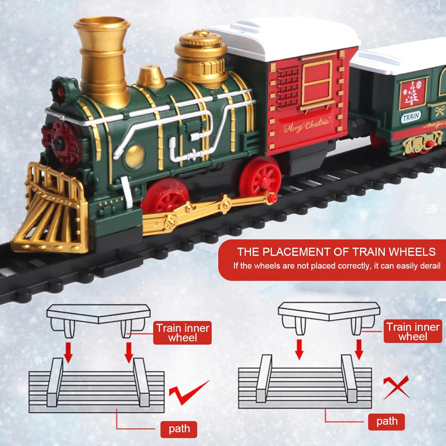 Exquisito arredamento per le vacanze: trasforma la tua casa in un paese delle meraviglie invernale con il nostro treno di Natale magnificamente decorato..Con carrozzine affascinanti e un proiettore abbagliante, questo squisito treno crea un'atmosfera magica perfetta per diffondere allegria natalizia e fare ricordi festivi. Assemblaggio intuitivo: non sono necessarie istruzioni complesse per godersi il magico del nostro set di treni!.Basta assemblare le tracce e fissarle con blocchi di binari inclusi per una configurazione senza soluzione di continuità..Con solo un capovolgimento dell'interruttore, l'incantevole inizia perfetta per un'esperienza di vacanza senza problemi. Luci e suoni incantevoli: eleva lo spirito natalizio con le luci e la musica integrate del treno, suonando canzoni classiche di Natale e Capodanno..Basta inserire 2 batterie AA (non incluse) e guardare mentre questo delizioso treno dà vita alle celebrazioni delle vacanze con i suoi suoni allegri e l'atmosfera luminosa. Intrattenimento versatile: incastonato sotto l'albero di Natale o allestito tra i regali delle vacanze, questo set di treni porta gioia ai bambini di età compresa tra 3-8 e offre intrattenimento infinito per ogni occasione..Non è solo una decorazione;.È un'attività festosa che aggiunge calore ed eccitazione alla tua casa. Design sicuro: realizzato con materiali plastici di qualità, questo set di treni di Natale è progettato per la durata e la longevità, rendendolo adatto a piccole mani..Con bordi fluidi e arrotondati, questo treno garantisce un'esperienza di gioco sicura, permettendo ai bambini di godere di deliziose avventure senza preoccupazioni.