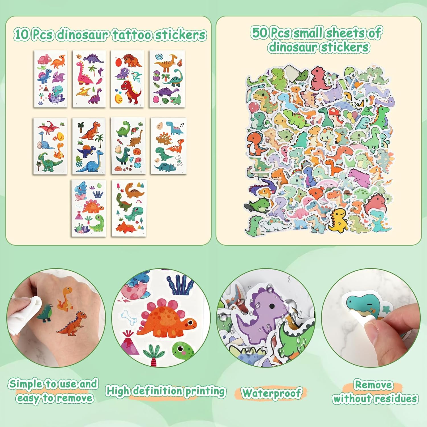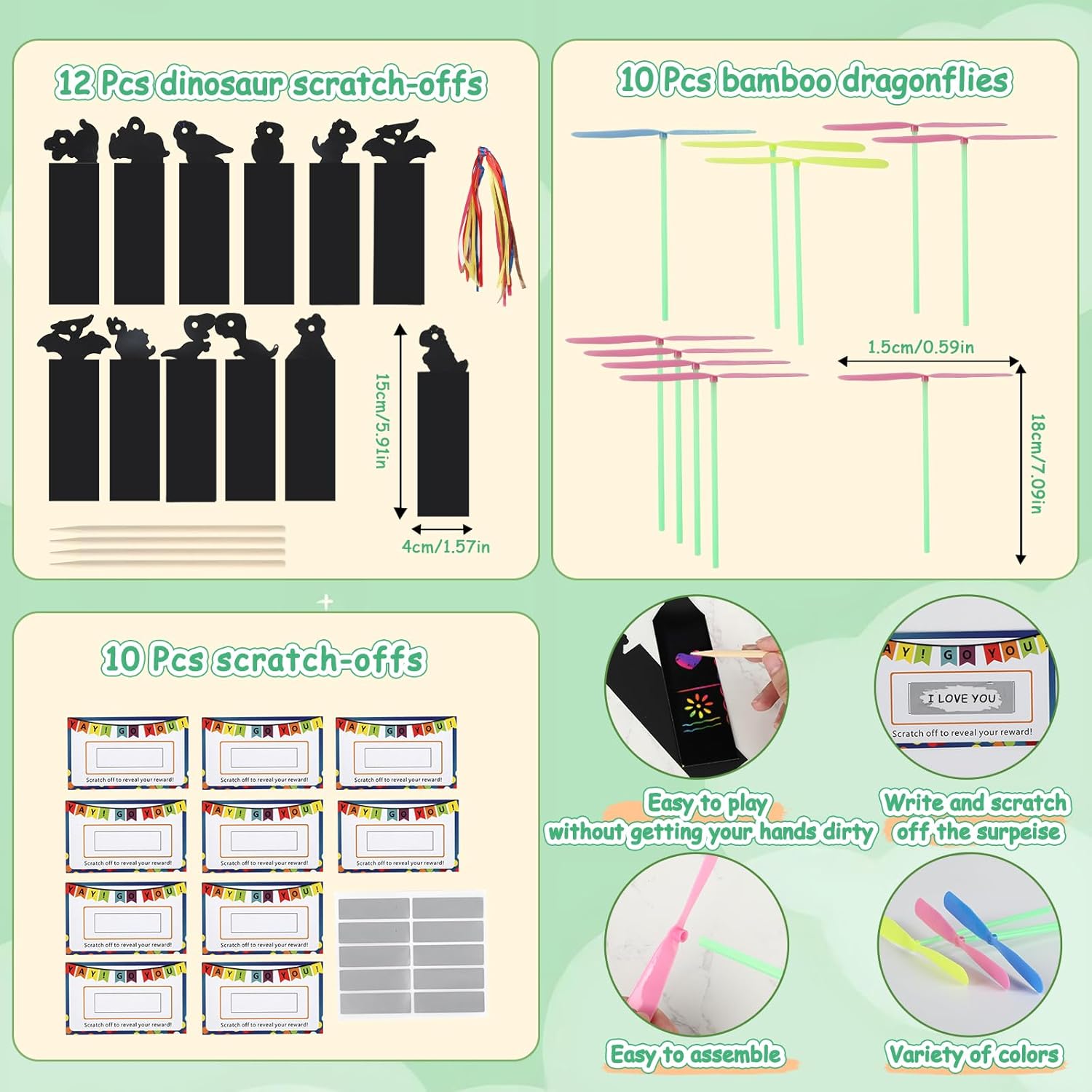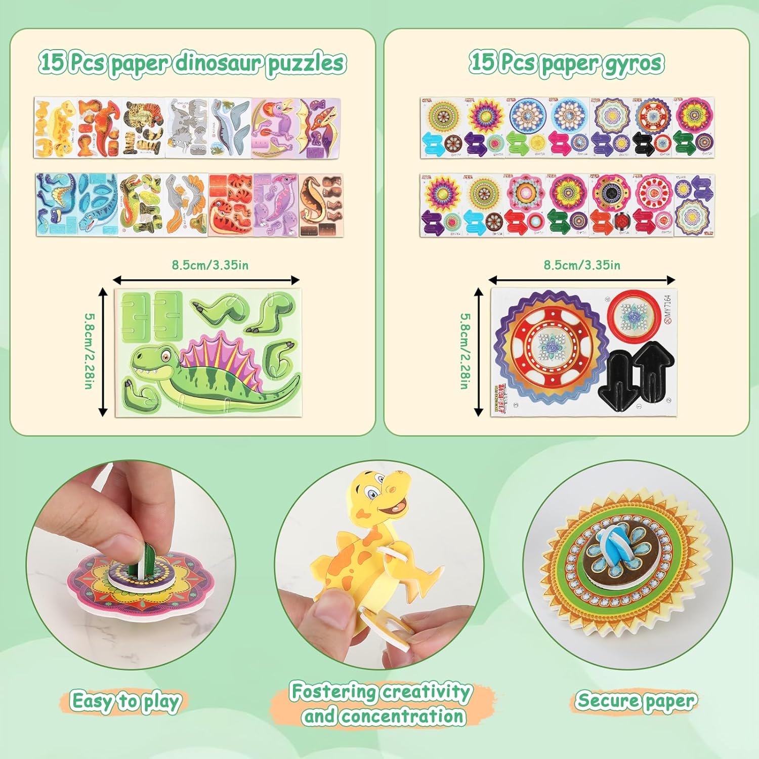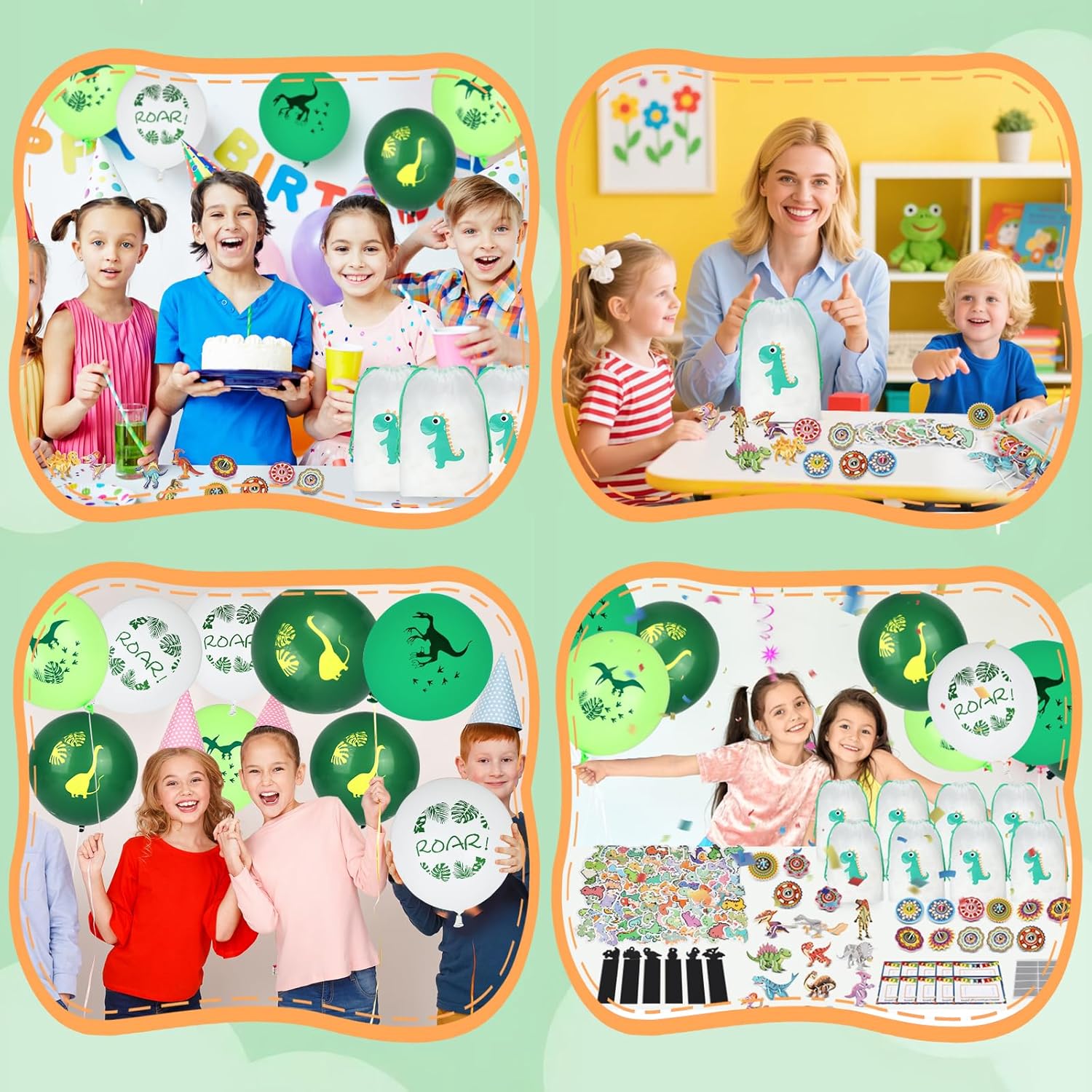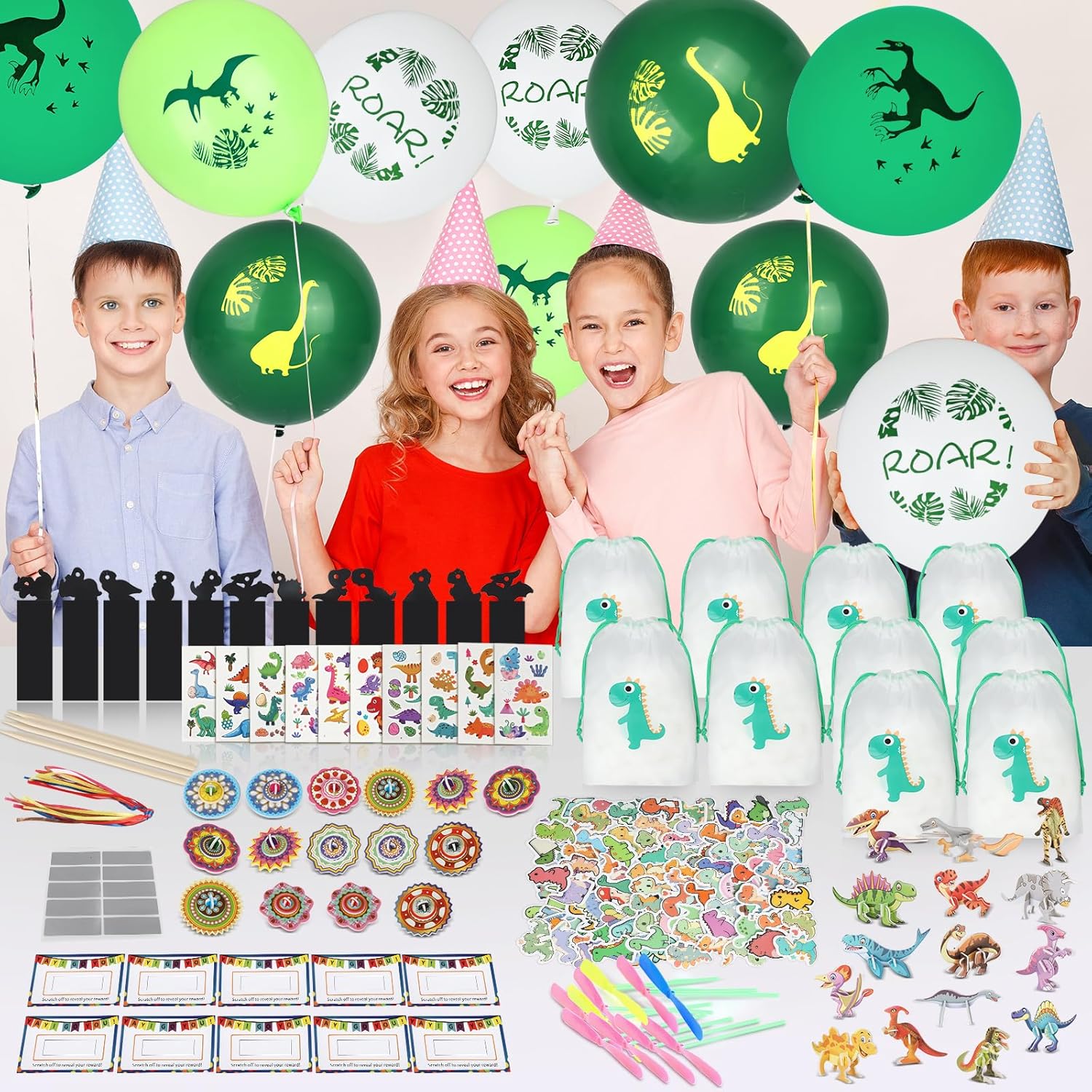 【Accessori completi】: questa decorazione per compleanno Dino include 15 puzzle di dinosauri 3D + 10 palloncini in lattice + 10 tasche con coulisse + 10 adesivi per tatuaggi + 12 carta tiragraffi + 50 adesivi + 15 trottole di carta + 10 graffi + 10 libellule di bambù e altri 9 accessori, per un totale di 142 giocattoli DINO le esigenze delle decorazioni, Giochi per soddisfare i regali, eliminando la difficoltà di acquistare separatamente. 【Materiale sicuro】: il puzzle e la trottola in questo dinosauro decorativo per il compleanno dei bambini sono realizzati in cartone ispessito con bordi arrotondati, la libellula di bambù è realizzata in plastica flessibile, il palloncino è in lattice e il sacchetto con coulisse è realizzato in materiale PE per uso alimentare, che soddisfa gli standard di sicurezza dei giocattoli per bambini, in modo che i genitori possano essere sicuri che i loro bambini possano giocare. Simpatico tema dinosauro: questo regalo per gli ospiti per il compleanno dei bambini ha elementi di dinosauro nella maggior parte dei prodotti, dai puzzle, adesivi per tatuaggi alla carta da grattare e grattare, che rappresentano una vasta gamma di immagini di dinosauri, in modo che i bambini possano riconoscere i tipi di dinosauri nel gioco e coltivare interessi artistici. Set interattivo genitore-figlio: questo regalo per il compleanno dei bambini contiene 8 tipi di giochi interattivi come puzzle 3D (allena il pensiero spaziale), trottola di carta (allena la forza della mano), musica tiragraffi (migliora la concentrazione), ecc., che consentono ai genitori di partecipare facilmente al gioco e sentire il divertimento di accompagnare i loro bambini. Decorazione per feste e favori: i palloncini e gli adesivi in questa decorazione dinosauro possono creare rapidamente una scena a tema dinosauro, il sacchetto con coulisse può essere confezionato direttamente come regalo di accompagnamento, e i giocattoli rimanenti possono essere distribuiti come regali di restituzione, eliminando la necessità di costi aggiuntivi ed è una scelta conveniente per feste di compleanno all'asilo/feste di famiglia.