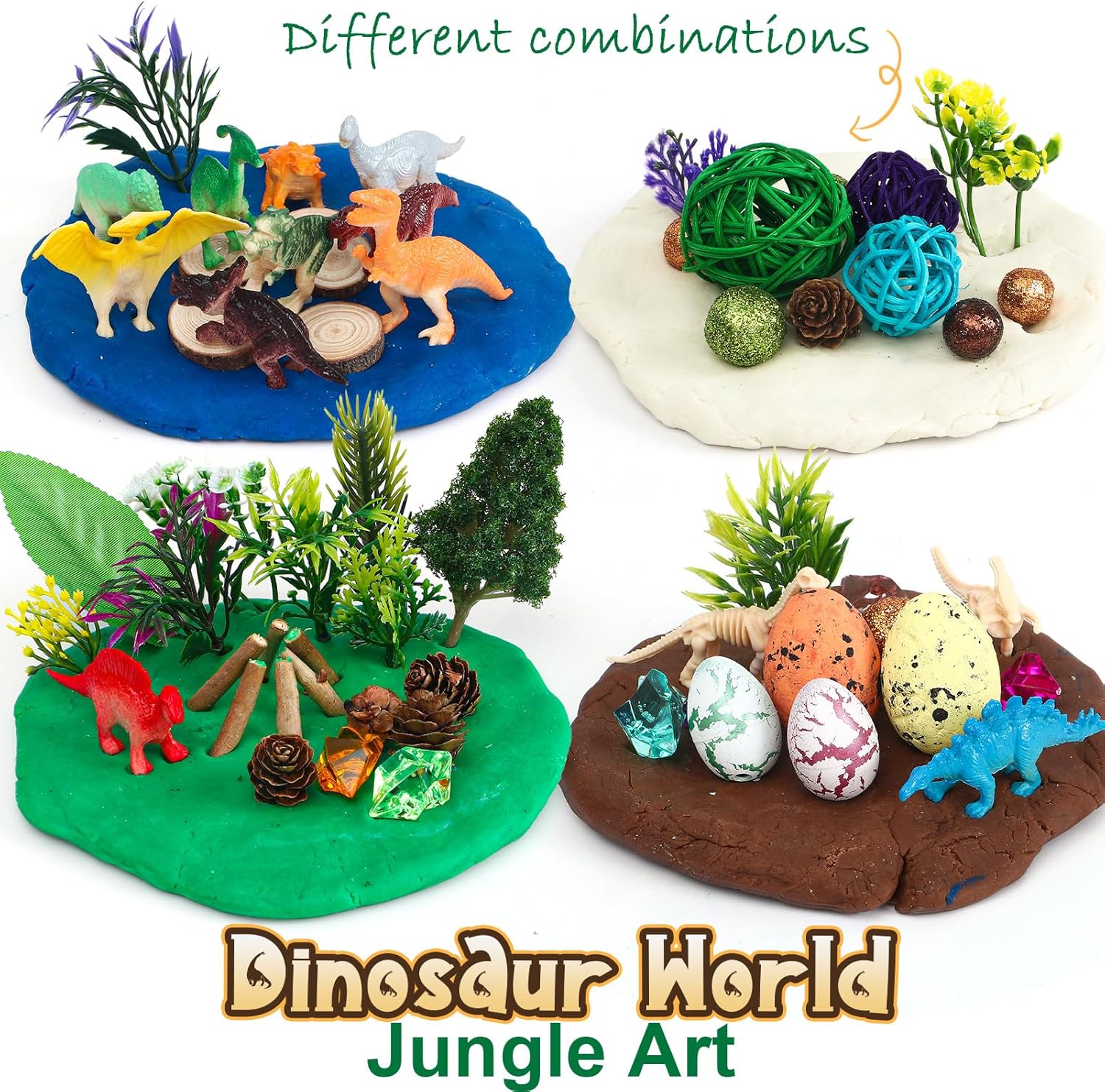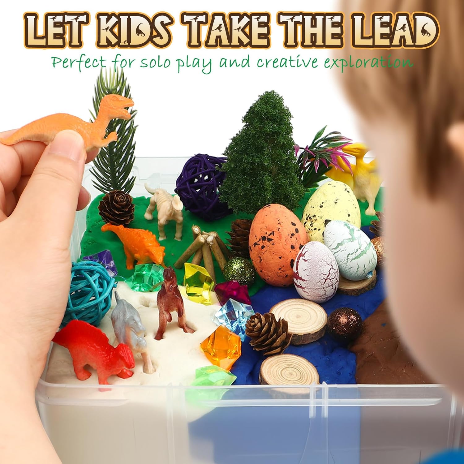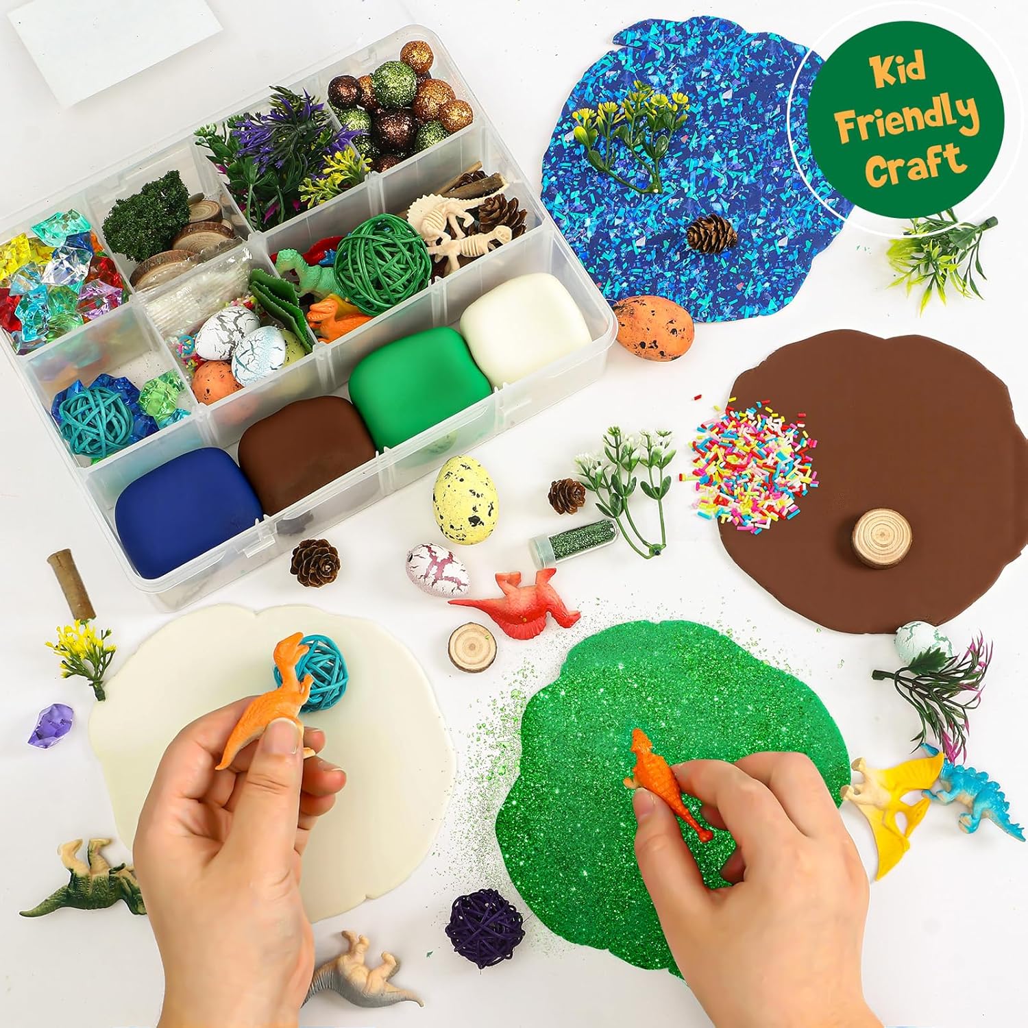 Set di plastilina magica per dinosauri: questo set di plastilina contiene 146 pezzi, inclusi 4 sacchetti di plastilina colorata, 5 pigne, 4 uova di dinosauro, 50 diamanti, 12 dinosauri, 2 rami, 3 palline, 13 tronchi di legno, 2 scheletri di dinosauro, 30 palline, 1 albero, 5 foglie, 11 fili d'erba, 2 glitter e 2 bustine di frammenti decorativi. Perfetto per creare un mondo preistorico immaginario pieno di dinosauri e avventure! Stimola la creatività e le capacità motorie: con questo set artigianale per bambini, i piccoli artisti possono dare libero sfogo alla loro immaginazione e creare il proprio mondo di dinosauri con l'argilla da modellare. Questo gioco sensoriale e creativo promuove la coordinazione occhio-mano, migliora le capacità motorie e stimola l'immaginazione mentre modella dinosauri, paesaggi o scene preistoriche. Sicuro e di alta qualità: l'argilla da modellare e tutti gli accessori sono realizzati con materiali atossici e di alta qualità, completamente sicuri per i bambini. Facile da maneggiare, l'impasto è morbido e si asciuga all'aria, formando una superficie solida dopo l'essiccazione, senza bisogno di cottura! Questo set di pasta modellabile è l'attività perfetta per i bambini dai 3 anni in su, unendo divertimento e sicurezza. Molteplici possibilità di gioco: con i suoi numerosi accessori, i bambini possono immaginare innumerevoli scenari, da un'avventura con i dinosauri a una caccia al tesoro preistorica. La combinazione di pasta modellabile, dinosauri, tronchi di legno, glitter ed elementi decorativi offre infinite idee fai-da-te. Questo set artigianale per bambini stimola la creatività e incoraggia la narrazione fantasiosa. Regalo perfetto per bambini creativi: questo set di pasta da gioco con dinosauri viene fornito in una pratica scatola trasparente. La scatola è facile da trasportare e garantisce che tutto rimanga in ordine dopo il gioco. Che si tratti di un compleanno, di Natale o di qualsiasi altra occasione, questo set artigianale per bambini è il regalo perfetto per ragazze e ragazzi dai 3 ai 12 anni, che amano creare con l'argilla da modellare ed esplorare emozionanti avventure preistoriche.