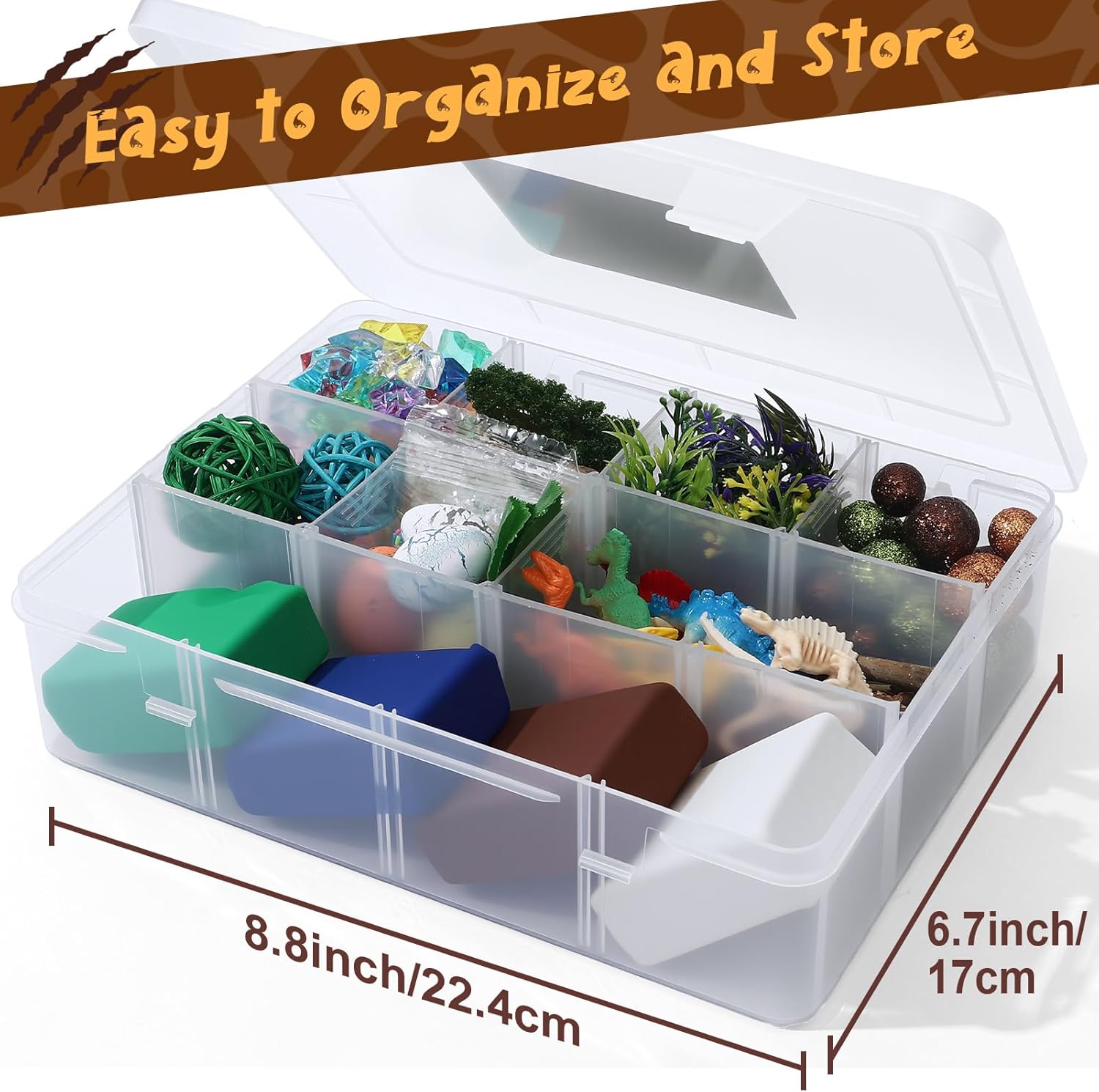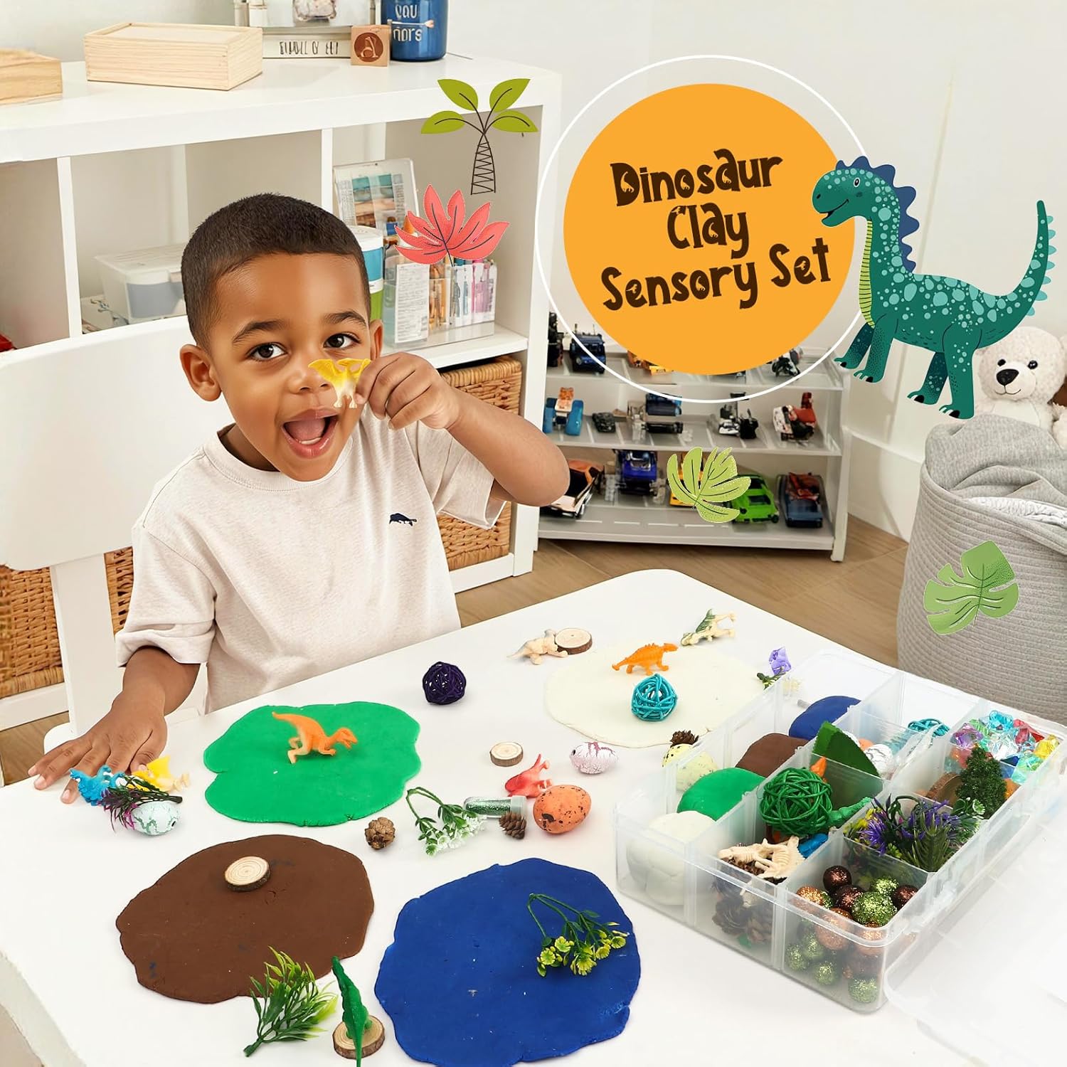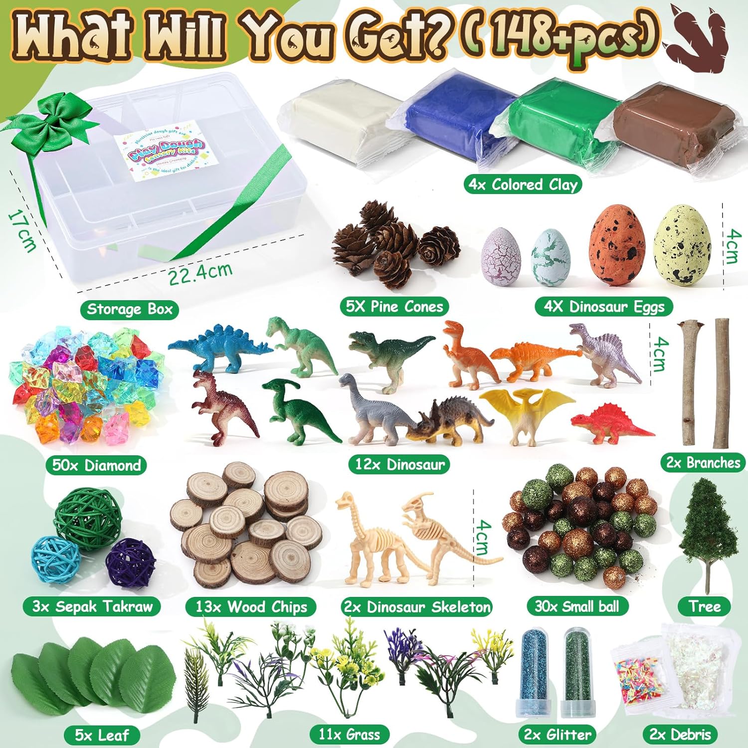 Set di plastilina magica per dinosauri: questo set di plastilina contiene 146 pezzi, inclusi 4 sacchetti di plastilina colorata, 5 pigne, 4 uova di dinosauro, 50 diamanti, 12 dinosauri, 2 rami, 3 palline, 13 tronchi di legno, 2 scheletri di dinosauro, 30 palline, 1 albero, 5 foglie, 11 fili d'erba, 2 glitter e 2 bustine di frammenti decorativi. Perfetto per creare un mondo preistorico immaginario pieno di dinosauri e avventure! Stimola la creatività e le capacità motorie: con questo set artigianale per bambini, i piccoli artisti possono dare libero sfogo alla loro immaginazione e creare il proprio mondo di dinosauri con l'argilla da modellare. Questo gioco sensoriale e creativo promuove la coordinazione occhio-mano, migliora le capacità motorie e stimola l'immaginazione mentre modella dinosauri, paesaggi o scene preistoriche. Sicuro e di alta qualità: l'argilla da modellare e tutti gli accessori sono realizzati con materiali atossici e di alta qualità, completamente sicuri per i bambini. Facile da maneggiare, l'impasto è morbido e si asciuga all'aria, formando una superficie solida dopo l'essiccazione, senza bisogno di cottura! Questo set di pasta modellabile è l'attività perfetta per i bambini dai 3 anni in su, unendo divertimento e sicurezza. Molteplici possibilità di gioco: con i suoi numerosi accessori, i bambini possono immaginare innumerevoli scenari, da un'avventura con i dinosauri a una caccia al tesoro preistorica. La combinazione di pasta modellabile, dinosauri, tronchi di legno, glitter ed elementi decorativi offre infinite idee fai-da-te. Questo set artigianale per bambini stimola la creatività e incoraggia la narrazione fantasiosa. Regalo perfetto per bambini creativi: questo set di pasta da gioco con dinosauri viene fornito in una pratica scatola trasparente. La scatola è facile da trasportare e garantisce che tutto rimanga in ordine dopo il gioco. Che si tratti di un compleanno, di Natale o di qualsiasi altra occasione, questo set artigianale per bambini è il regalo perfetto per ragazze e ragazzi dai 3 ai 12 anni, che amano creare con l'argilla da modellare ed esplorare emozionanti avventure preistoriche.
