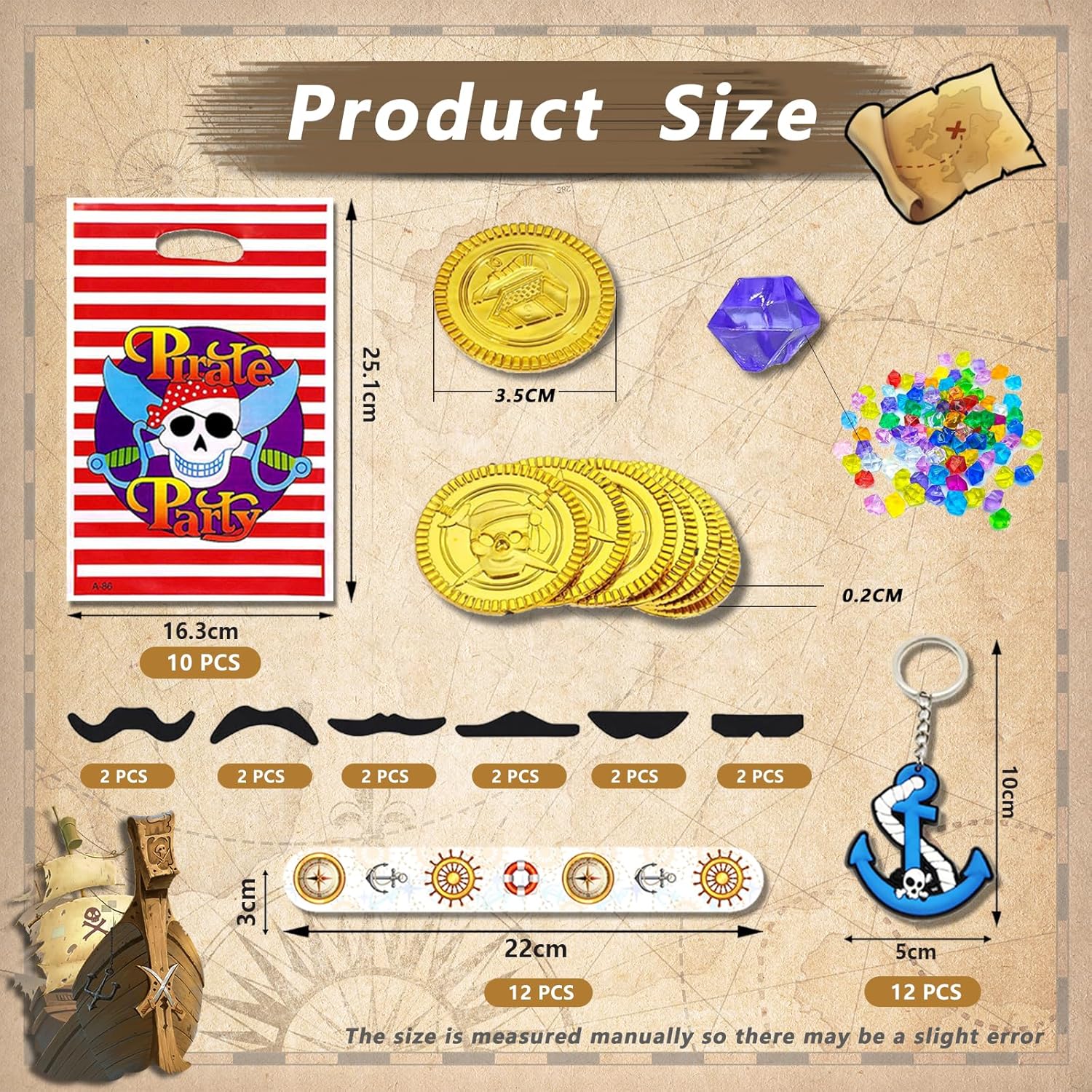 【Set di 146 regali per feste pirate】 50 monete d'oro pirati, 50 pietre per pirati, 12 portachiavi pirati, 10 sacchetti regalo pirati, 12 braccialetti pirati e 12 baffi pirati. Puoi organizzare una grande festa di compleanno dei pirati, la quantità è sufficiente per decorare la festa di compleanno del tuo bambino, in modo che il tuo bambino possa godersi una meravigliosa festa pirata con gli amici 【Alta qualità】 questo giocattolo pirata è realizzato con materiali di alta qualità, non tossico e non irrita la pelle o qualsiasi altra cosa. Lasciate che ogni bambino che partecipa alla festa pirata abbia una ricca esperienza, che sarà sicuramente un successo per i bambini 【Compleanno per bambini con barbe artistiche dei pirati】 Questi articoli per feste sono pensati per i bambini che amano le avventure a vela. Abbiamo selezionato elementi pirati come navi pirata, mappe del tesoro, teschi e mappe del tesoro per stimolare l'immaginazione dei bambini e farli raccontare storie di avventura mentre giocano. Ognuno utilizza colori vivaci e motivi vivaci per garantire che attiri l'attenzione dei bambini e renda la loro festa più interessante e memorabile 【Comodo da indossare】accessori pirata per il compleanno dei bambini con uno spessore piacevole, sono morbidi e delicati sulla pelle e utilizzano elastici di alta qualità. Può essere indossato sia da adulti che da bambini, e non ci sono problemi con il disagio di indossare e dimensioni inadeguate 【Ampia applicazione】il set per feste pirata contiene molti elementi pirati ed è adatto per molte feste, come feste a tema pirata, feste di Natale, feste di Halloween. Può anche essere utilizzato per completare i giochi di ruolo dei pirati e godere di un'esperienza emozionante gioco di caccia al tesoro pirata