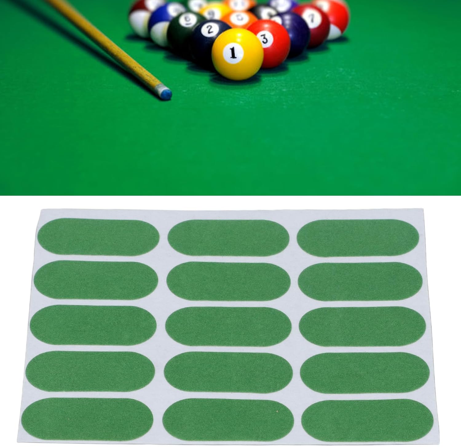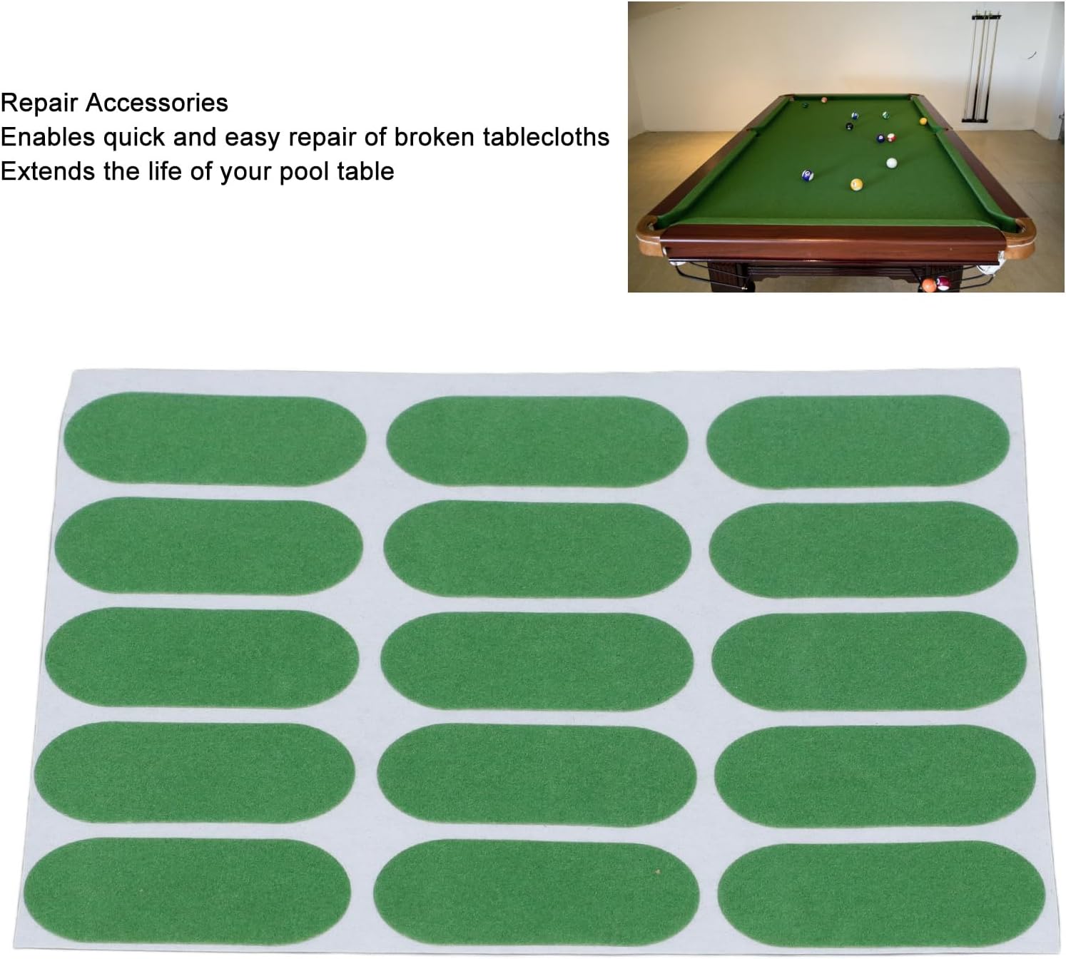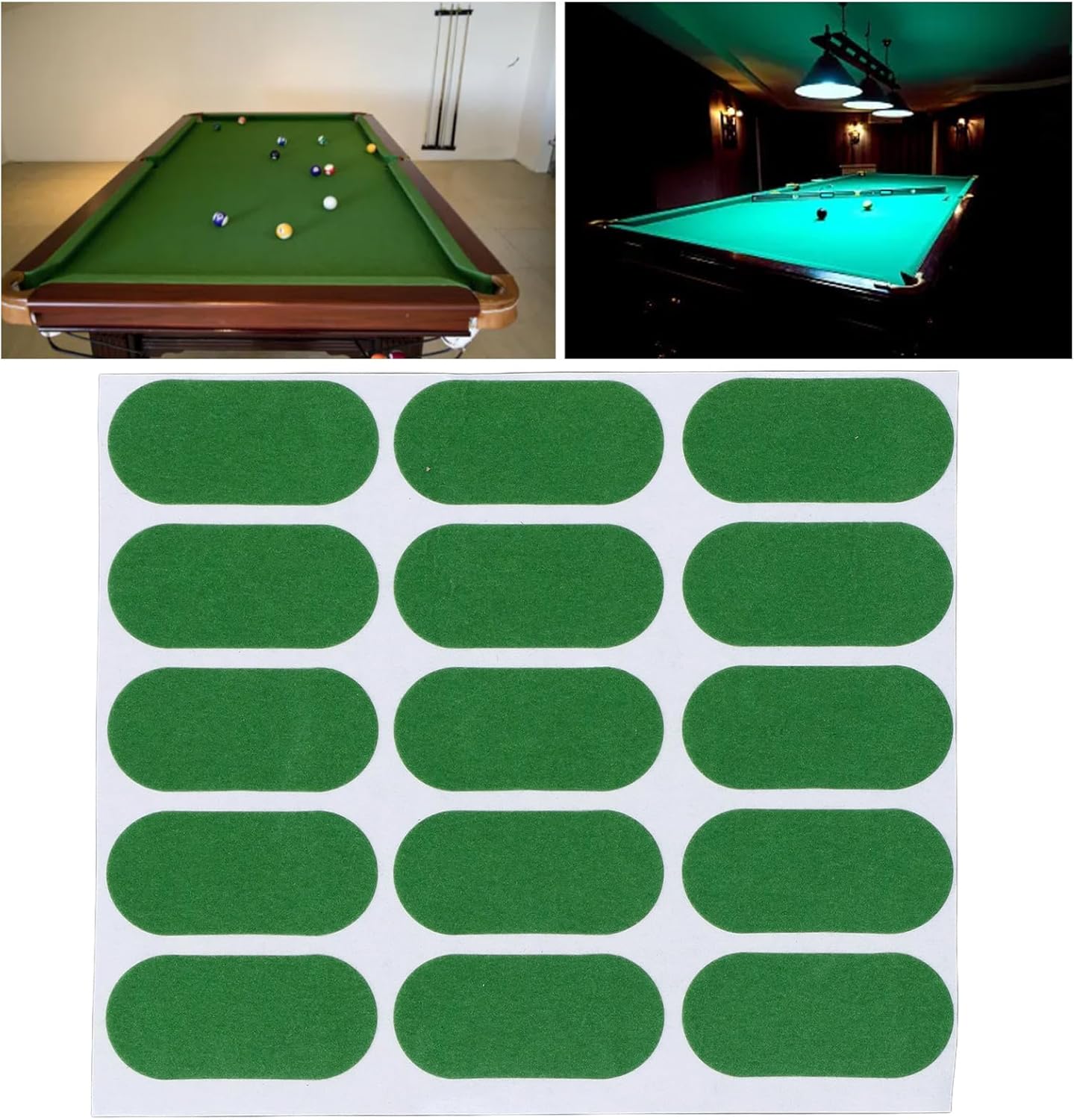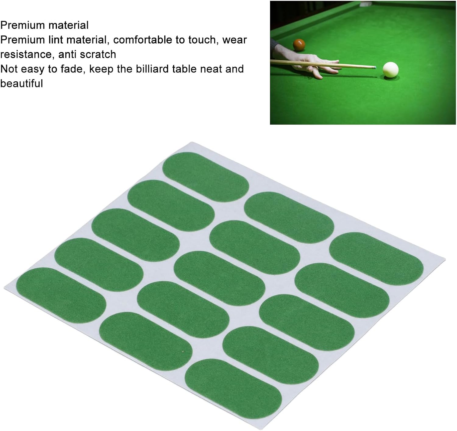 Accessori di riparazione: gli adesivi professionali da biliardo possono riparare rapidamente e facilmente le tovaglie rotte e prolungare la durata del tavolo da biliardo. Design adesivo durevole: la tovaglia professionale da snooker -Mending è facile da usare, premere e il design adesivo permanente lo rende appiccicoso. Compatto e : la toppa professionale per la riparazione della tovaglia è compatta e non occupa troppo spazio, comoda principalmente per la conservazione quotidiana. Materiale premium: la toppa di riparazione della tovaglia da biliardo è realizzata in materiale di lanugine di alta qualità, comoda da toccare, da indossare, resistente ai graffi, non sbiadisce facilmente, mantiene il tavolo da biliardo ordinato e bello. Design unico: gli adesivi da biliardo hanno un design luminoso e colorato, che li rende visibili sul tavolo da biliardo e si abbinano al colore del telo da biliardo, creando un eccellente effetto visivo.