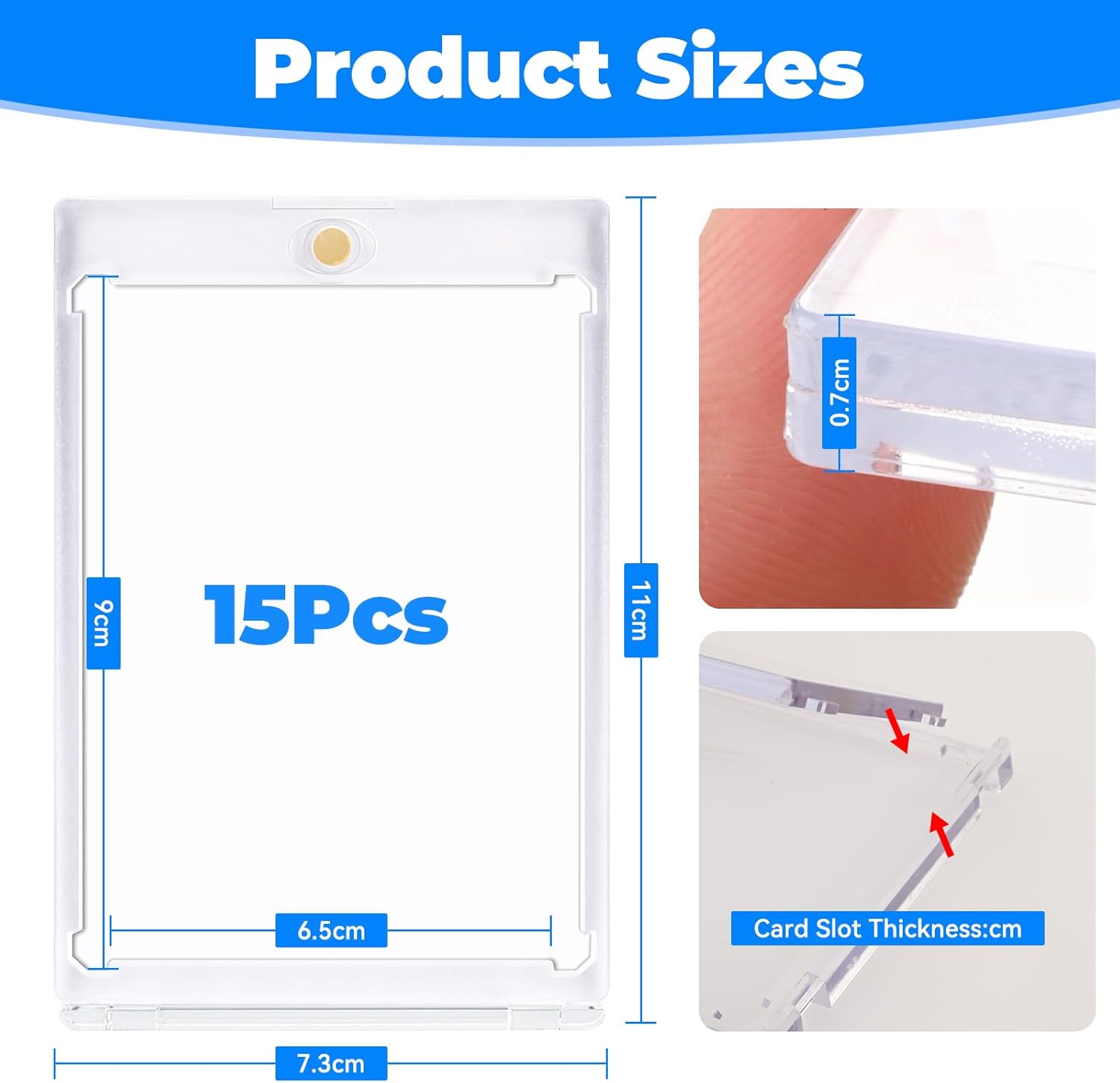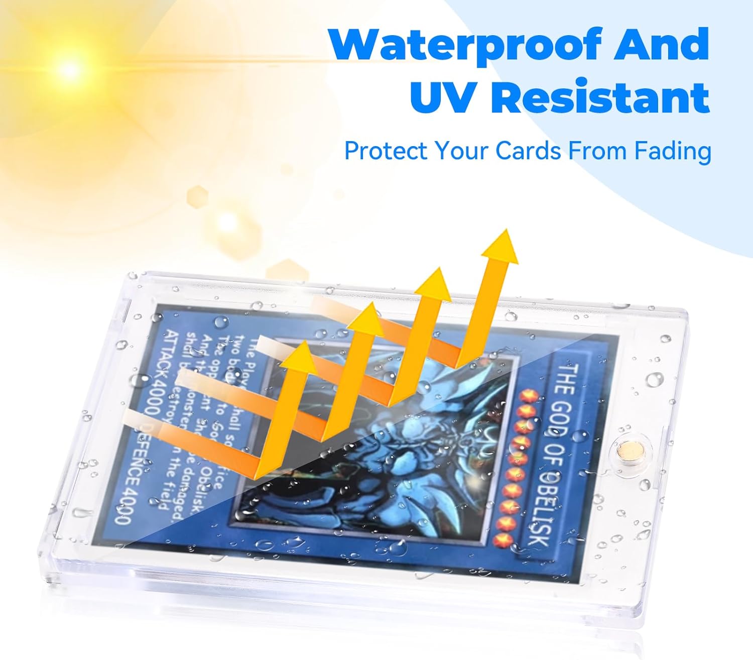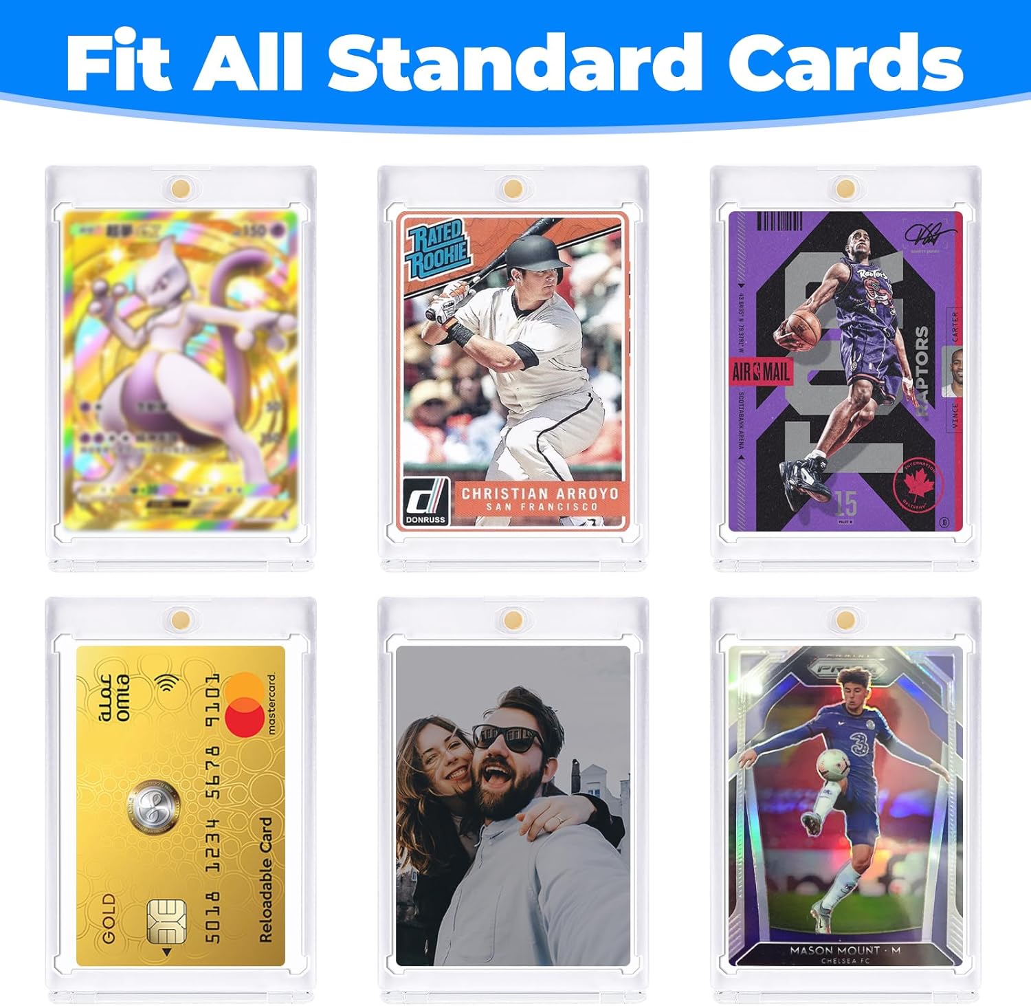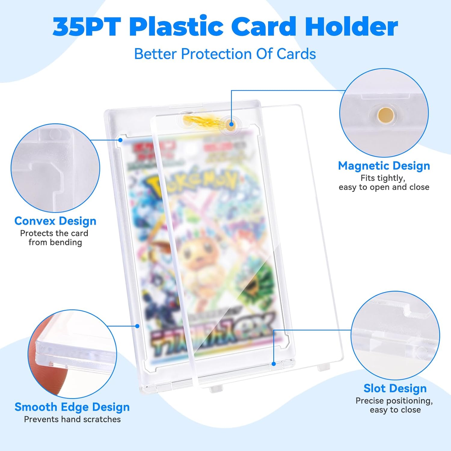 Dimensioni Adattabili: Le dimensioni interne del porta carte pokemon sono adatte a carte collezionabili sportive e da gioco standard da 2,5 pollici * 3,5 pollici, con una vestibilità precisa e un posizionamento senza problemi Design di Apertura e Chiusura: Il bustine per carte pokemon adotta un'apertura e una chiusura magnetica, che si adatta perfettamente. Lo slot è raffinato, il posizionamento è preciso, l'apertura e la chiusura sono facili e comode da usare Materiale di Alta Qualità: Il bustine trasparenti carte pokemon è supportato da plastica di alta qualità e ha una forte resistenza. È splash -of, antipolvere e resistente ai raggi UV per prevenire lo scolorimento. Le protezioni angolari a forma di diamante impediscono ai quattro angoli della carta di piegarsi Protezione Visiva: Entrambi i lati del bustine per carte trasparenti sono completamente trasparenti, mostrando l'aspetto originale della carta e non lasciano impronte digitali. Non solo protegge adeguatamente, ma anche valorizza la carta in qualsiasi momento Ampia Applicazione: Il compatibile con una varietà di carte come TCG, MTG e Carte da gioco. È un regalo di compleanno e di Natale per bambini e collezionisti