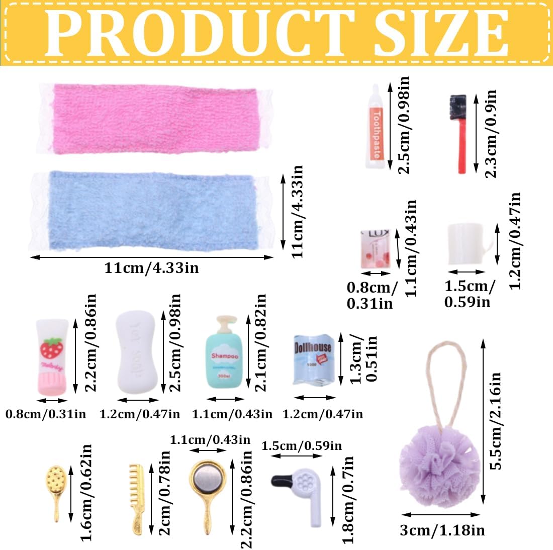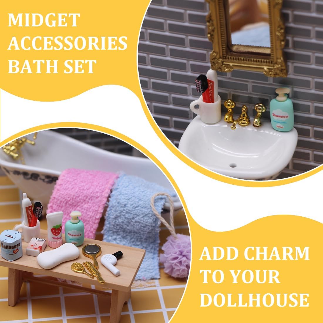 Accessori per Gnomi Set da Bagno per Case Delle Bambole:Accessori Gnome World ben progettati per bambini, mini set da 17 pezzi (1* asciugamano rosa, 1* asciugamano blu, 1*spazzolino da denti, 1**dentifricio, 1 * tazza per collutorio, 1 * palla doccia,1*asciugacapelli,1*specchio, 1*gel doccia, 1*detergente viso, 2 pettine, 2* sapone), lascia che i bambini esplorino il divertimento quotidiano del bagno. Design Raffinato:Questo set da bagno non è solo un giocattolo, ma anche un artefatto che stimola la creatività dei bambini. Progetta e decora il tuo bagno dei nani insieme ai tuoi bambini. In questo modo ogni momento di gioco diventa un'avventura unica e si stimolano la manualità e l'immaginazione spaziale dei vostri bambini. Forte Atmosfera Festosa:Come una bellissima aggiunta alla porta dello gnomo e allo spazio circostante, questo set con la sua decorazione in miniatura e delicata evidenzia facilmente la bellezza generale della scena, sia per Natale che per la vita di tutti i giorni la tua capanna degli gnomi Lascia che le storie magiche si svolgano in qualsiasi momento. Expérience Exquise:Il set contiene appositamente le necessità quotidiane come mini pettini, specchi, dentifricio e spazzolini da denti, che non solo riproducono delicatamente i dettagli della vita quotidiana del nano, ma permettono anche ai bambini di avvicinarsi ai personaggi durante il gioco, ma è anche divertente, aiuta i bambini a sviluppare buone abitudini di igiene personale e aggiunge realismo e divertimento ad ogni avventura nel bagno dei nani. Scelta Regalo Ideale per Molte Occasioni: Che si tratti di una festa dei bambini, di un regalo di Natale o di una sorpresa per la famiglia, i bambini e gli amici, questo accessorio per la casa delle bambole è la scelta perfetta. Non solo arricchisce la casa delle bambole o il set di Barbie di tuo figlio, ma stimola anche l'immaginazione e porta divertimento e risate senza fine nella stanza del bambino.