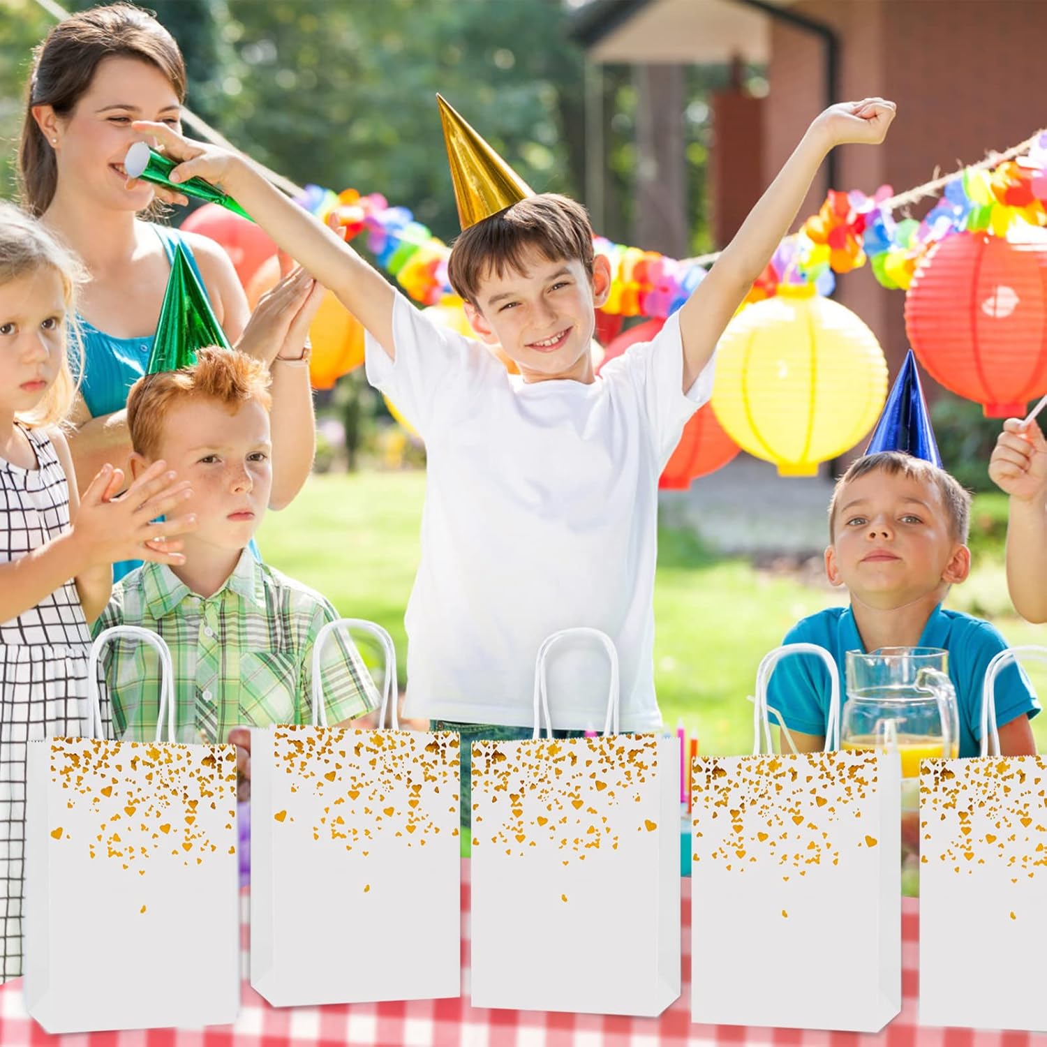 Design classico: i nostri sacchetti regalo sono stampati con molti accattivanti motivi a cuore dorato, sacchetti di carta belli e accattivanti, classici ed eleganti con maniglia superiore, che li rendono più comodi da trasportare. Materiale: i nostri sacchetti regalo in carta, robusti e durevoli, pieghevoli e riutilizzabili. Dimensioni: il sacchetto regalo misura 15 x 8 x 21 cm e può contenere una varietà di piccoli oggetti come snack, caramelle, biscotti, telefoni cellulari, giocattoli e così via. Quantità sufficiente: la nostra confezione contiene 15 sacchetti regalo con motivo a cuore, questa quantità è sufficiente per soddisfare le diverse esigenze della vita quotidiana o delle diverse feste. Ampio utilizzo: questi pratici e raffinati sacchetti di carta possono essere utilizzati per compleanni, matrimoni, lauree, Halloween, Natale o altre occasioni, possono essere utilizzati per confezionare regali per familiari, amici, colleghi, esprimere i tuoi migliori auguri.