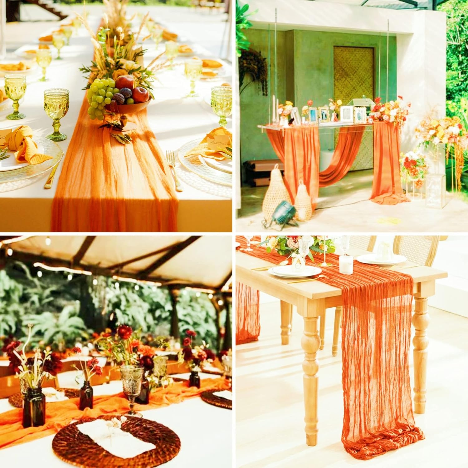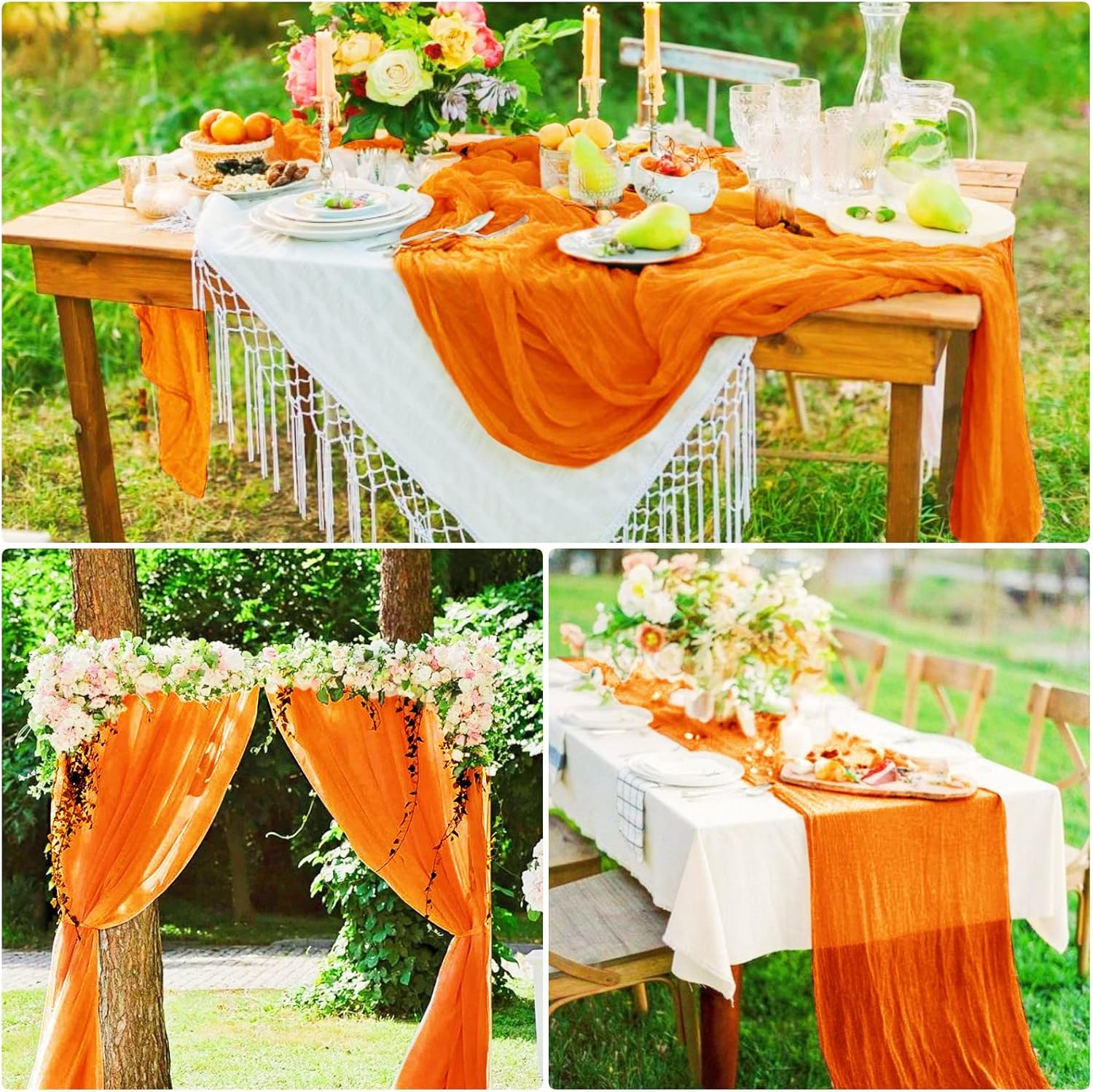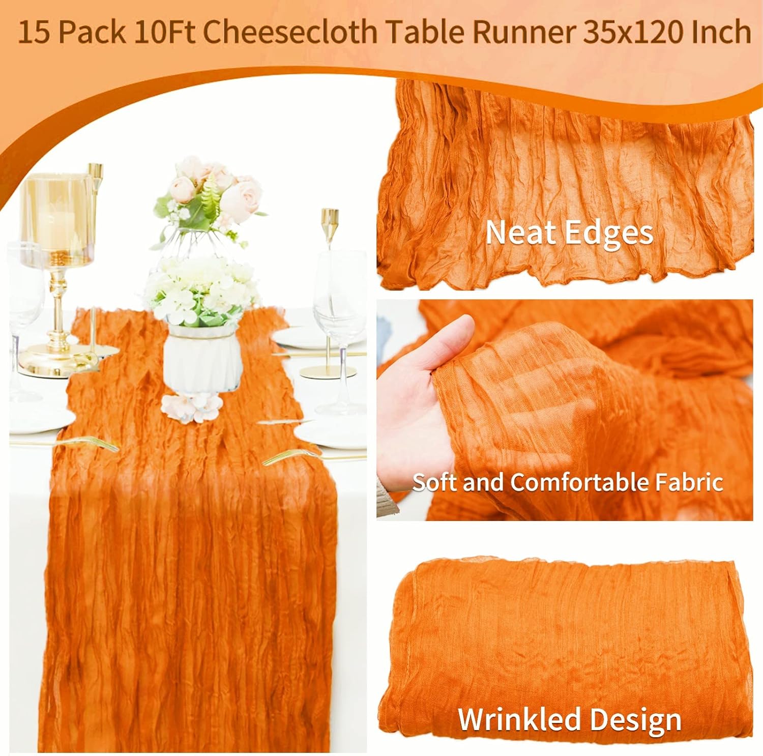 Quantità e dimensioni: riceverai 15 runner da tavola lunghi in garza arancione, sufficienti per i tuoi banchetti nuziali e per l'uso quotidiano o in sostituzione. Le dimensioni di questo runner da tavolo rustico in garza sono circa 89 cm di larghezza e 3 m di lunghezza, abbastanza grande da coprire un tavolo rettangolare o tavoli rotondi per 8-10 persone. 3 m è la lunghezza ideale per la decorazione della tavola della tua festa. I runner da tavolo in garza di formaggio possono anche essere uniti insieme per tavoli più lunghi. Materiali di alta qualità: il nostro runner da tavolo per matrimoni boho è realizzato in delicata garza di cotone, tessuto morbido di alta qualità, robusto e affidabile, leggero e delicato sulla pelle. La decorazione della tavola è morbida, liscia e confortevole al tatto. Con un processo di alto livello e tutti i bordi di questi romantici runner da tavolo sono ben realizzati, bordi puliti con un aspetto pulito, che li rende robusti e riutilizzabili, non facili da indossare o strappare, rimangono in buone condizioni per lungo tempo. Runner da tavolo rustico: il runner da tavolo color crema ha un design senza cuciture e stropicciato, pregevole fattura, che lo rende non solo morbido ma fluido. Con il runner da tavolo in garza in stile boho country, la tua festa può facilmente presentare un aspetto rustico ed elegante e un romantico tocco boho. Puoi legare il romantico runner da tavolo o lasciarlo scorrere liberamente sul pavimento. I runner da tavola vintage per matrimonio stupiranno i tuoi ospiti e aggiungeranno un tocco elegante alla tua festa. La morbida biancheria da tavola è traslucida, a goccia naturale. MULTIUSO - I runner multifunzionali in garza sono perfetti per vari eventi, come matrimoni, ricevimenti, banchetti, feste di compleanno, addio al nubilato e baby shower, tavoli degli innamorati, cerimonie di fidanzamento, cene, buffet di caramelle, tavoli da dessert, archi nuziali, celebrazioni, cerimonie, feste a tema, Natale, San Valentino, Pasqua, Ringraziamento e molte altre occasioni speciali. Questi lunghi corridori di garza mostrano un'atmosfera romantica e permettono a te e ai tuoi amici di godervi abbastanza la festa. Facile da pulire e mantenere: il runner da tavolo in stile rustico è facile da pulire e durevole. Per garantire che il grazioso runner da tavolo rimanga a lungo in buone condizioni, lavabile in lavatrice in un sacchetto per la biancheria o a mano in acqua fredda con un detersivo delicato. Per mantenere il bellissimo design spiegazzato, non stirare né utilizzare acqua calda. Stendere e lasciare asciugare all'aria. Se per qualsiasi motivo non sei soddisfatto di questo runner da tavolo in chiffon di garza, comunicacelo, faremo del nostro meglio per aiutarti!