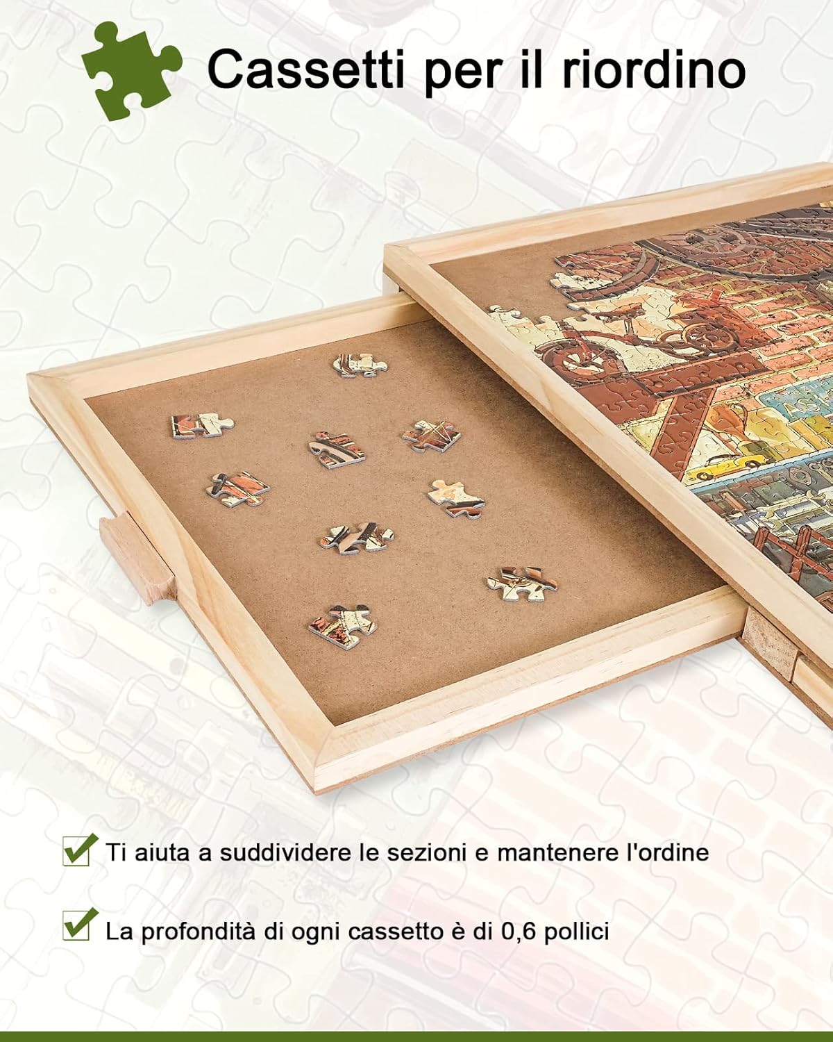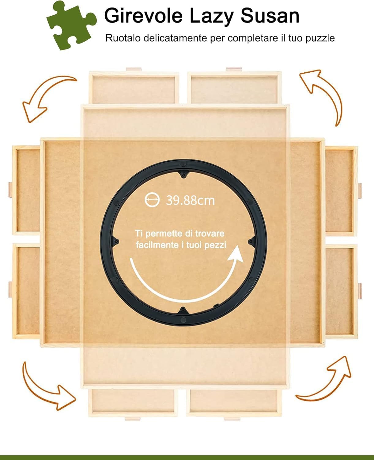 Tavola puzzle di alta qualità: i nostri 1500 pezzi per la conservazione di puzzle sono realizzati in legno duro sostenibile di alta qualità e buona lavorazione, il materiale durevole garantisce un uso di lunga durata, che mira a offrire il miglior tavolo puzzle per tutti coloro che amano i puzzle come lo facciamo. La superficie liscia e antiscivolo offre una meravigliosa superficie per assemblare i tuoi puzzle preferiti con i tuoi amici o familiari. Puzzle facile da riporre e da trasportare: facile da sollevare, leggero ed equilibrato per una rapida conservazione. È possibile posizionare il tavolo puzzle su qualsiasi superficie, piani di lavoro, tavolini da caffè, coperte da spiaggia o anche il pavimento. Se avete bisogno di un ulteriore spazio per la seduta o la sala da pranzo, basta coprire il puzzle con la copertura del puzzle, chiudere i cassetti e spostarlo sotto un divano o un letto può essere riposto in modo sicuro e sicuro. possono essere facilmente conservati in un pochi secondi. Design Spinning Lazy Susan: un modo piacevole ed efficiente per comporre i vostri puzzle con il nostro tavolo a puzzle girevole. Trova i tuoi pezzi con facilità, raggiungi ogni sezione di cui hai bisogno, Lazy Susan sotto crea un meraviglioso sistema di rotazione a 360 per una rotazione liscia e uniforme, interazione puzzle tripla e divertente e stimolazione strategica. 4 cassetti e copertura protettiva: 4 cassetti scorrevoli consentono di ordinare i pezzi in base al colore, al tema o al bordo. Ogni cassetto è appositamente progettato con maniglia per garantire che tutti i cassetti siano facili da aprire quando vengono utilizzati, tengono al sicuro i pezzi fuori dalla mancanza. Dotato di una copertura trasparente per proteggere bene il vostro capolavoro da polvere, acqua e il vostro curioso Dr.Cat, fino alla prossima volta che si desidera continuare. Regalo ideale per gli appassionati di puzzle: un regalo di compleanno o di vacanza perfetto per adolescenti, anziani o tutti coloro che amano i puzzle, promuovono la qualità dell'interazione e la stimolazione strategica mentre componi i tuoi puzzle preferiti. Se lo smistamento prima di risolvere è il tuo piacere colpevole, non stress. Aggiungete oggi un puzzle spinner nel vostro carrello! Tradotto con .DeepL/Translator (versione gratuita)