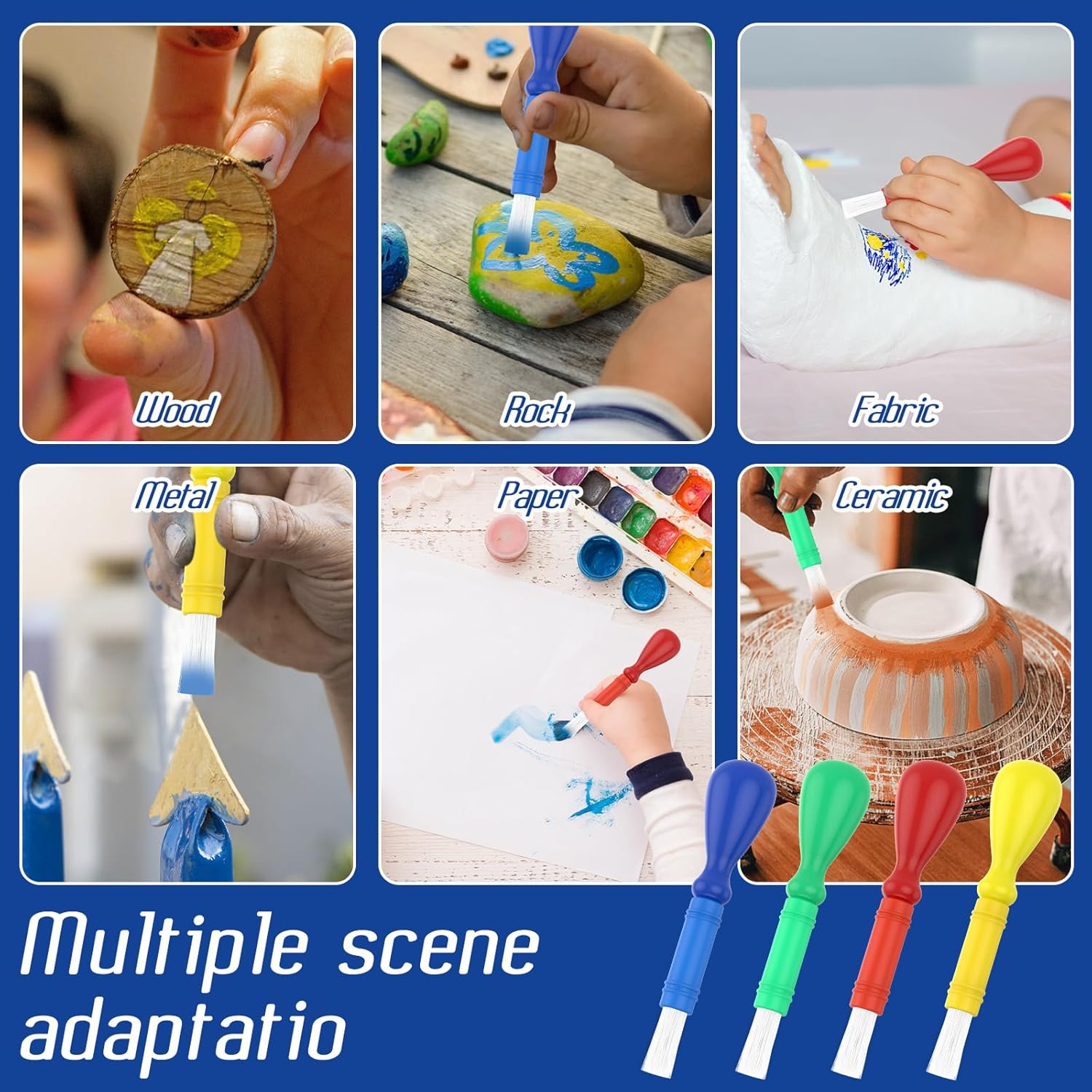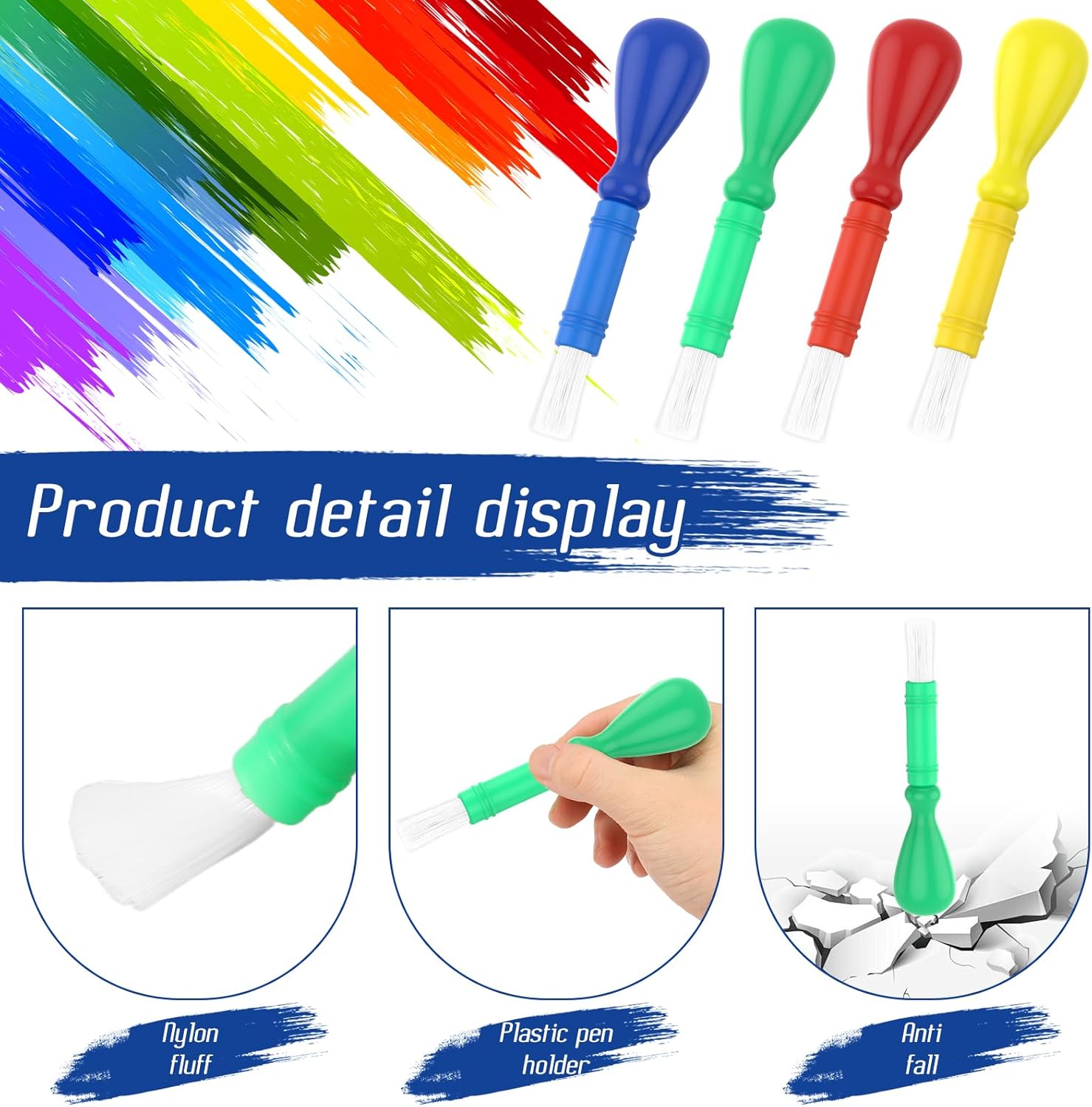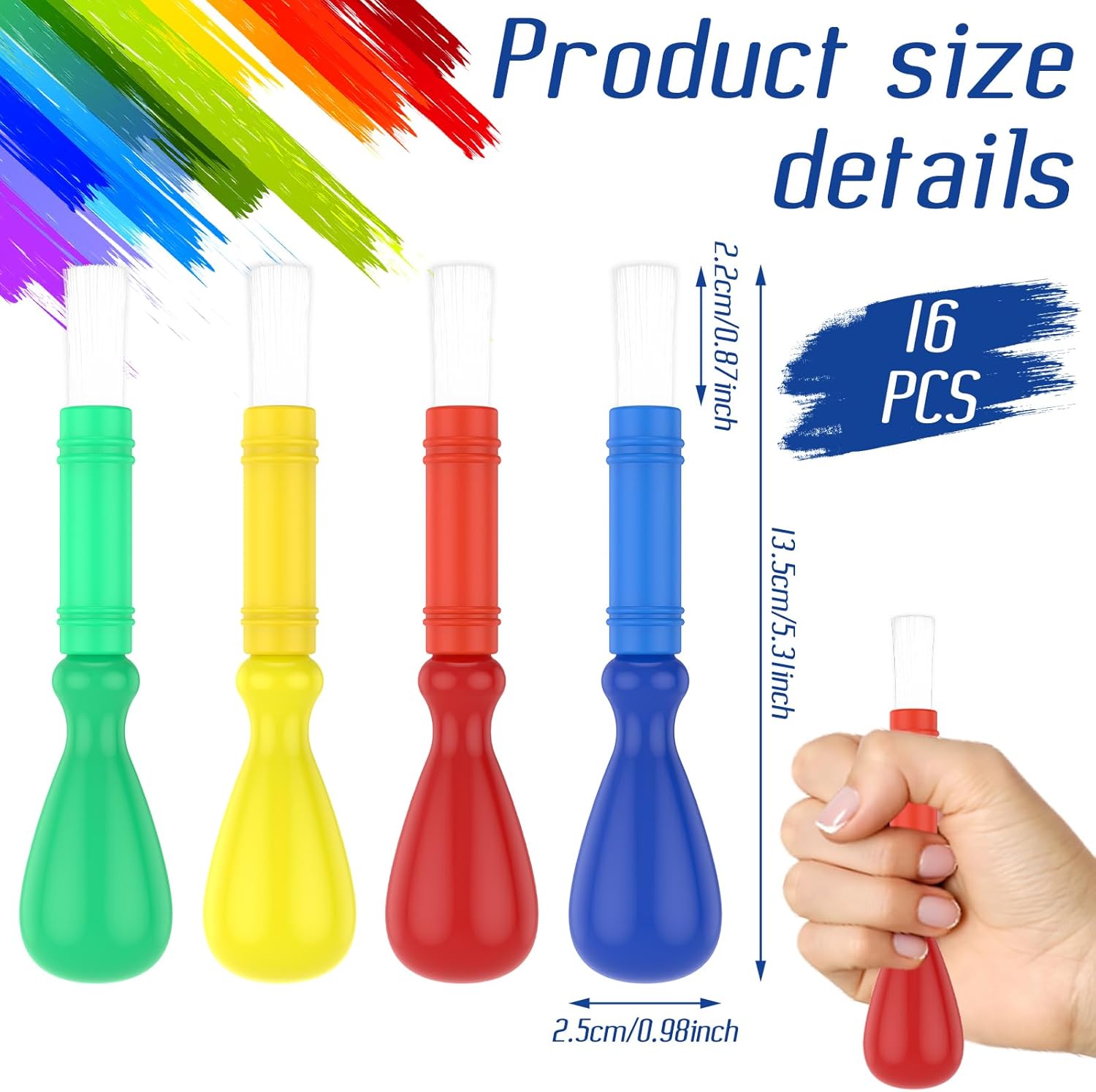 Bastone di plastica: questo pennello da pittura per bambini utilizza un bastone di plastica, il manico è adatto per le mani dei bambini, antiurto e durevole, non stanco quando si tiene a lungo, preserva l'entusiasmo del bambino per ogni creazione. Set di valori: questo set di pennelli per bambini include 16 pennelli multicolori (blu, giallo, rosso, verde) per soddisfare le esigenze di acquerelli, guazzi, acrilici e altri pigmenti. Multiuso: questo set di pennelli può essere utilizzato con diversi colori, adatto per carta, tela, gesso, ceramica e altre superfici, sia genitori che bambini scarabocchiano a casa, lezioni di arte a scuola o decorazioni fatte a mano alle feste, facile da maneggiare in modo che il bambino possa sviluppare la sua creatività sempre e ovunque. Facile da pulire: questo pennello per pittura prescolare può essere risciacquato con acqua dopo l'uso per pulire come nuovo, si asciuga rapidamente senza lasciare residui e può essere riutilizzato la prossima volta. Setole morbide in nylon: questo pennello da pittura per bambini è dotato di setole in nylon, morbido e resistente, non facile da cadere e spaccare, tocca facilmente la carta, la tela, il gesso e altre texture, levigando senza graffi.