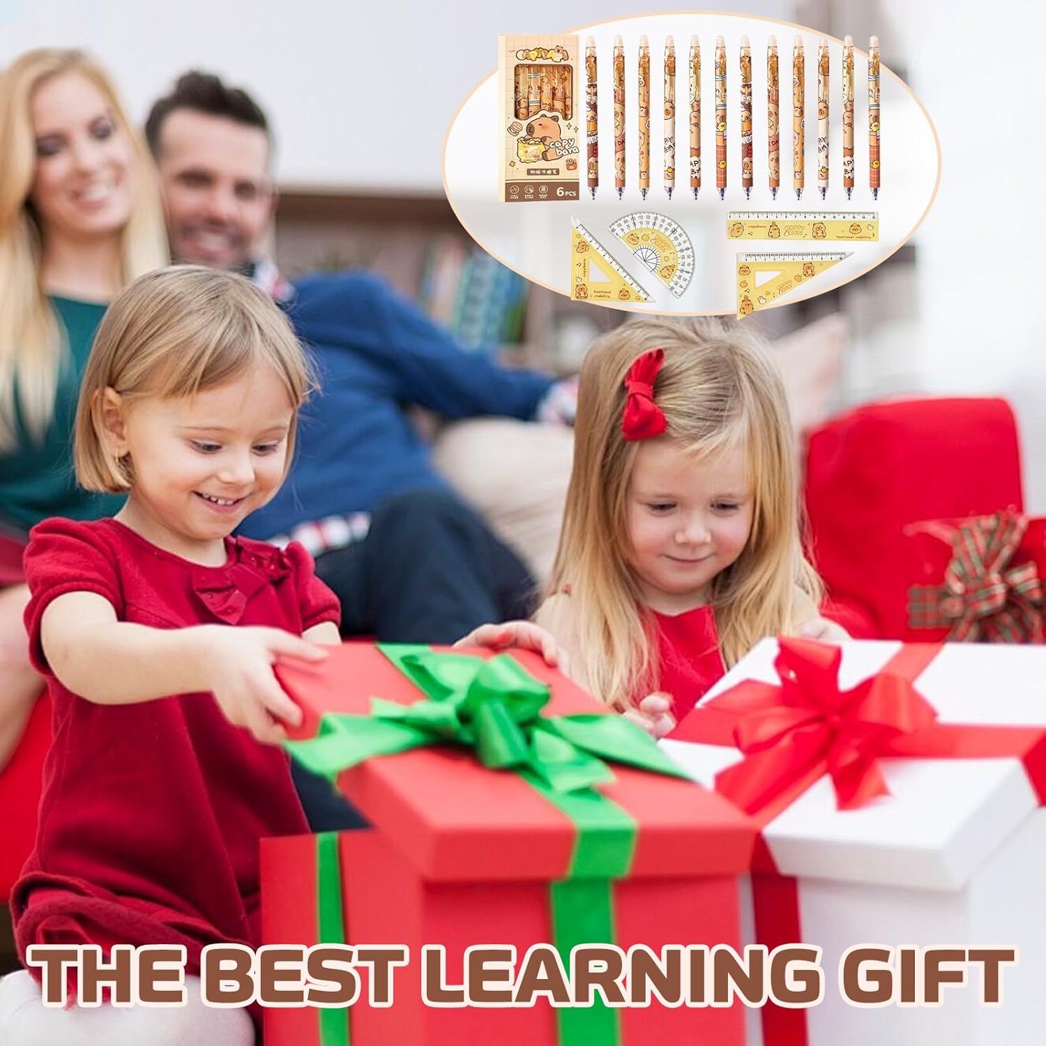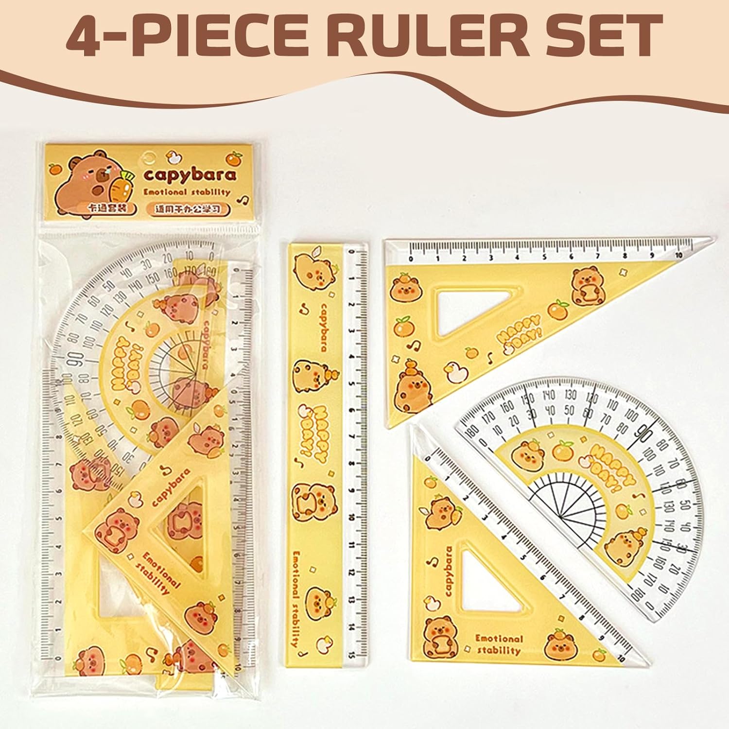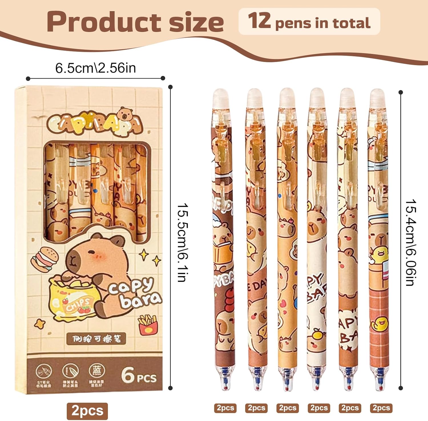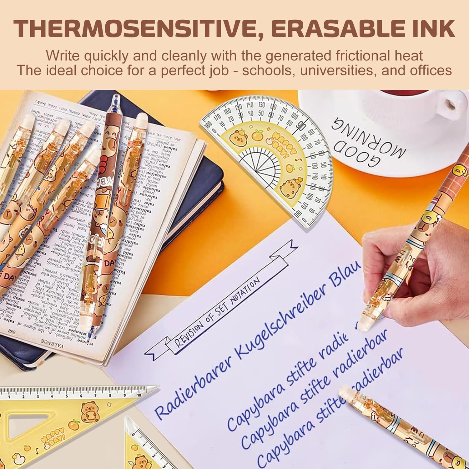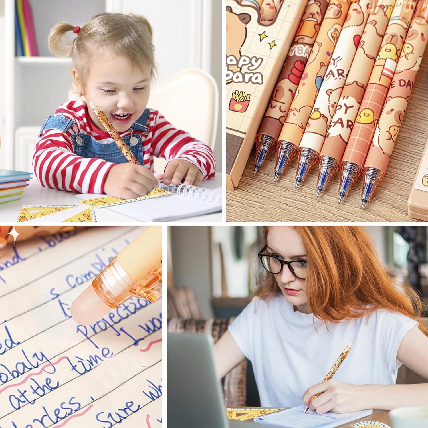 Materiali di alta qualità: Queste Set di Penne Creative Capybara sono realizzate in materiale plastico e contengono 6 penne con diversi simpatici motivi raffiguranti i cartoni animati di capibara. Il simpatico set di righelli per capibara è realizzato in resistente materiale PP, perfetto per ragazzi e ragazze Una penna che scrive fluidamente: Ogni Capybara Penna Cancellabile contiene una mina da 0,5 mm che scrive in modo fluido e chiaro, regalandoti un'esperienza di scrittura senza sforzi. L'inchiostro ad asciugatura rapida si asciuga all'istante e non sbava, mantenendo il tuo libro o disegno pulito e ordinato Penna gel cancellabile: Ogni Penna Capibara Carina è dotata di una gomma sulla parte superiore; puoi usare la gomma superiore come una matita per cancellare gli errori senza lasciare residui e senza danneggiare i tuoi documenti. Fai scorrere la clip da tasca verso il basso per scrivere Set di cancelleria pratico: Queste Penne Gel Capybara soddisfano le tue esigenze quotidiane di scrittura, marcatura e firma. Dotato di righello e squadra con scale metriche e goniometro da 0 a 180 gradi, puoi disegnare facilmente e con precisione linee rette e angoli Regali creativi: Caratterizzato da un adorabile disegno di un capibara, questo set di cancelleria Capybara è l'aggiunta perfetta a qualsiasi collezione di cancelleria. Perfette per la scuola, casa, ufficio, eventi, regali di festa e attività organizzative. Sono ottimi regali di compleanno, per ufficio o studenti, insegnanti, amici e colleghi