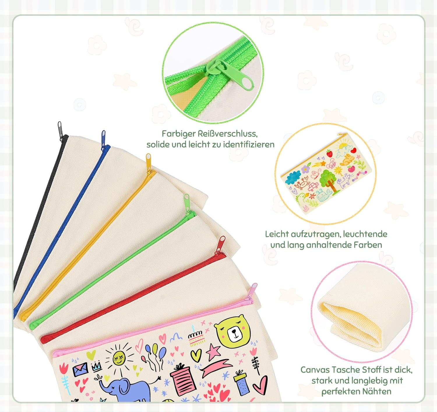 Progetto fai da te creativo: questi sacchetti in tessuto bianco offrono infinite possibilità di progettazione, stampa, pittura o ricamo per creare lavori artigianali unici. Sacchetto di stoffa da dipingere, perfetto per regali di compleanno o regali di Natale per la famiglia e gli amici. Il set da 16 pezzi consente attività di gruppo, ideali per compleanni o progetti scolastici. Dimensioni pratiche e versatilità: 16 tasche dipinte. Con 12 x 21 cm, la borsa è ideale per riporre cosmetici, gioielli, penne o monete. Grazie al suo formato compatto, si adatta facilmente in borse o bagagli. Astuccio da dipingere, perfetto per viaggiare o come soluzione organizzata per riporre piccoli oggetti nella vita di tutti i giorni. Materiale in tela di alta qualità: le borse da dipingere sono realizzate in tela robusta ma morbida, durevole e resistente agli strappi. La qualità resistente garantisce una lunga durata di utilizzo, mentre la comoda chiusura lampo facilita la maneggevolezza. Astuccio in tessuto da dipingere, ideale per un uso frequente, sia come astuccio o portagioie. Design intuitivo: ogni borsa dispone di una robusta cerniera che consente una chiusura sicura e un facile accesso. Le 6 varianti di colore (nero, blu, giallo, rosa, rosso, verde) aiutano a classificare, l'astuccio da dipingere perfetto per la scuola, i viaggi o l'ordine nel settore della bellezza. 【 Educativo prezioso per i bambini】Il set per bricolage stimola la creatività e le capacità motorie dei bambini. Dipingere il compleanno dei bambini, ideale per workshop di compleanno o progetti scolastici, dove i bambini possono creare le proprie tasche. L'opzione fai da te rende il prodotto un regalo significativo che unisce divertimento e apprendimento.