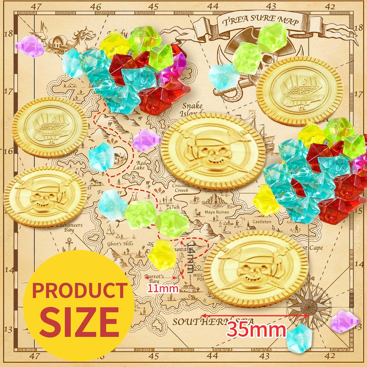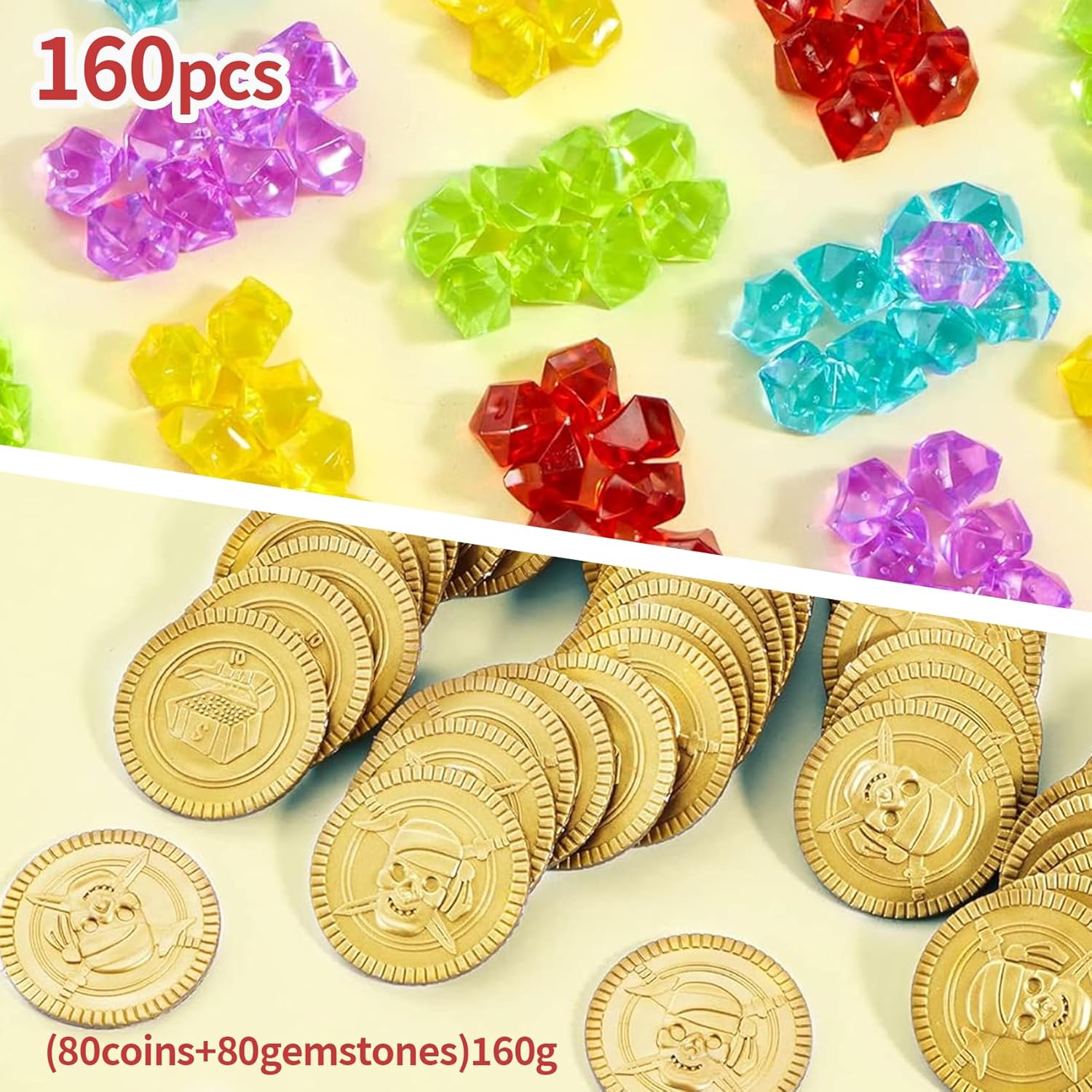 Set Completo per Avventure da Pirata: Riceverai 80 monete d'oro in plastica e 80 gemme acriliche colorate, per un totale di 160 pezzi. Ideale per creare una scena di caccia al tesoro autentica e coinvolgente durante feste e giochi a tema Materiale Solido e Dettagli Curati: Le monete sono realizzate in plastica resistente con effetto lucido dorato, mentre le gemme sono in acrilico brillante. Il tutto è progettato per resistere al gioco attivo dei più piccoli e per durare nel tempo Design Classico a Tema Pirata: Ogni moneta presenta motivi tipici dei pirati, mentre le gemme sono disponibili in vari colori vivaci. Insieme creano un'atmosfera ricca di avventura e immaginazione, perfetta per stimolare il gioco creativo Perfetto per Eventi e Feste a Tema: Ottimo per feste di compleanno, giochi di ruolo, cacce al tesoro, scenografie teatrali e decorazioni per eventi. Può anche essere utilizzato per riempire sacchettini regalo, pinata o cofanetti decorativi Multiuso e Idea Regalo Originale: Oltre al gioco, le monete e le gemme si prestano a decorazioni di casa, paesaggi per acquari, o attività scolastiche creative. Un'ottima scelta come sorpresa inaspettata o premio per bambini