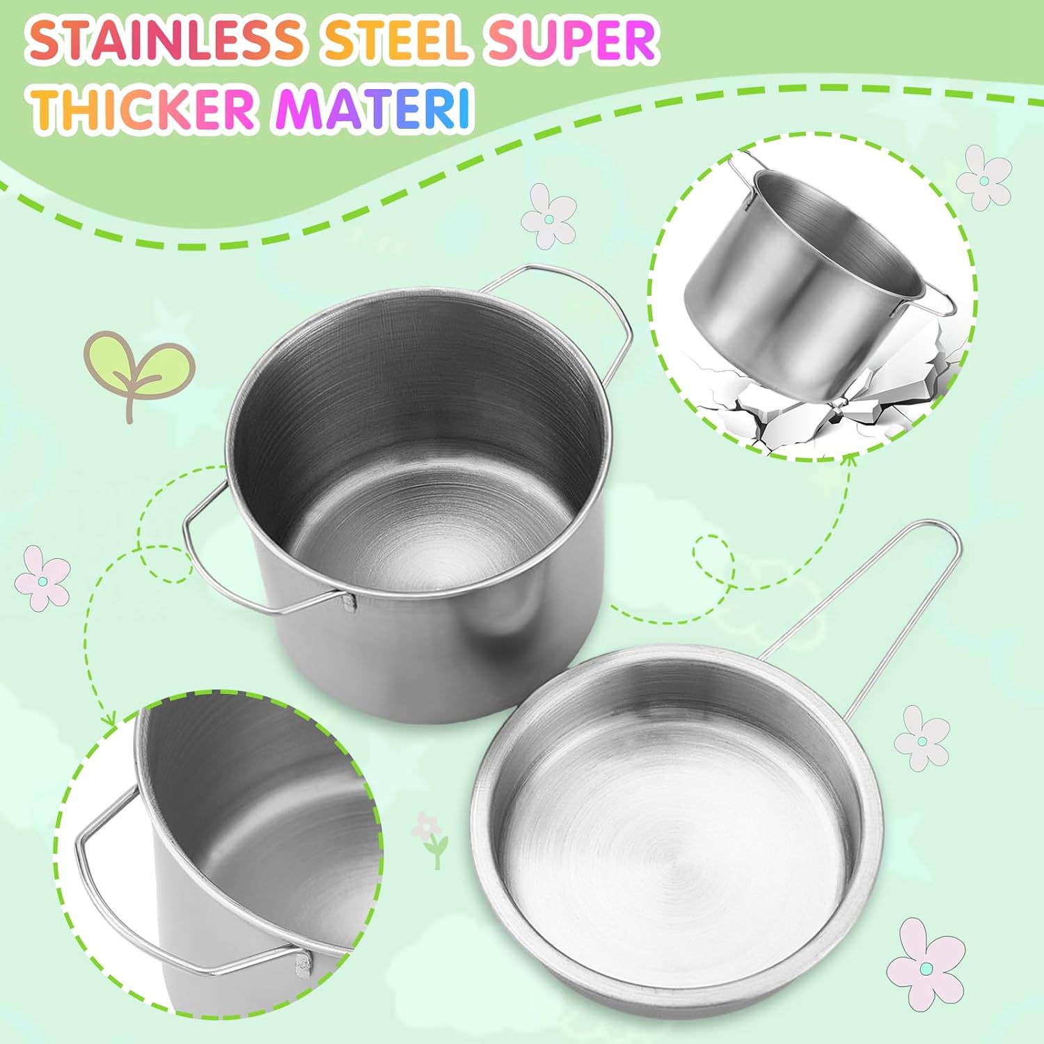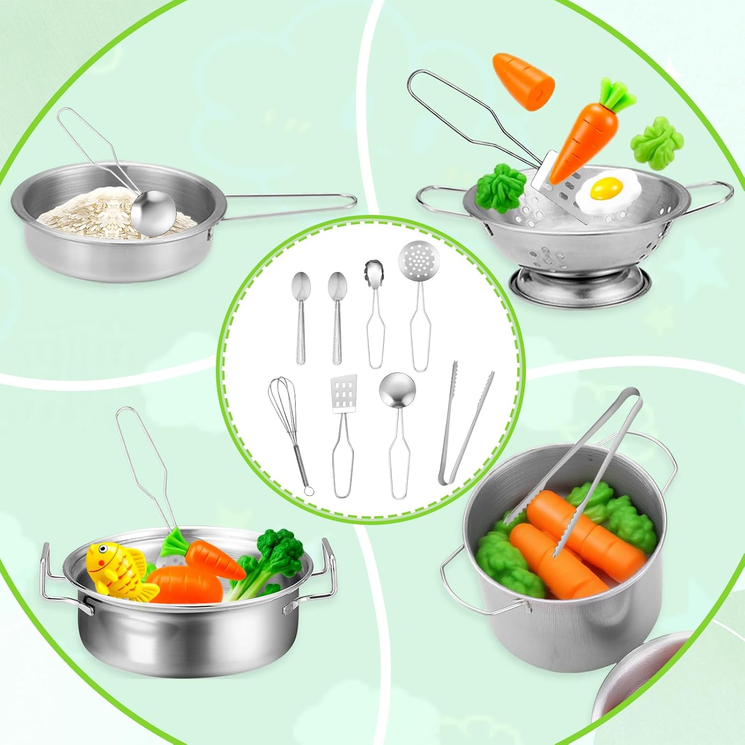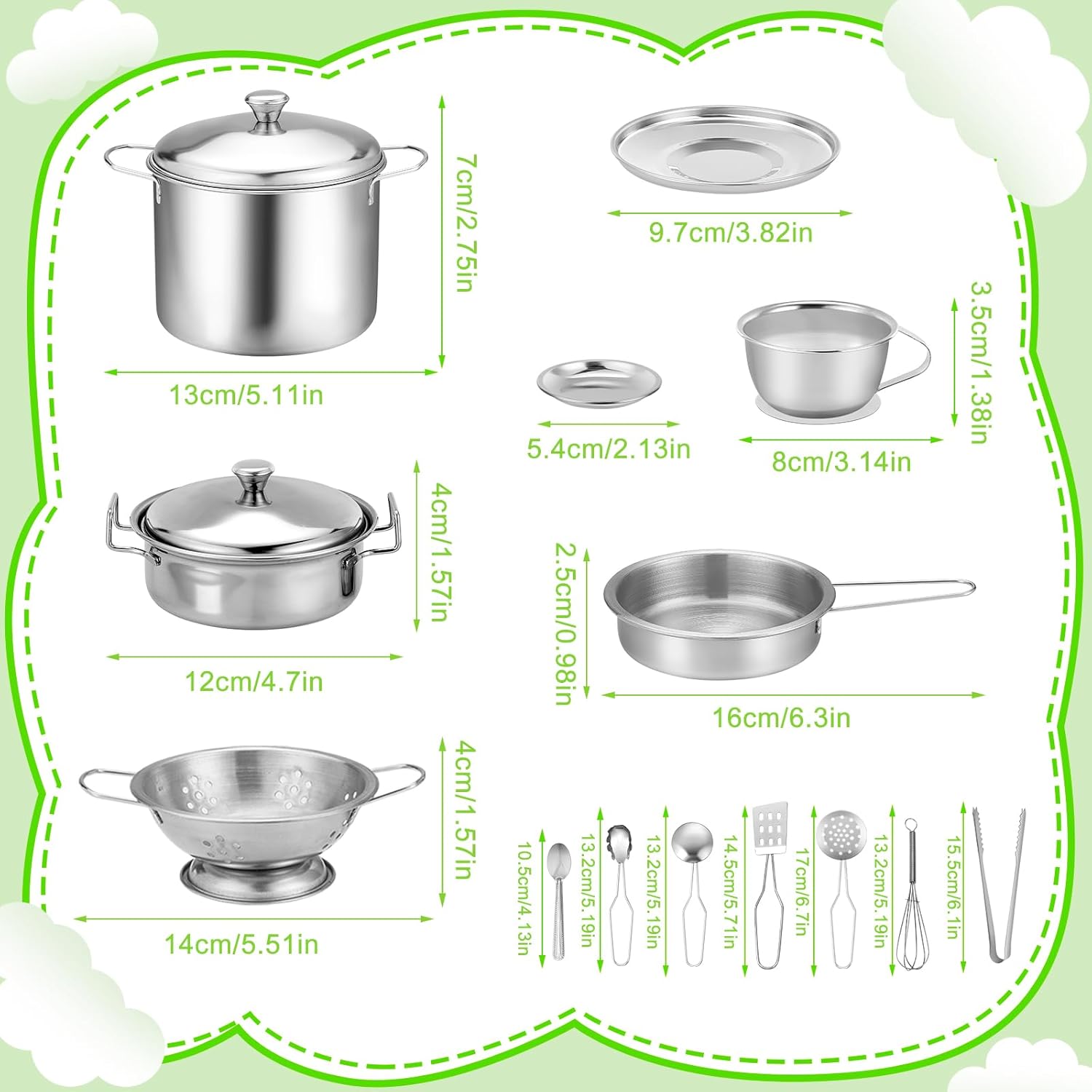 🎀【Confezione】Gli accessori da cucina Mud includono: 2 pentole per zuppa, 3 coperchi per pentole, 1 padella, 1 fruttiera, 1 tazza da caffè, 1 coperchio per caffè, 1 contenitore, 1 pinza per pane, 1 frusta, 1 spatola, 1 scolapasta, 1 cucchiaio da zuppa, 2 cucchiai rotondi e 1 spatola per friggere. I bambini possono cucinare in tutta tranquillità e divertirsi. 👍【Materiale】Questo accessorio da cucina per bambini è realizzato in acciaio inossidabile di alta qualità e plastica atossica, è facile da pulire, estremamente durevole e infrangibile. 👨🍳【Gioco di ruolo perfetto】Gli accessori da cucina per bambini ispirano i bambini ad assumere il ruolo di chef, soddisfacendo le esigenze di cucina e pasticceria dei bambini in età prescolare. Imparando i nomi dei diversi utensili da cucina, i bambini possono assumere il ruolo di chef e sviluppare abitudini culinarie e capacità di gioco fantasiose. 😍【Facile da riporre】Gli utensili da cucina per bambini non occupano spazio e possono essere riposti nell'apposito contenitore dopo l'uso, aiutando i bambini a sviluppare buone abitudini di conservazione fin dalla tenera età. 🎁【Scelta regalo ideale】Cucina da esterno in fango adatta ai bambini dai 3 anni in su per divertirsi insieme e diventare più attivi. Il regalo perfetto per compleanni, Pasqua, Ringraziamento, Natale e Capodanno!