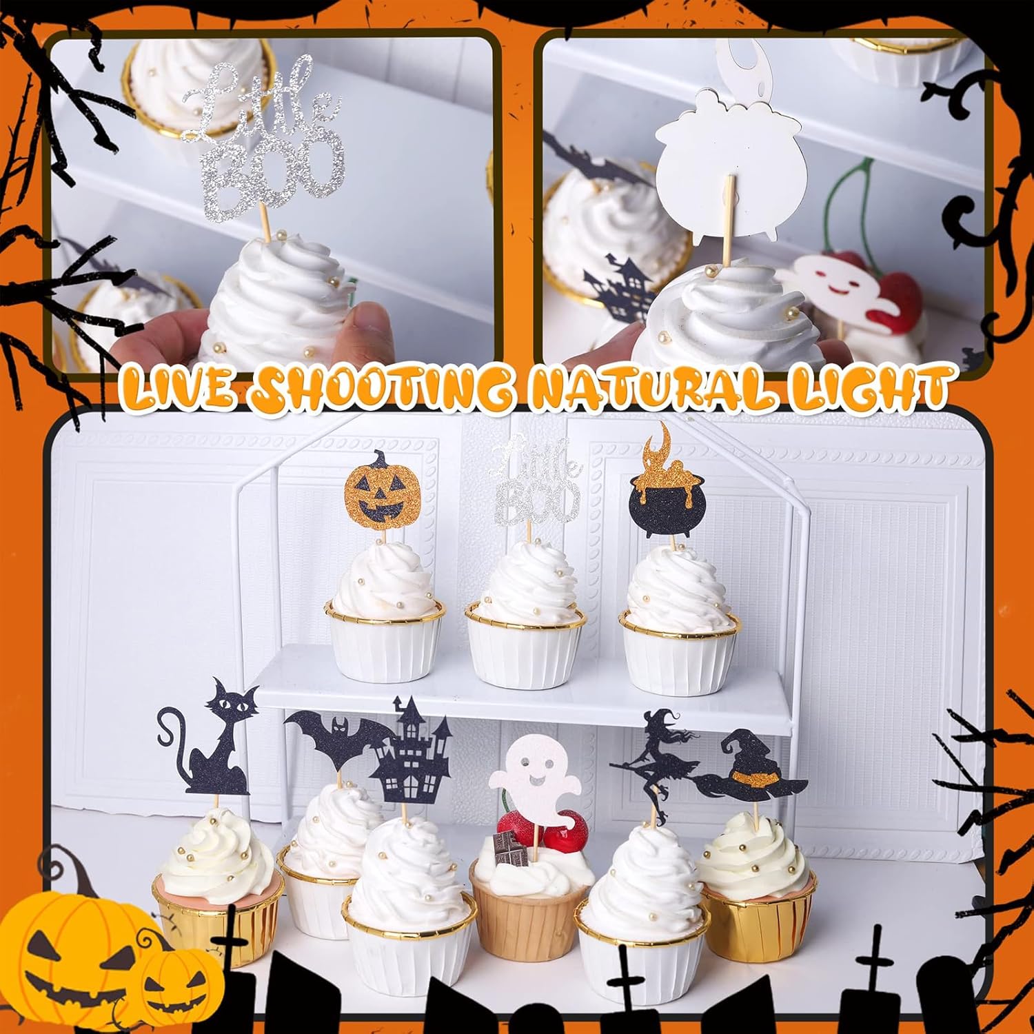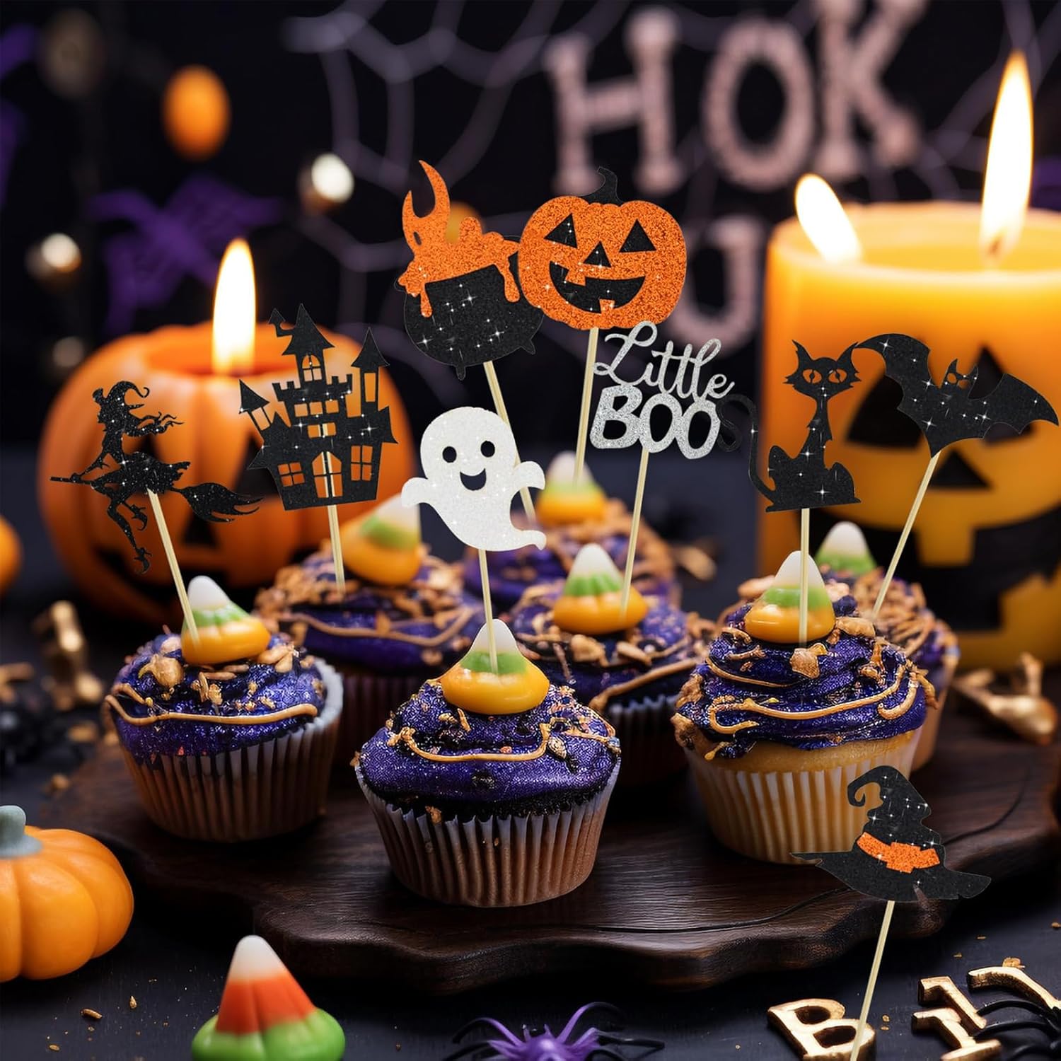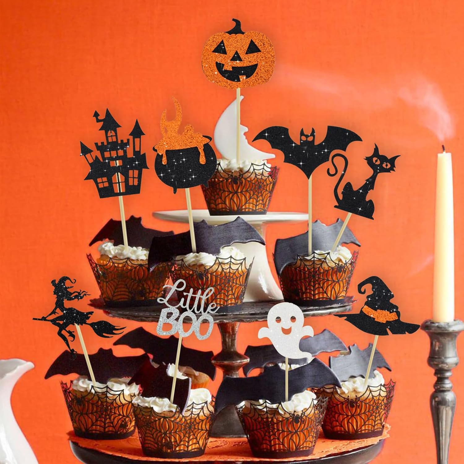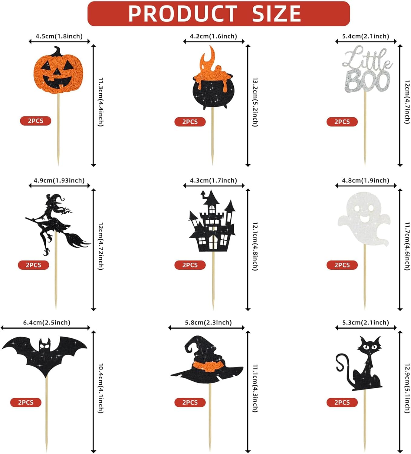 【18 decorazioni per torte di Halloween】Ci sono otto stili piccoli, due per ciascuno, e un grande, per un totale di 18 stili per soddisfare le tue diverse esigenze decorative. Puoi mostrare appieno la tua creatività sulla tua torta. 【Materiale di alta qualità】I nostri decorazioni per torte di Halloween sono realizzati in cartoncino spesso glitterato monofacciale di alta qualità e bastoncini di bambù per uso alimentare. Sono atossici, insapori, non facili da rompere e possono essere riutilizzati più volte dopo il lavaggio. 【Dimensioni appropriate】Ogni decorazione per muffin di Halloween è lunga circa 5-7 cm e la testa dello stuzzicadenti è abbastanza grande da contenere le dita. La parte appuntita dello stuzzicadenti è sottile e dura, permettendo di inserirla in torte e frutta dura. 【Decorazione per torte di Halloween con glitter】La decorazione per cupcake di Halloween è realizzata in nero e arancione brillante. Include decorazioni per Halloween, pipistrelli, ragni, zucche, gatti neri, streghe, fantasmi, castelli, ecc. Sono così belle e attraenti, creando un'atmosfera meravigliosa e sorprendente, perfette per decorazioni per feste di Halloween e feste di compleanno. 【Ampia applicazione】Decora le ciambelle e dai loro un tema di Halloween con queste decorazioni per torte di Halloween, adatte a una varietà di cibi, frutta e verdura, dolcetti, dessert, antipasti, formaggi, insalate e frutti di mare. Le decorazioni per torte di Halloween sono ottime anche per decorare torte, snack, panini e cocktail. (con bastoncino).