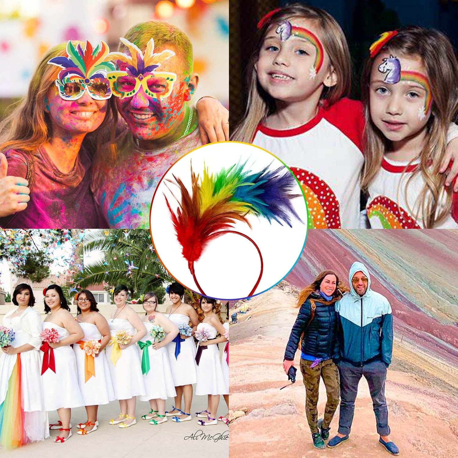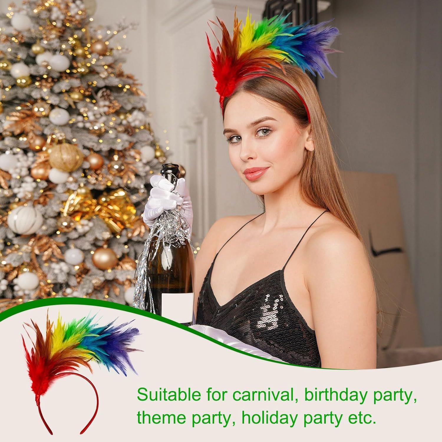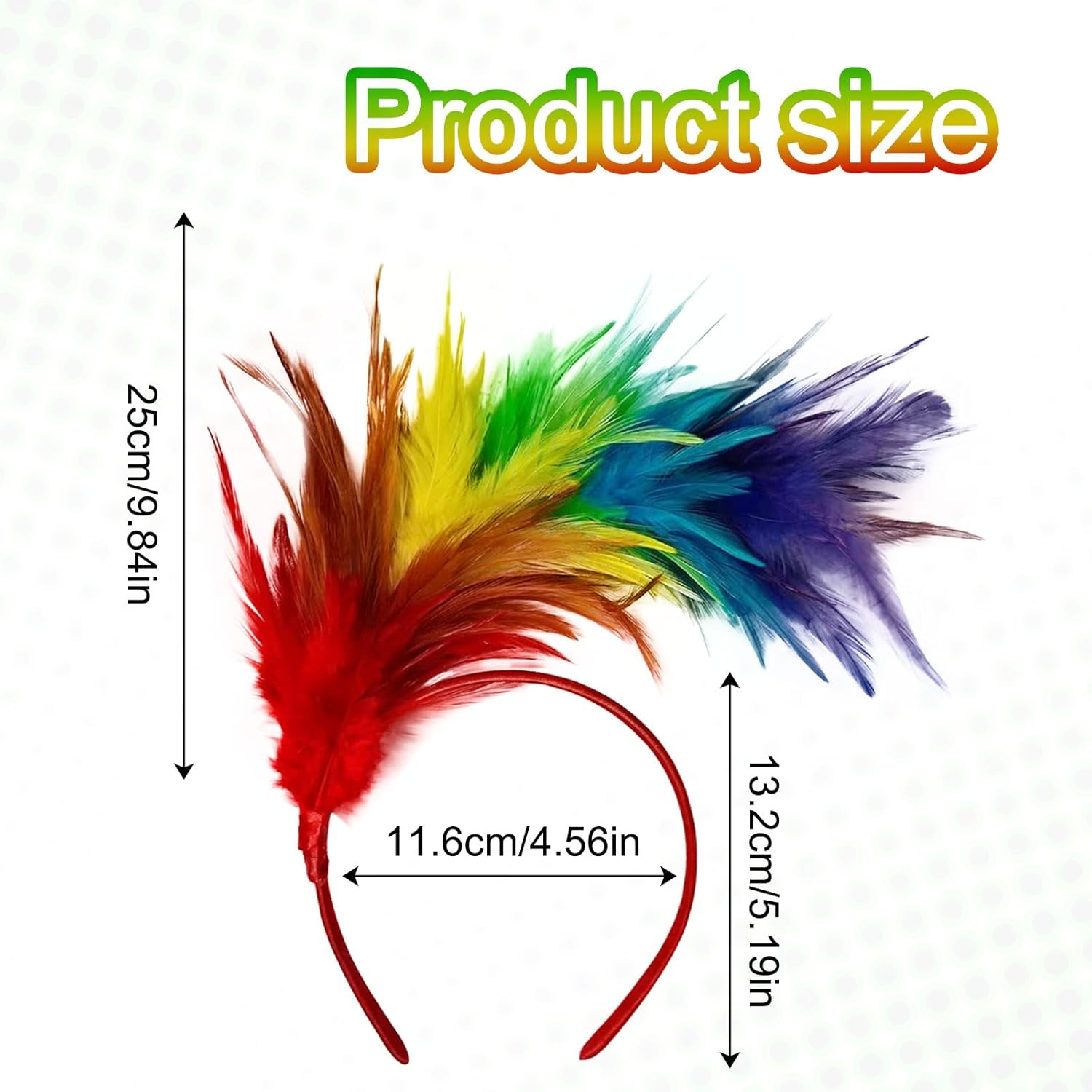 Specifiche tecniche: Specifiche del prodotto: 12,5 x 16 cm. Materiale del prodotto: capelli della nuca di gallo, filo di prepuzio, plastica La confezione include: 2 x copricapo con piume arcobaleno. Caratteristiche: 1. Alta elasticità, facile da indossare, non scivola, leggero e confortevole, non danneggia i capelli. 2. Il design unico ti fa distinguere dalla massa.