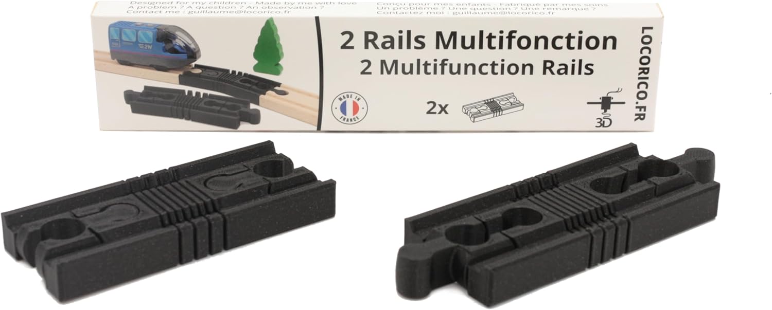 Contenuto della confezione: 2 binari multifunzione per treno in legno. A partire dai 4 anni: le guide possono fare tutto. Può essere maschio, femmina e sono persino flessibili per adattarsi al circuito del tuo bambino. Compatibile con tutte le principali marche di treni in legno: Brio, Lillabo, Thomas And Friends, Melissa, ma anche con i binari venduti da negozi generali come Lidl o Oxybul. Progettato con amore per i miei figli e realizzato da me in stampa 3D in Francia (accanto a Grenoble). Stampato in PLA, una plastica biosource. I treni in legno incoraggiano l'apprendimento precoce attraverso lo sviluppo delle capacità motorie, la risoluzione dei problemi e l'acquisizione di abilità sociali ed emotive. Regalo senza tempo che farà felici per ore di gioco e divertimento da solo o per molti! Ideale per completare la collezione di treni in legno della famiglia. Un ottimo regalo di compleanno per bambini dai 3 anni in su.