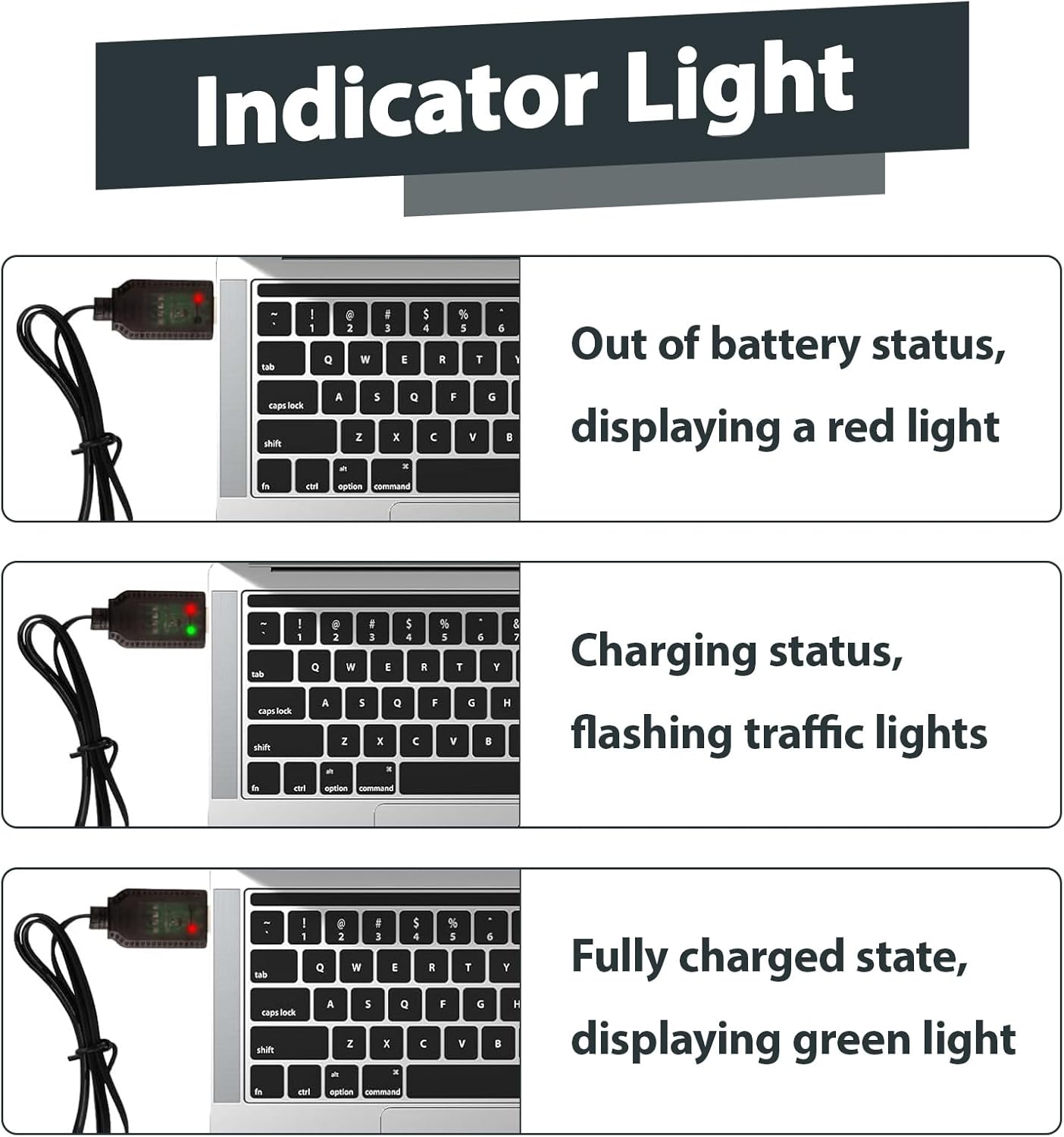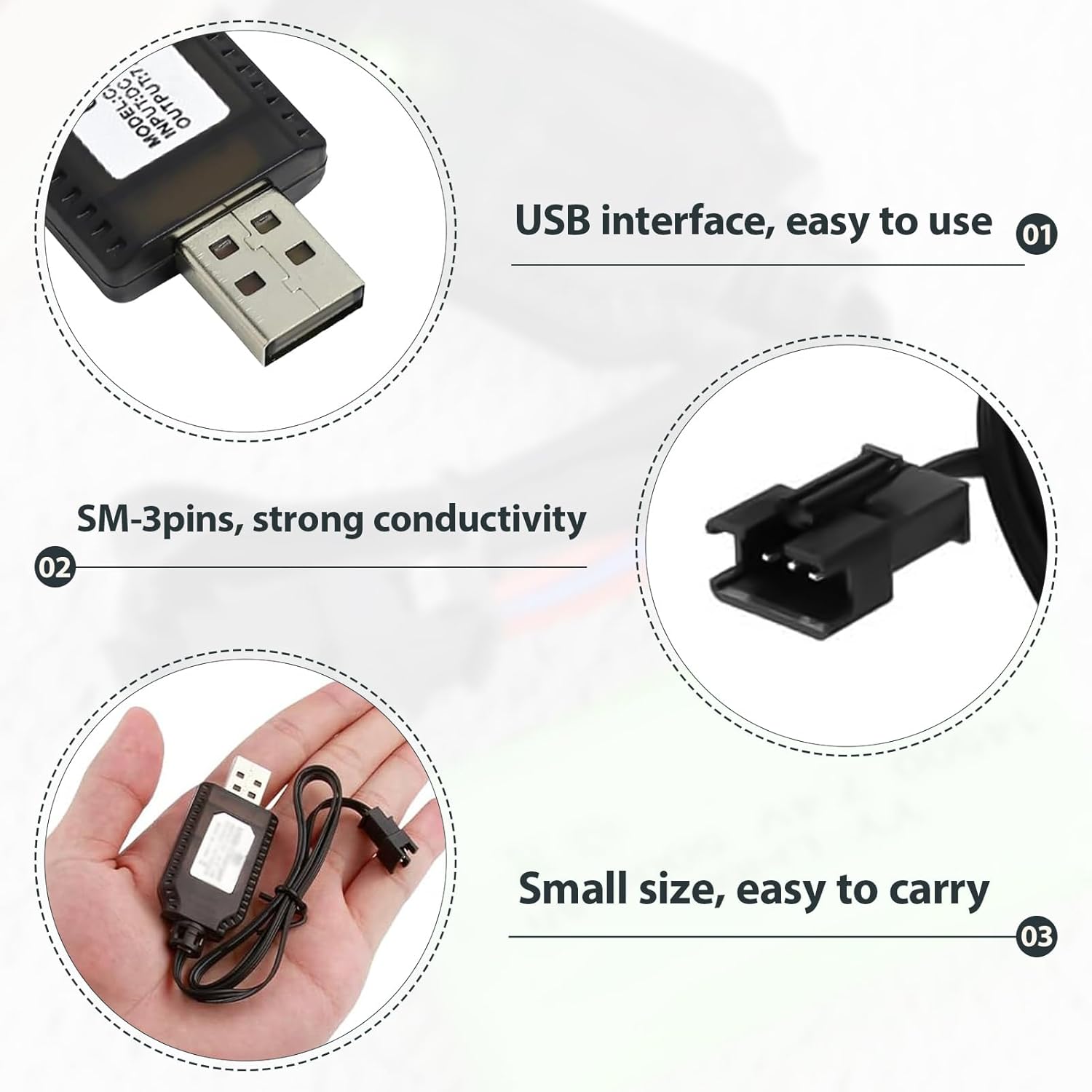 Design compatto e portatile: Questo caricabatterie al litio da 60 cm è leggero e facile da trasportare. Ideale per l’uso domestico o all’aperto, mantiene i tuoi dispositivi RC sempre carichi e pronti all’azione. Sicurezza intelligente integrata: Cavo di ricarica per batteria dotato di chip IC per protezione contro sovraccarico, cortocircuito e scarica eccessiva. Prolunga la durata della batteria e protegge i tuoi dispositivi durante ogni ciclo di carica. Ampia compatibilità SM-3P: Caricatore battery progettato per batterie al litio 7,4V 1000mAh con connettore SM-3P. Perfetto per droni, automobili, aerei, barche e robot telecomandati. Un must per ogni appassionato di modellismo. LED di stato integrati: L’indicatore luminoso mostra chiaramente lo stato della carica. Il LED rosso segnala la carica in corso, mentre il verde indica che la batteria è completamente carica e pronta all’uso. Plug and Play via USB: Nessuna configurazione necessaria. Basta collegare il caricabatterie per drone a una porta USB standard per iniziare la ricarica. Funziona con adattatori da muro, power bank e computer.