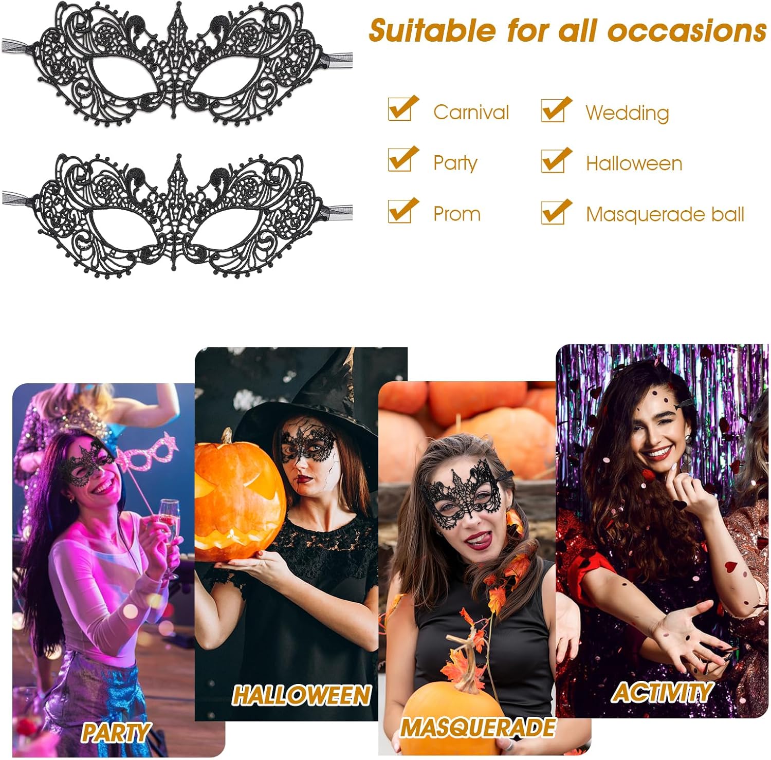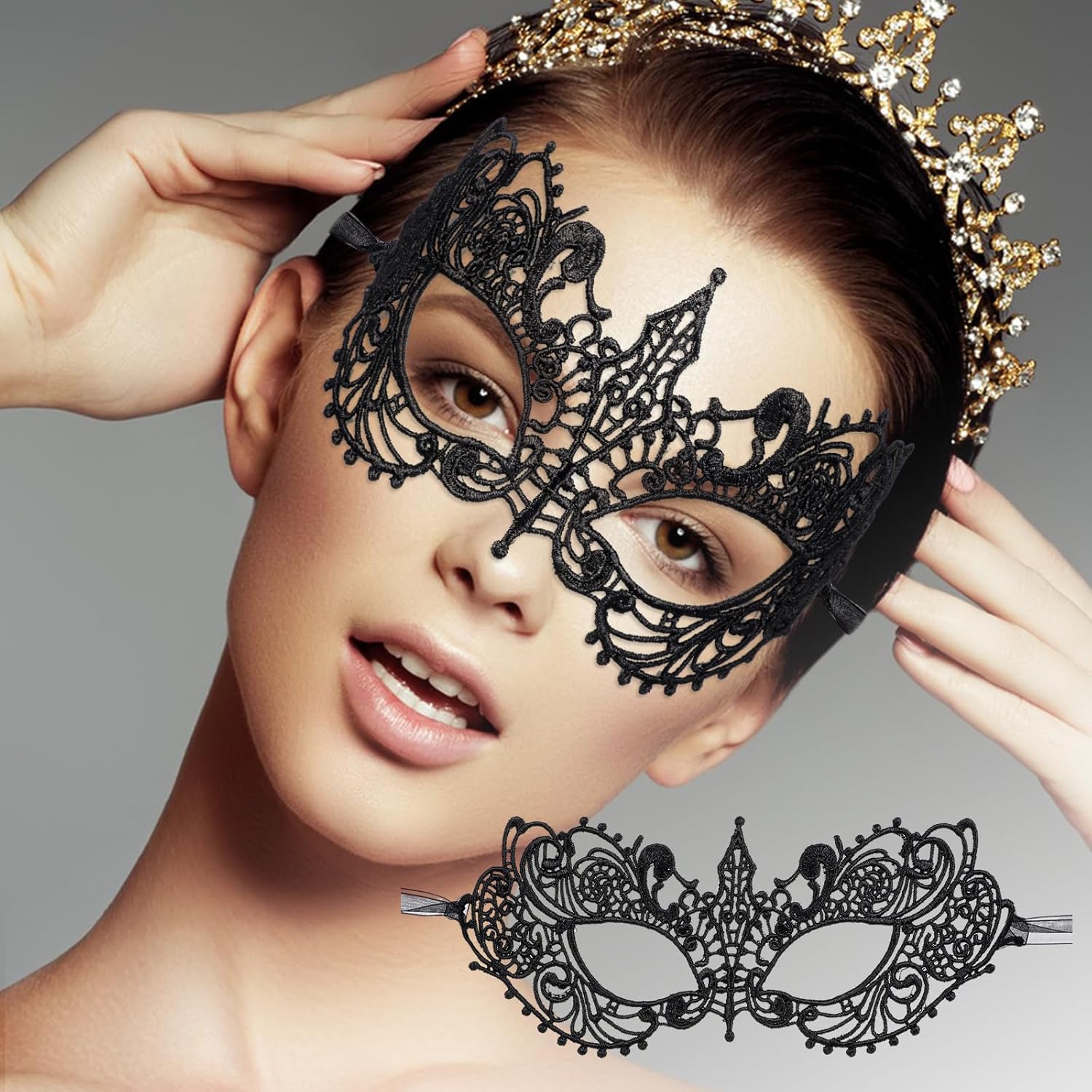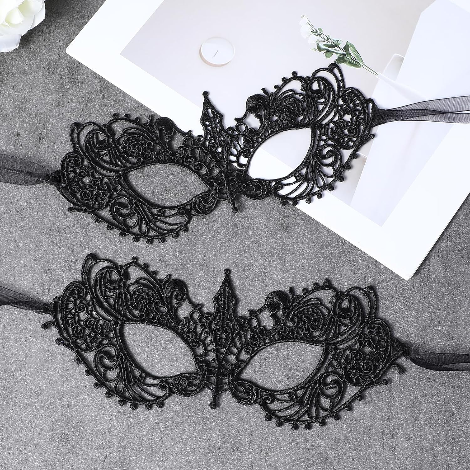 Contenuto della confezione: 2 maschere da donna in pizzo con occhielli. Dimensioni maschera: 22,5 x 10,5 cm. Lunghezza del cinturino singolo: 17 cm. Colore: nero. Materiale: poliestere.