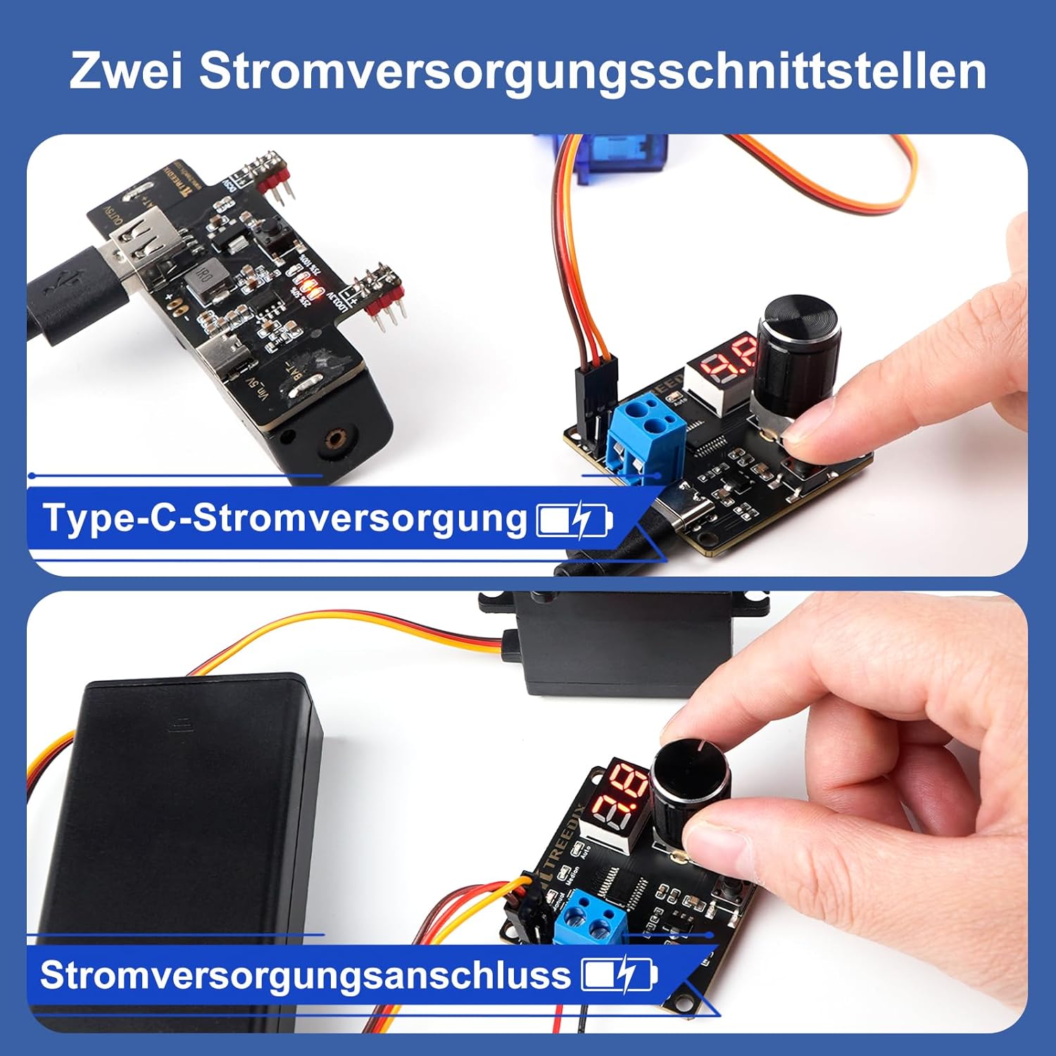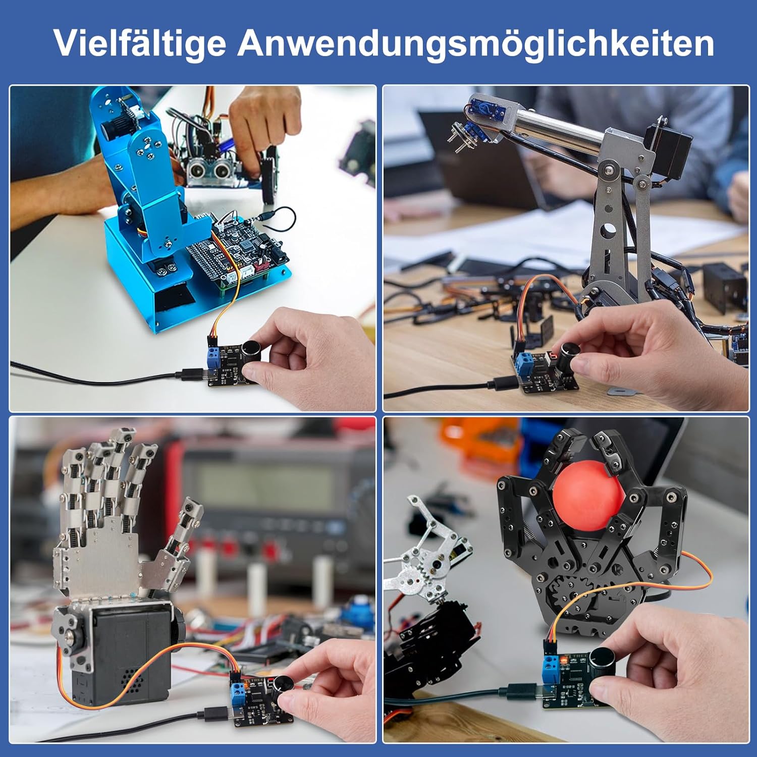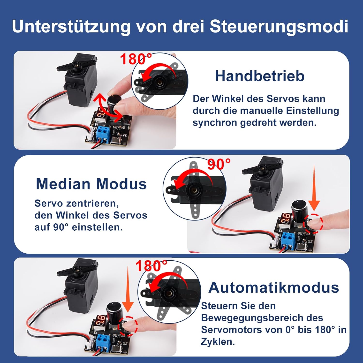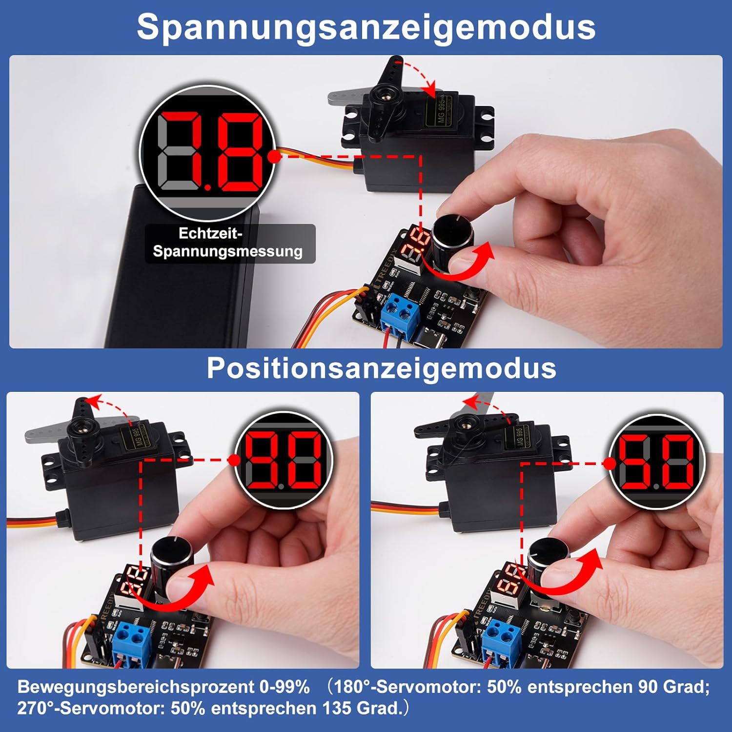 Con un potenziometro ad alta precisione, il servo di trasmissione può essere controllato in tempo reale. Segnale PWM ad alta risoluzione, microcontrollore onboard a 8 bit, che consente una maggiore precisione di controllo. Due modalità di visualizzazione: modalità di visualizzazione della tensione in tempo reale: può monitorare la tensione del dispositivo di alimentazione in tempo reale. Modalità di visualizzazione percentuale di posizione del servo: la posizione dell'azionamento servo può essere visualizzata in tempo reale (0-99%). Tenere premuto il pulsante per cambiare la modalità di visualizzazione. Tre modalità di controllo: controller manuale del servomotore, ripristino del servo al centro, controller automatico del servo. Premendo il pulsante, si cambia la modalità di controllo. Protezione da sovracorrente: interfaccia servogeno digitale modulazione a larghezza di impulso a 2 canali, che può essere controllata da un potenziometro ad alta precisione. Ampia applicazione: può essere utilizzato in tester robotici, test robotici, test di bracci meccanici e altri progetti.