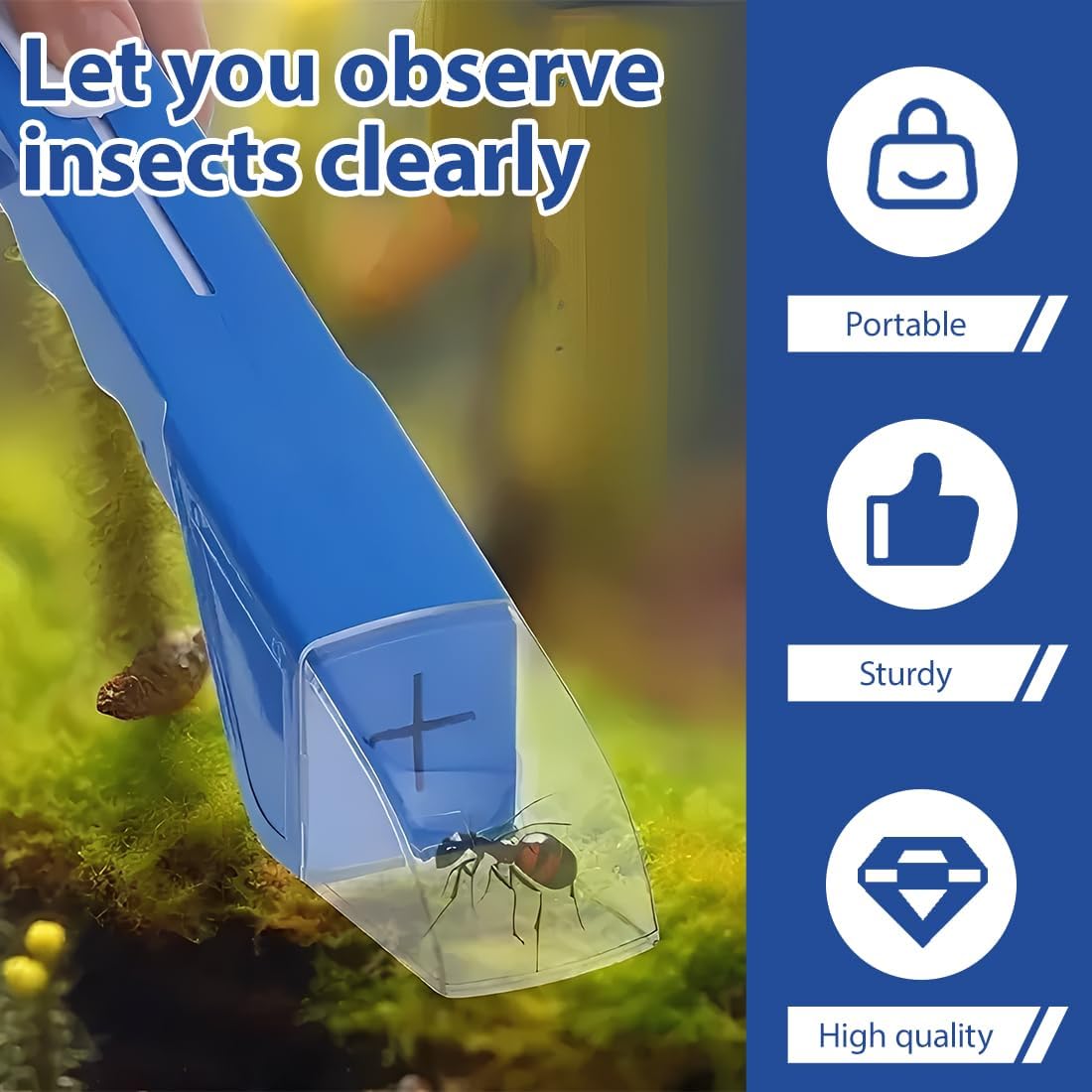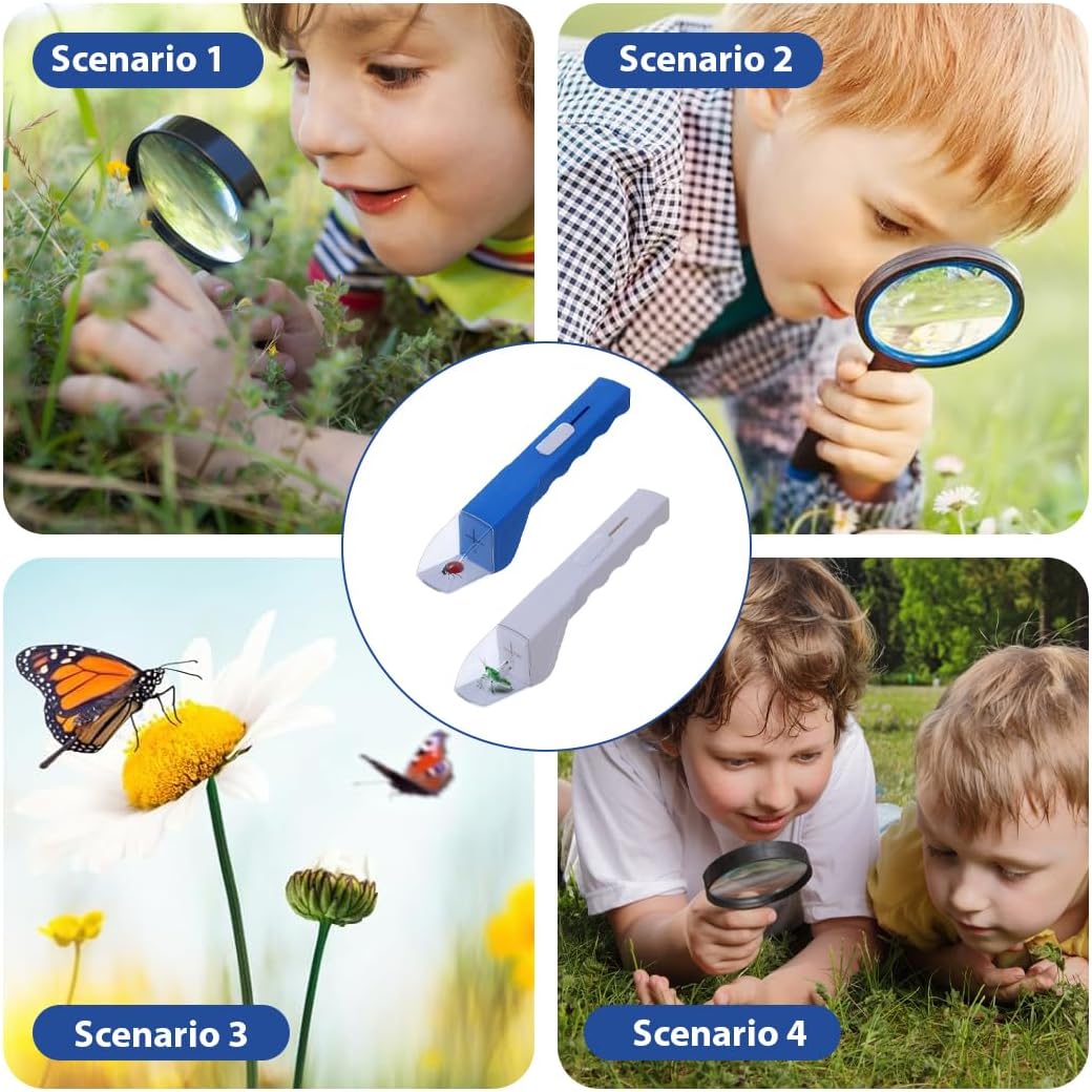 Funzionale e pratica: adatta per catturare e osservare vari insetti, questa trappola per insetti è uno strumento ideale per l'esplorazione all'aperto e le attività educative, aiutando bambini e adulti a comprendere meglio la natura e l'ecologia degli insetti. Materiali di alta qualità: realizzati con materiali durevoli ABS e PVC, che garantiscono robustezza e durata del prodotto, adatti per l'uso in vari ambienti esterni, facili da pulire e mantenere. Scenari applicabili: adatti per l'uso in ambienti naturali come parchi, foreste e giardini, particolarmente adatti per attività all'aperto in famiglia, progetti educativi scolastici e attività di esplorazione per gli amanti della natura. Il set include: Il set contiene due trappole per insetti (blu e bianca), ciascuna con una scatola di osservazione trasparente per una facile osservazione e studio degli insetti, offrendo una vasta gamma di opzioni. Facile da trasportare: il suo design leggero lo rende facile da trasportare, rendendolo adatto all'uso in vari ambienti esterni, rendendolo un compagno ideale per l'osservazione degli insetti e le attività educative.