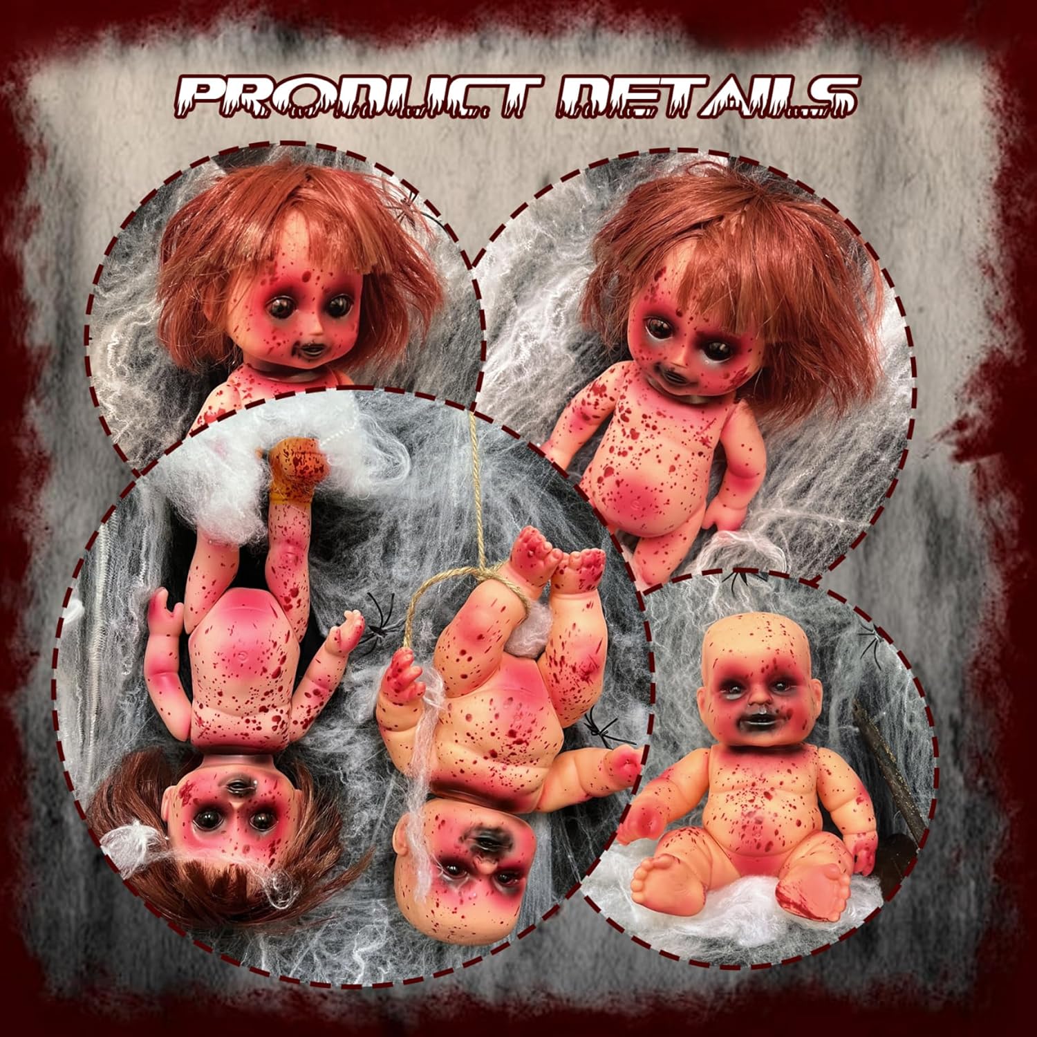 Oggetti di scena di Halloween: queste bambole morte viventi possono essere appese con una corda, che aggiunge un effetto di trasporto di ossa quando oscillano nel vento, rendendola una delle decorazioni più terrificanti per Halloween o occasioni spettrali. MATERIALI: Realizzata in PVC, questa bambola spaventosa è resistente e non facile da danneggiare. Il design leggero lo rende facile da trasportare e posizionare per il massimo fattore di paura. Realizzato a mano: ogni bambola spaventosa è un prodotto artigianale, garantendo un tocco unico a ogni pezzo. La forma, la quantità e il colore del sangue possono variare, aumentando l'autenticità e il fascino spaventoso di questo oggetto spettrale. Occasioni: ottimo per Halloween, decorazioni per case stregate, giochi di scherzi e persino per aggiungere un tocco spettrale agli scherzi del primo di aprile. Questa bambola spettrale è versatile e perfetta per spaventare in varie occasioni. Realistica e spaventosa: la bambola spaventosa presenta un design di bambino deceduto insanguinato, perfetto per creare un'atmosfera fresca e terrificante, specialmente durante Halloween.
