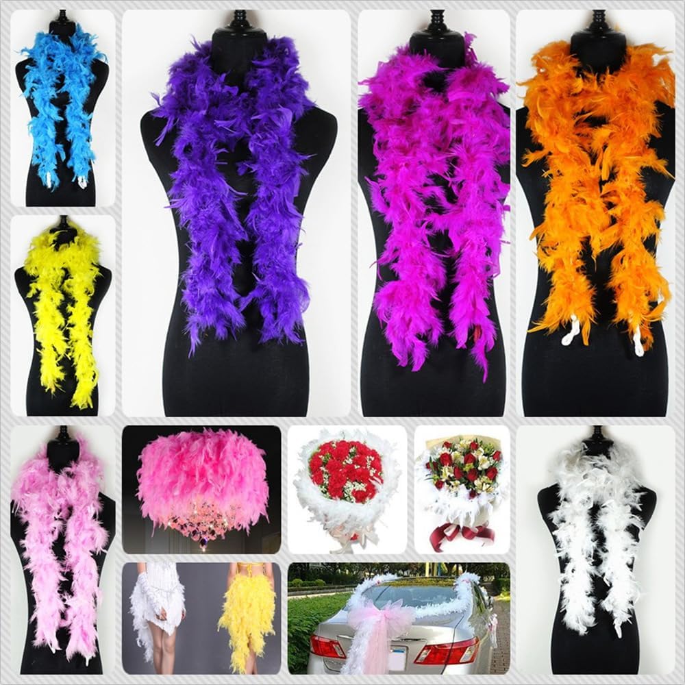 Materiale del prodotto: la nostra sciarpa con piume di tacchino naturale con colori vivaci, è elegante ed elegante e non passa inosservata. È l'accessorio perfetto per aggiungere divertimento al tuo look e può aggiungere un tocco di fascino ed eleganza a qualsiasi outfit. Dimensioni del prodotto: la sciarpa è lunga circa 2 m ed è stata sterilizzata professionalmente, colorata in modo ecologico, sterilizzata e asciugata ad alta temperatura. È morbido e leggero, ha una buona caduta, è comodo da indossare ed è perfetto da indossare intorno al collo o drappeggiato sulle spalle. Scelta ideale: la sciarpa è versatile e una scelta ideale per costumi da showgirl e un bel accessorio per tutte le eroine. Abbinate la sciarpa di piume con i vostri gioielli, vestiti e trucco per completare perfettamente il vostro look da festa! Uso del prodotto: questa sciarpa colorata con piume è perfetta per il fai da te e può essere utilizzata per decorazioni natalizie, decorazioni per la casa, decorazioni per matrimoni, giocattoli per gatti, ghirlande di piume, decorazioni per albero di Natale, ecc. Non è solo visivamente accattivante, ma crea anche un'atmosfera calda e festosa. Occasioni applicabili: è un accessorio ideale per spettacoli di danza, occasioni speciali, matrimoni, feste di carnevale, feste di Natale, feste di Capodanno, Halloween, teatro, spettacoli di dressage, ecc. È anche un regalo perfetto per modelli, attori, ballerini o semplicemente per chi ama qualcosa di speciale.