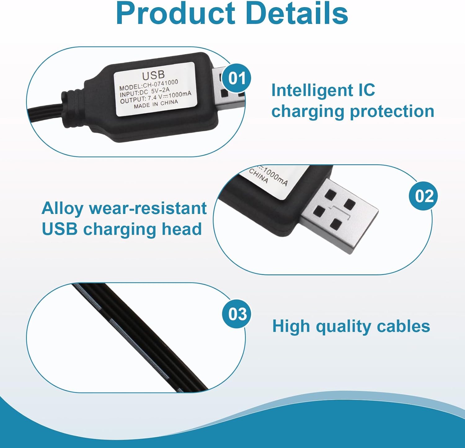 Compatibilità Avanzata: Il nostro caricatore giocattolo per auto RC con connettore SM-4-PIN è progettato specificamente per batterie al litio da 7,4 V ed è adatto a un'ampia gamma di giocattoli RC come droni auto quadricotteri e barche; Si prega di verificare la compatibilità prima di ordinare utilizzando l'illustrazione dettagliata sulla pagina del prodotto Circuito di Protezione Intelligente: Dotato di funzioni di sicurezza avanzate; questo caricabatterie rc universale protegge da sovraccarico; sovratensione e cortocircuito; Grazie alla tecnologia dei circuiti IC; il cavo di ricarica USB RC protegge in modo ottimale la batteria; prolungandone così la durata Leggero e Portatile: Il design compatto e leggero rende questo cavo di ricarica USB RC da 7,4 V ideale per gli appassionati di giocattoli RC sempre in movimento; Riponi facilmente il cavo di ricarica in borsa o nello zaino; puoi caricare i tuoi dispositivi ovunque e averli pronti all'uso rapidamente Indicatori di Carica Intuitivi: l'indicatore LED mostra il livello di carica attuale; Durante la ricarica, la luce verde lampeggia e la luce rossa è fissa; A carica completa la luce verde rimane accesa e la luce rossa si spegne; Il caricatore per pila per giocattoli è una funzionalità intuitiva per una ricarica facile Utilizzo Versatile: Questo caricabatterie modellismo rc è perfetto per auto RC droni quadricotteri barche, elicotteri e molti altri dispositivi radiocomandati che richiedono un connettore SM-4-PIN e un alimentatore da 7,4 V