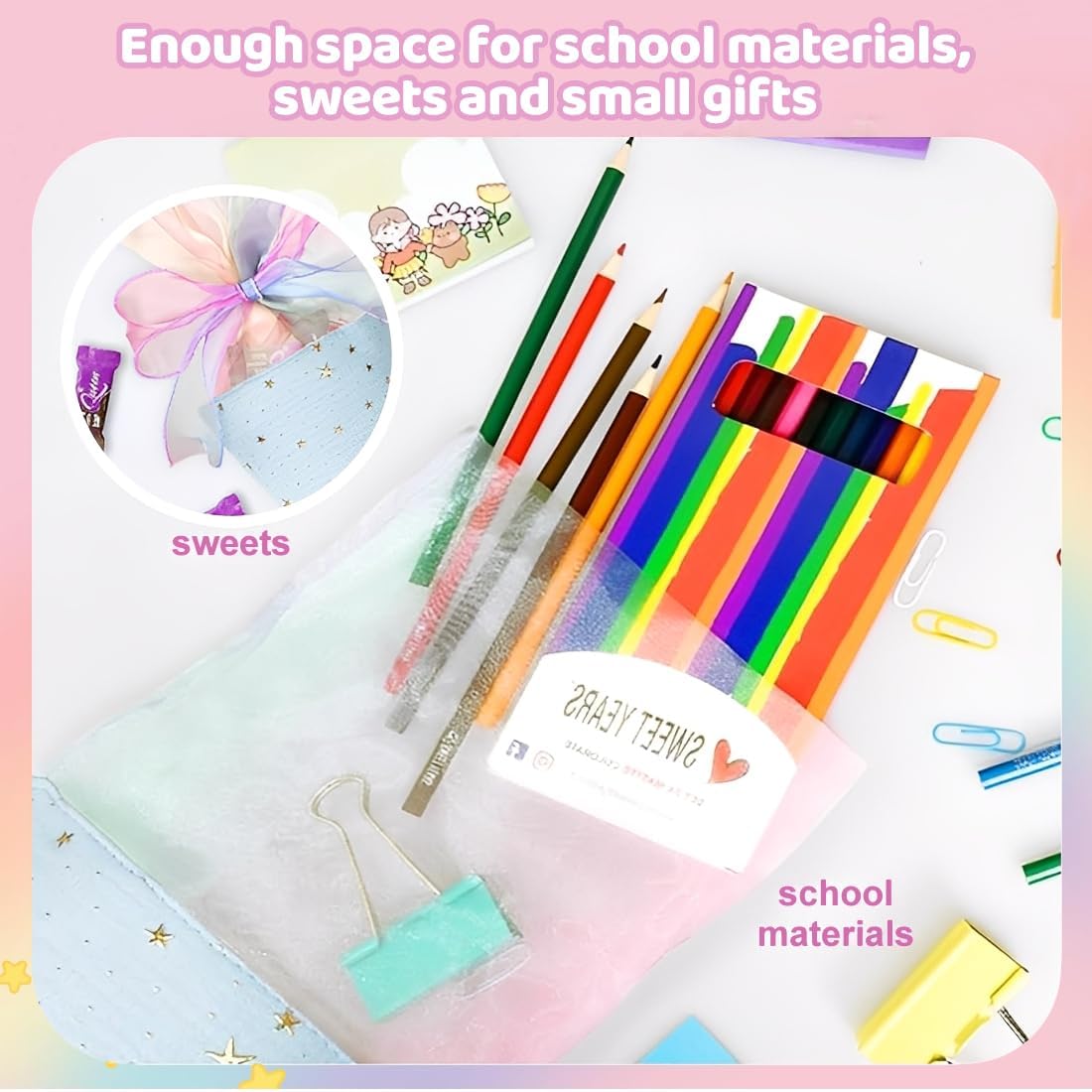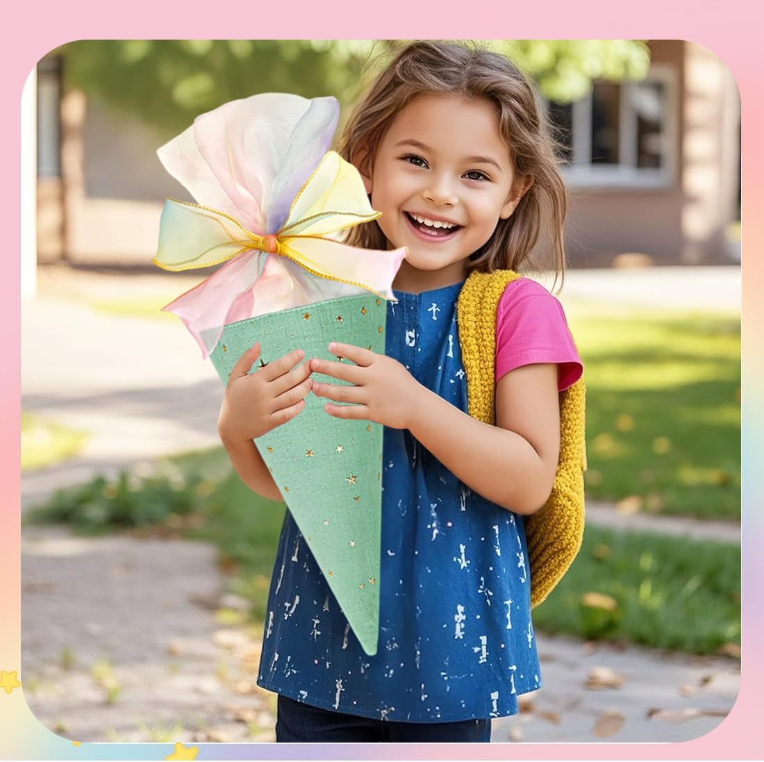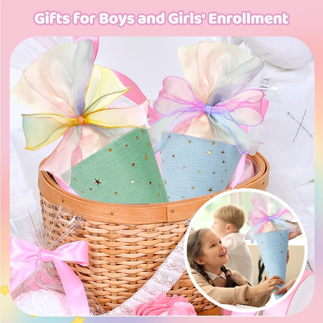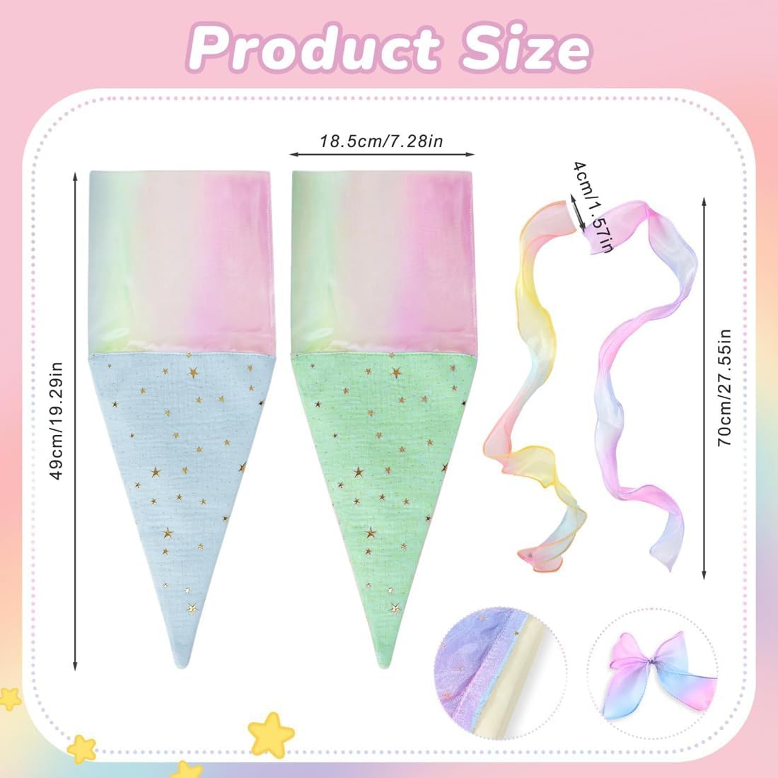 Coni di caramelle per la scuola dei ragazzi e delle ragazze: 2 coni di caramelle con fiocchi (blu e verde), piccoli coni di caramelle come coni di caramelle per fratelli, adatti a ragazzi e ragazze, sono regali ideali per i bambini della prima elementare. Dimensioni: 2 piccoli coni di caramelle misurano 49 cm x 18,5 cm, i coni di caramelle sono vuoti e possono essere riempiti con cancelleria, piccoli oggetti o snack, che sono molto adatti come piccoli regali per gli studenti che stanno per iniziare la scuola. Materiali di alta qualità: Questo piccolo cono di caramelle è realizzato in cotone di alta qualità, resistente, non si danneggia facilmente ed è decorato con stelle luminose; è dotato di un fiocco, il regalo perfetto per iniziare un nuovo anno scolastico. Applicazione: Il cono porta caramelle offre ampio spazio per snack e pratici articoli scolastici, come penne, astucci, articoli per bricolage, piccoli blocchi per appunti, ecc. REGALI PER IL RITORNO A SCUOLA PER BAMBINI E BAMBINE: Questi piccoli coni di caramelle didattiche per bambini e bambine sono perfetti come regali per il ritorno a scuola, regali per l'iscrizione, regali per il primo giorno di scuola, regali per la prima elementare, regali per l'iscrizione, ecc.