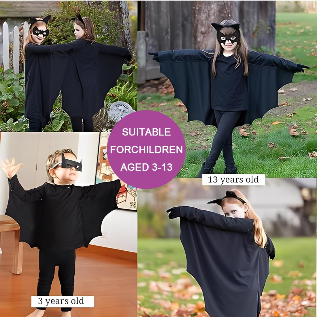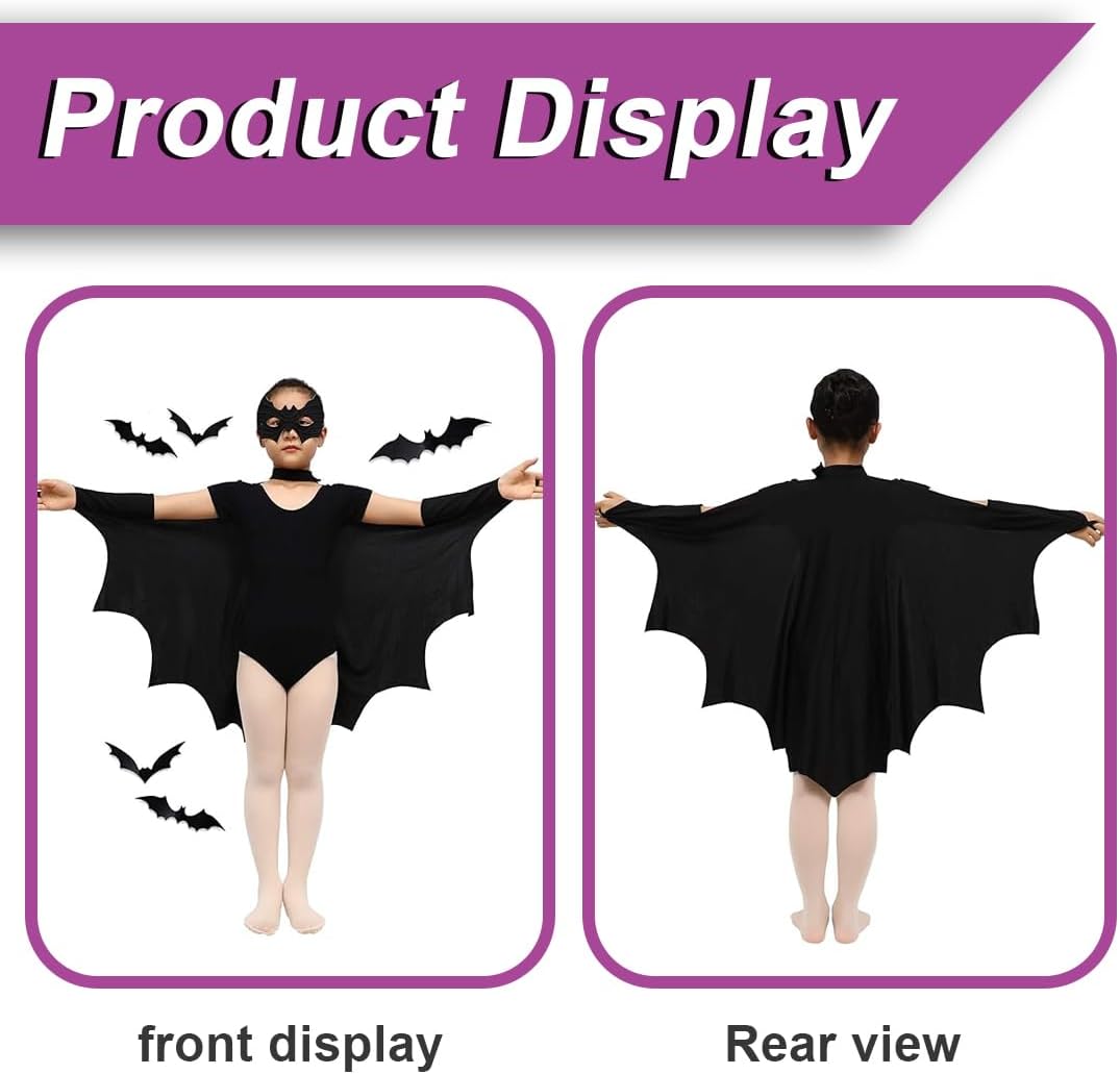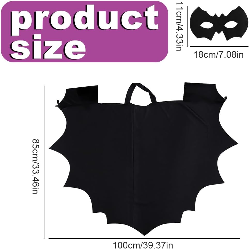 Contenuto della confezione: 1 mantello da pipistrello, 1 maschera da pipistrello. Taglia: costume da pipistrello taglia unica per bambini, adatto a bambini alti 100 cm-150 cm. Design unico: ogni ala è dotata di polsini e lacci al collo per una vestibilità sicura e antiscivolo. Le mollette per capelli a forma di pipistrello si abbinano facilmente a qualsiasi costume o look. Adorabili e affascinanti, faranno sicuramente risaltare il tuo bambino e lo renderanno protagonista alle feste di Halloween! Qualità: realizzato in poliestere di alta qualità, questo costume da pipistrello per bambini è resistente, delicato sulla pelle e completamente privo di sostanze chimiche. L'indumento non provoca prurito o costrizione. Uso versatile: questo costume da pipistrello di Halloween è un fantastico vestito da vampiro per bambini, perfetto per: carnevali per bambini, feste horror di Halloween, carnevali, giochi di ruolo, feste a tema e cosplay.