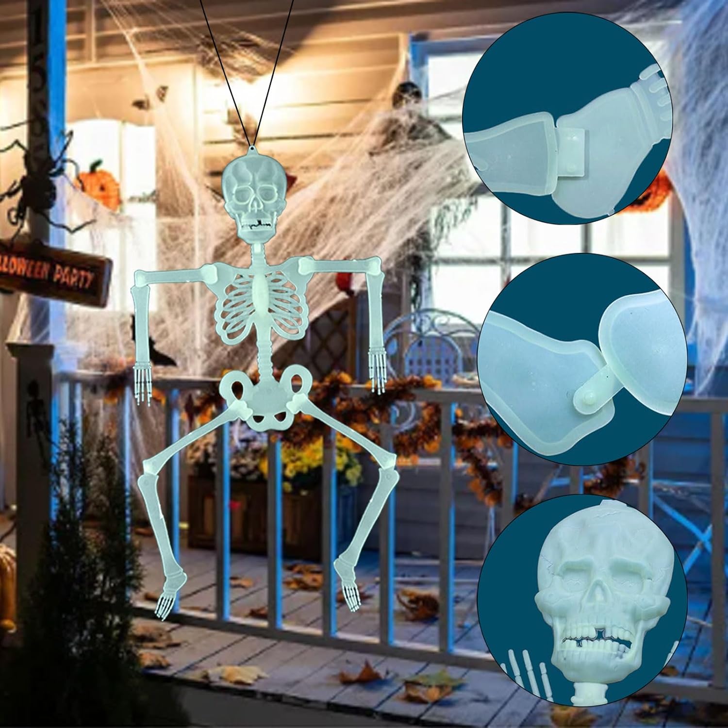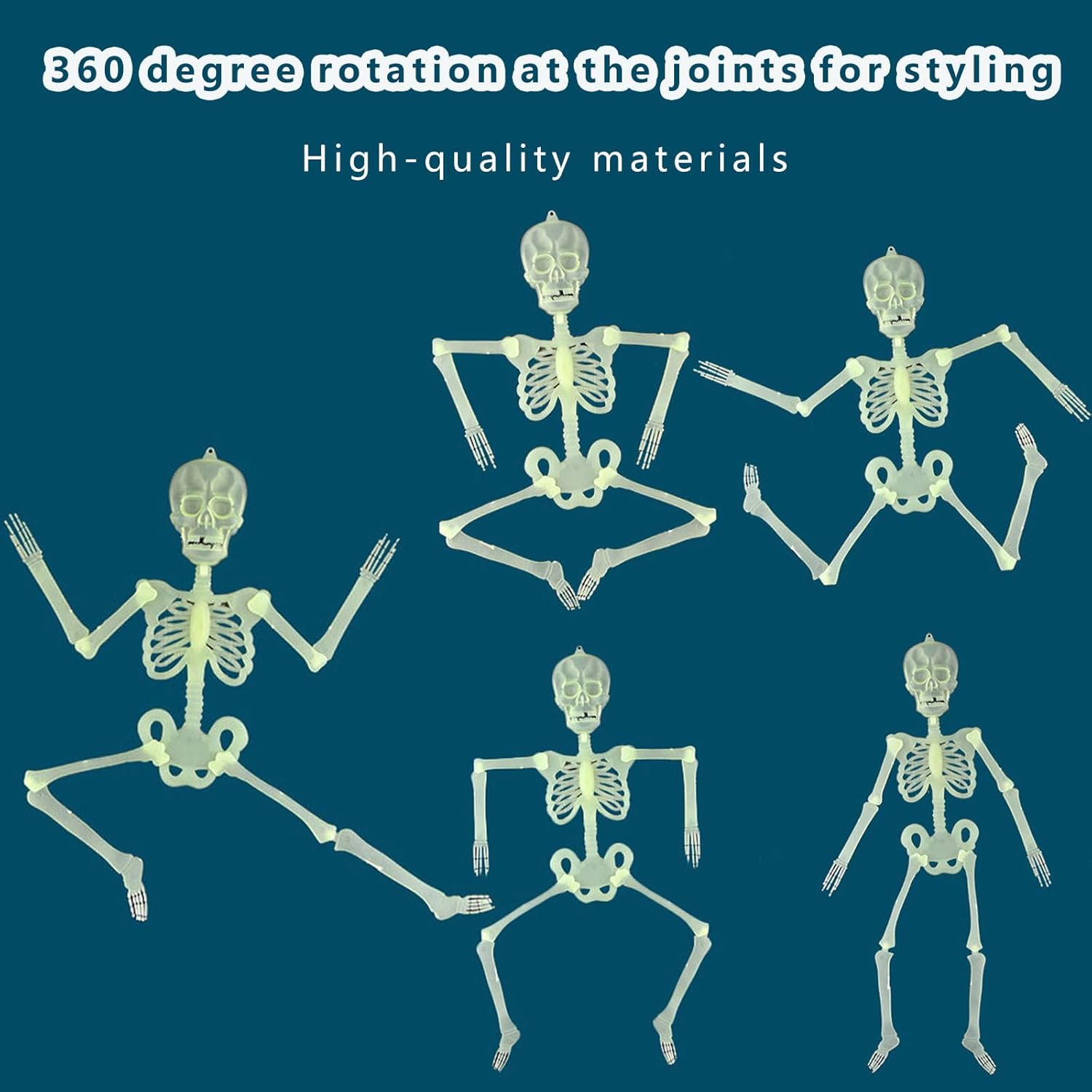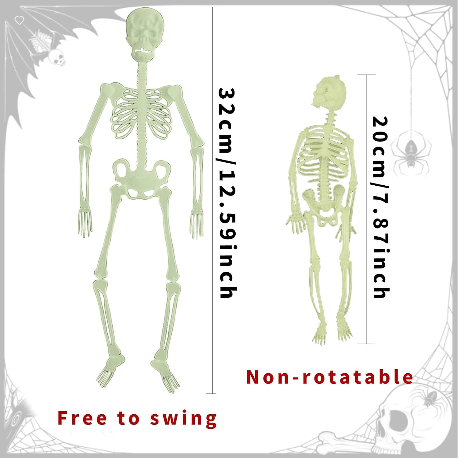 Decorazione scheletro di Halloween: riceverai 2 scheletri di Halloween sospesi con funzioni luminose nelle dimensioni 20 cm e 32 cm. Lo scheletro fluorescente da appendere ha piccoli fori che possono essere facilmente assemblati o appesi per ottenere l'effetto desiderato. Materiali di alta qualità: queste decorazioni scheletriche di Halloween sono realizzate in PVC, leggero, resistente e riutilizzabile. È realizzato con cura per garantire una lunga durata. È molto morbido e ogni articolazione può essere piegata in modo flessibile. Effetto luminoso notturno: gli scheletri fluorescenti sembrano più freschi di notte rispetto agli scheletri normali. Lo scheletro del teschio luminoso di Halloween ha piccoli fori, puoi appenderlo o metterlo in una posa fissa per farlo risaltare nell'oscurità di Halloween. Giunti mobili: lo scheletro luminoso ha giunti mobili che ti consentono di regolare diverse pose e posizioni. Puoi regolarlo secondo i tuoi desideri e dargli un aspetto realistico e spaventoso. Ampiamente usato: puoi appendere scheletri su cime di alberi, case, finestre e lampade da tavolo con corde per la decorazione del giardino di Halloween, decorazioni esterne, decorazioni del soggiorno, decorazioni della casa stregata, feste a tema horror, feste a tema scheletri, ecc. Con corde