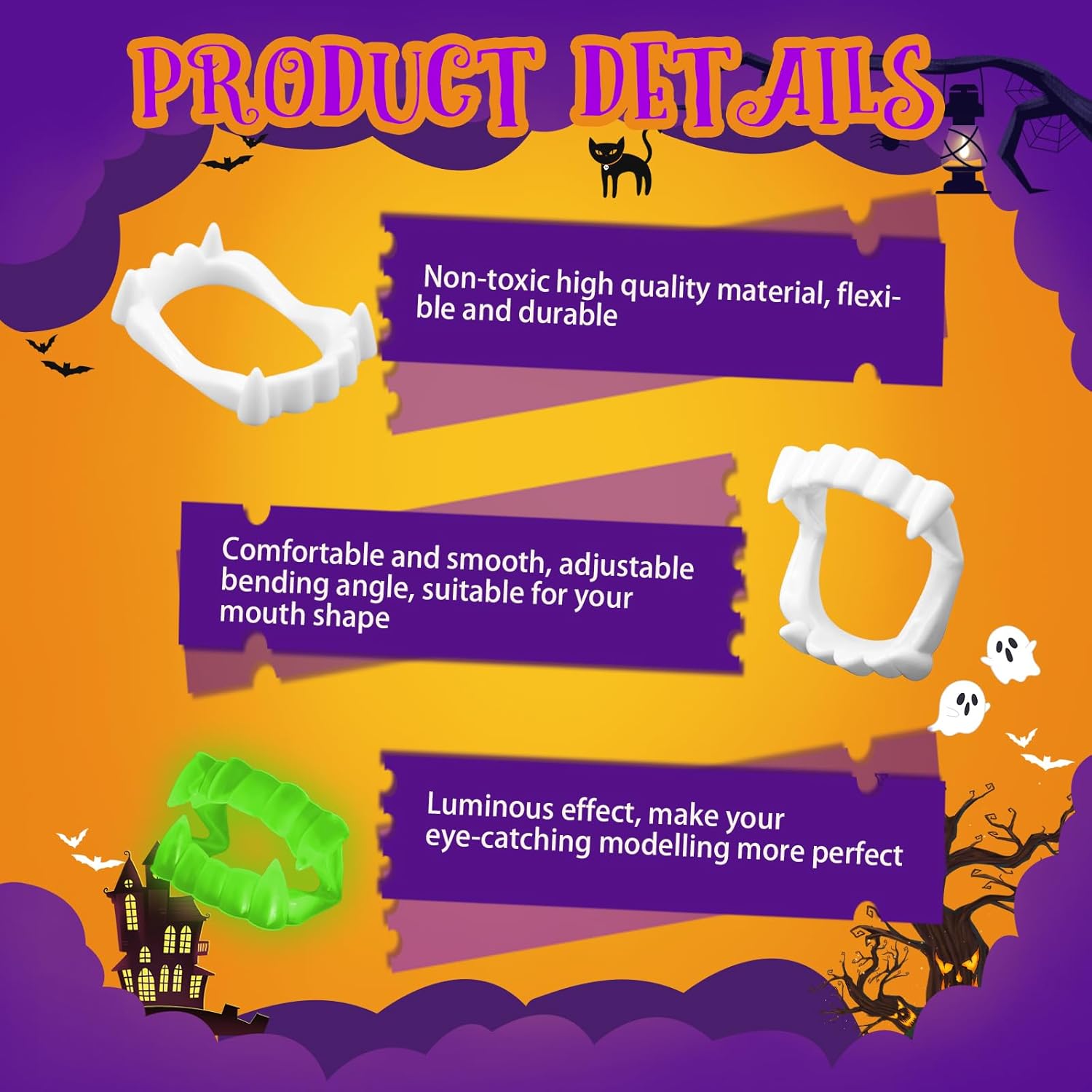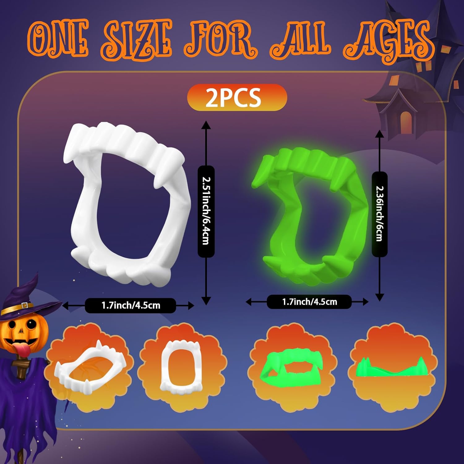 Specifiche: Materiale: Plastica Colore: Bianco, Verde Quantità: 2PCS Il pacchetto include: 2x Denti di Halloween Note calde: Si prega di consentire un leggero errore di dimensione a causa della misurazione manuale. I colori possono esistere leggera differenza a causa di schermo diverso.