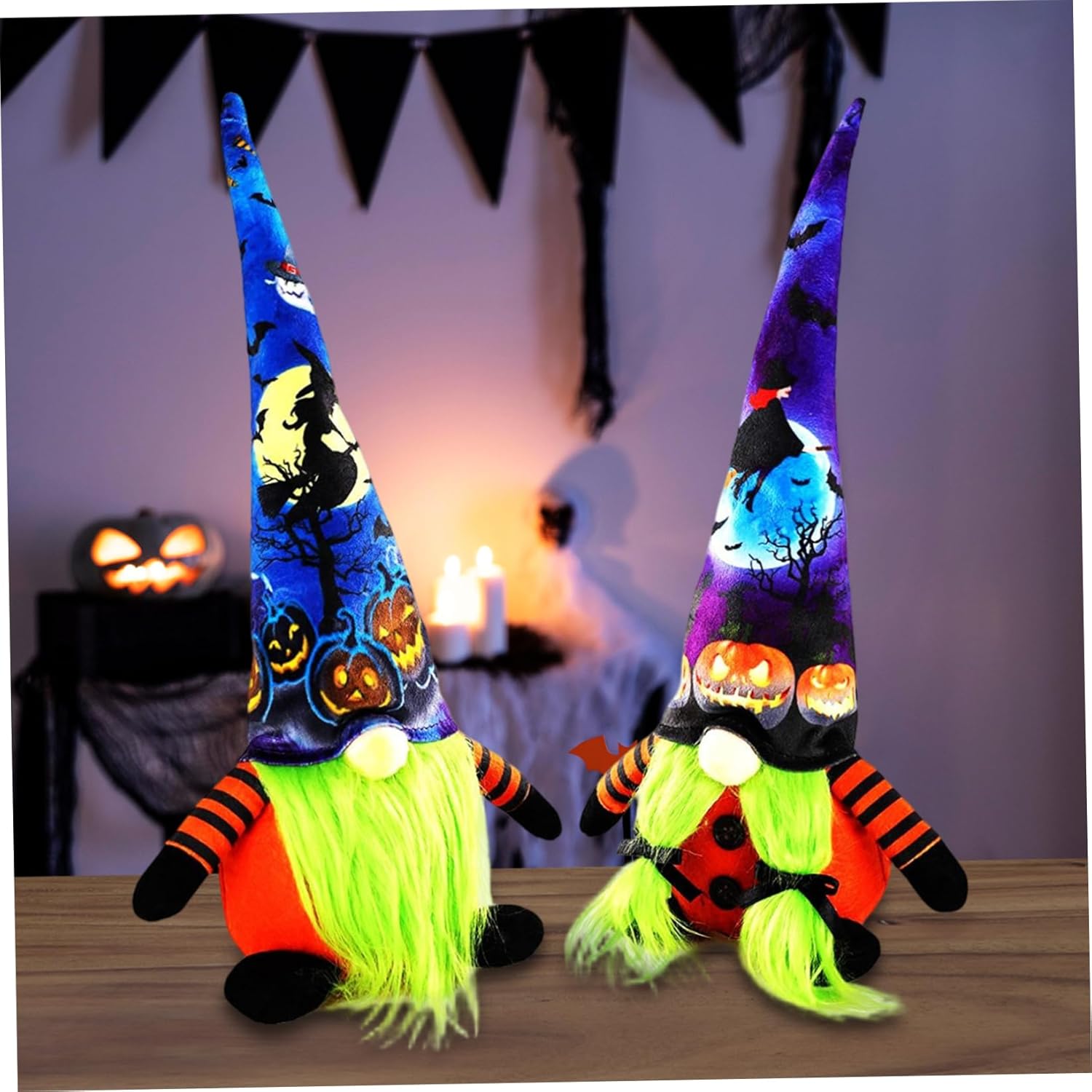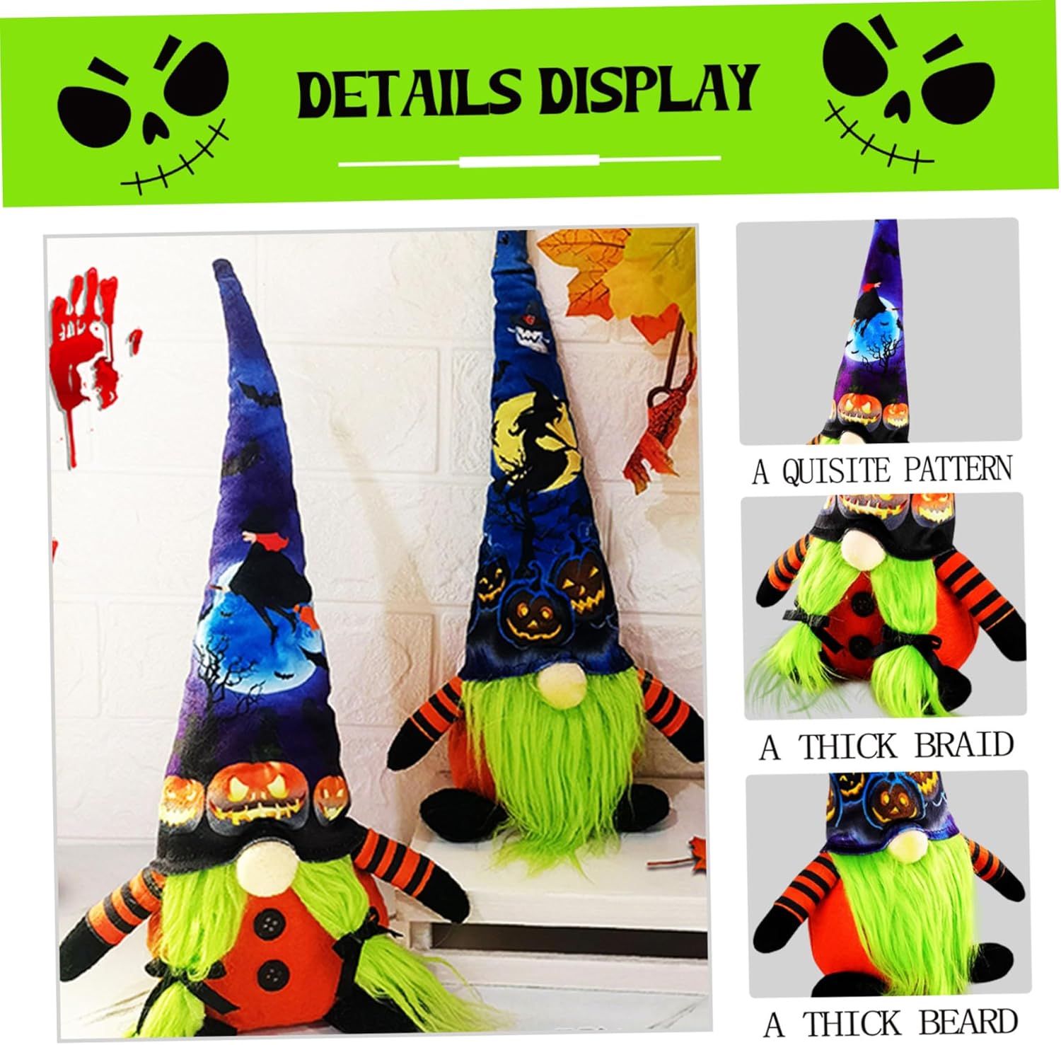 Dimensioni perfette per la versatilità: misurando 5,5 x 15 pollici, questi gnomi sono perfettamente dimensionati per adattarsi a scaffali, scrivanie, mensole o come decorazioni centrotavola, fondendosi perfettamente con qualsiasi ambientazione di Halloween. Design Stabile e Sicuro: Realizzati con materiali peluche di qualità, questi gnomi mantengono forma e colore nel tempo e sono sicuri per bambini e animali domestici, valorizzando la tua decorazione senza preoccupazioni. Materiale morbido e soffice: realizzati in tessuto morbido di alta qualità, questi gnomi offrono una sensazione tattile confortevole che aggiunge calore e fascino, rendendoli ideali per le decorazioni di Halloween in famiglia. Halloween ideale: questi simpatici gnomi di Halloween sono un pensiero premuroso e delizioso per amici e parenti che amano decorazioni stagionali uniche, diffondendo l'allegria natalizia in modo stravagante. Affascinanti decorazioni di Halloween: questi gnomi di Halloween da 2 pezzi portano uno spirito festivo con il loro adorabile design in peluche senza volto e cappelli a punta dinamici, perfetti per migliorare qualsiasi ambiente di casa o ufficio durante la stagione spettrale.