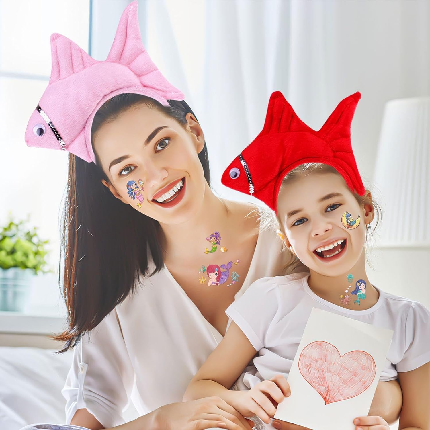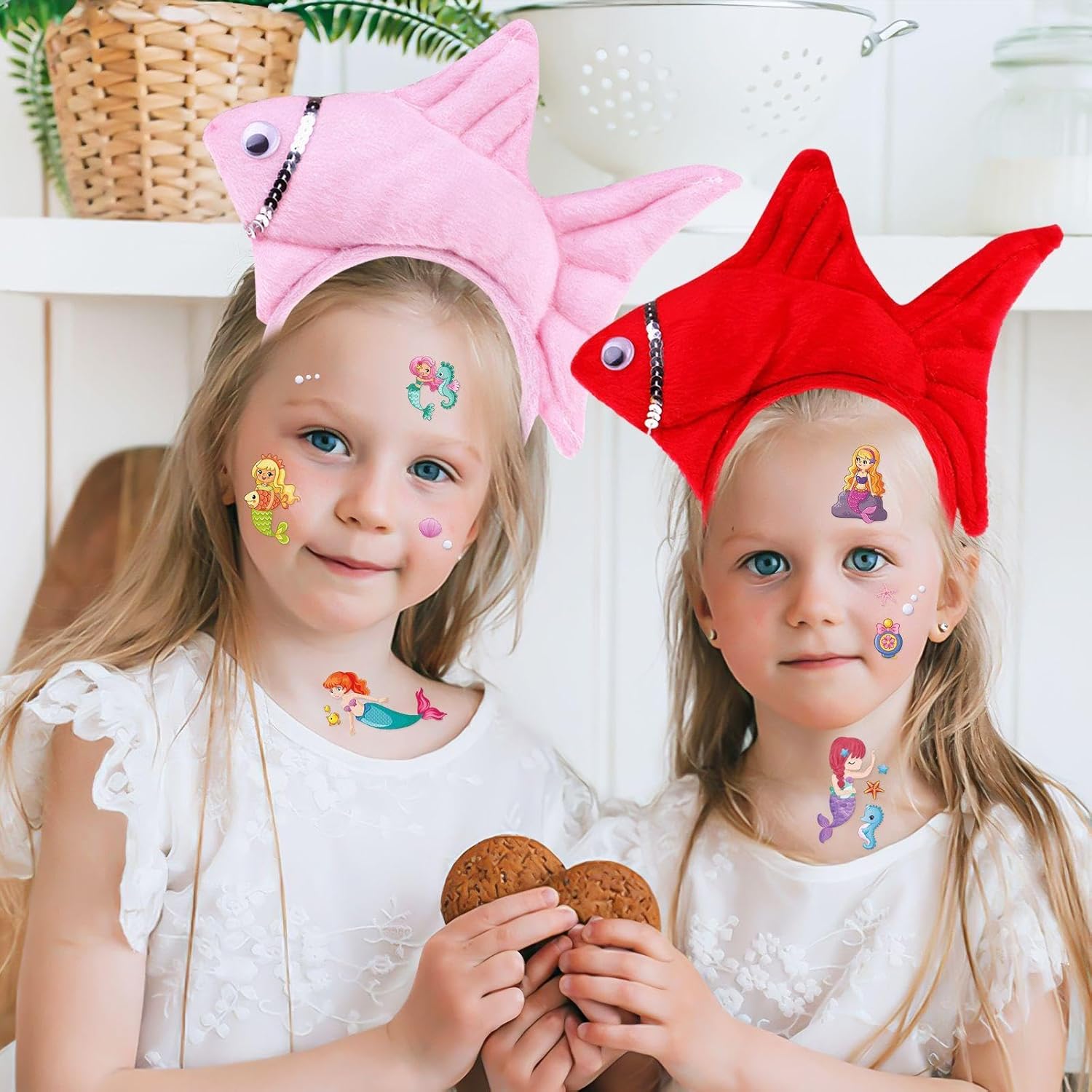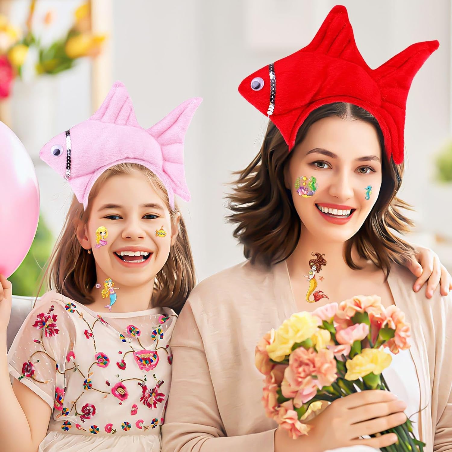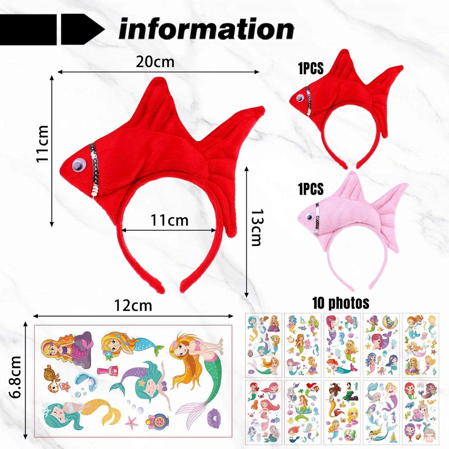 [Contenuto Del Prodotto] Si Riceverà 2 Pezzi Di Testa Di Pesce Cerchi E 10 Mermaid Tattoo Stickers.La Dimensione Del Cerchio Della Testa Di Pesce È Di Circa 20*11 Cm Di Larghezza Per I Piccoli Pesci, E La Fascia È Di 11*13 Cm Di Colore, Rosa E Rosso; La Dimensione Dell'Adesivo Del Tatuaggio Della Sirena È 12*6.8 Cm, E Il Colore È Multicolore, Che È Adatto Per La Decorazione Del Partito E Le Attività Creative. [Materiale Del Prodotto] Il Pesce Testa Cerchio Di Questo Prodotto È Fatto Di Bene Peluche E Fascia Di Plastica, Che È Comodo E Resistente Da Indossare.Mermaid Tattoo Stickers Sono Realizzati In Materiale Di Trasferimento Dell'Acqua, Che Si Adatta Saldamente Alla Pelle, È Facile Da Usare E Ha Un Motivo Chiaro. [Design Creativo] Questo Prodotto Ha Un Design Unico, Una Forma A Cerchio Di Testa Di Pesce Carino E Interessanti Adesivi Per Tatuaggi A Sirena Per Aggiungere Divertimento E Colore Alla Tua Festa.I Cerchi A Testa Di Pesce Sono Adatti Per Varie Feste A Tema E Gli Adesivi Per Tatuaggi Possono Essere Attaccati Alle Braccia, Alle Gambe, Ecc. A Volontà Per Mostrare Uno Stile Unico. [Facile Da Usare] Questo Prodotto È Facile Da Usare, Il Cerchio Di Testa Di Pesce È Semplice E Fermo Da Indossare, E L'Adesivo Del Tatuaggio Della Sirena Può Essere Facilmente Attaccato Finché È Bagnato E Può Essere Rimosso Se Necessario Dopo L'Uso, Rendendolo Facile Da Usare. [Ampiamente Usato] Questo Prodotto È Molto Adatto Per Varie Feste Ed Eventi, Come Feste Di Compleanno, Feste A Tema, Halloween, Ecc.Sia Che Venga Utilizzato Come Decorazione O Come Puntello Cosplay, Può Rendere Il Tuo Vestito Più Unico E Accattivante.