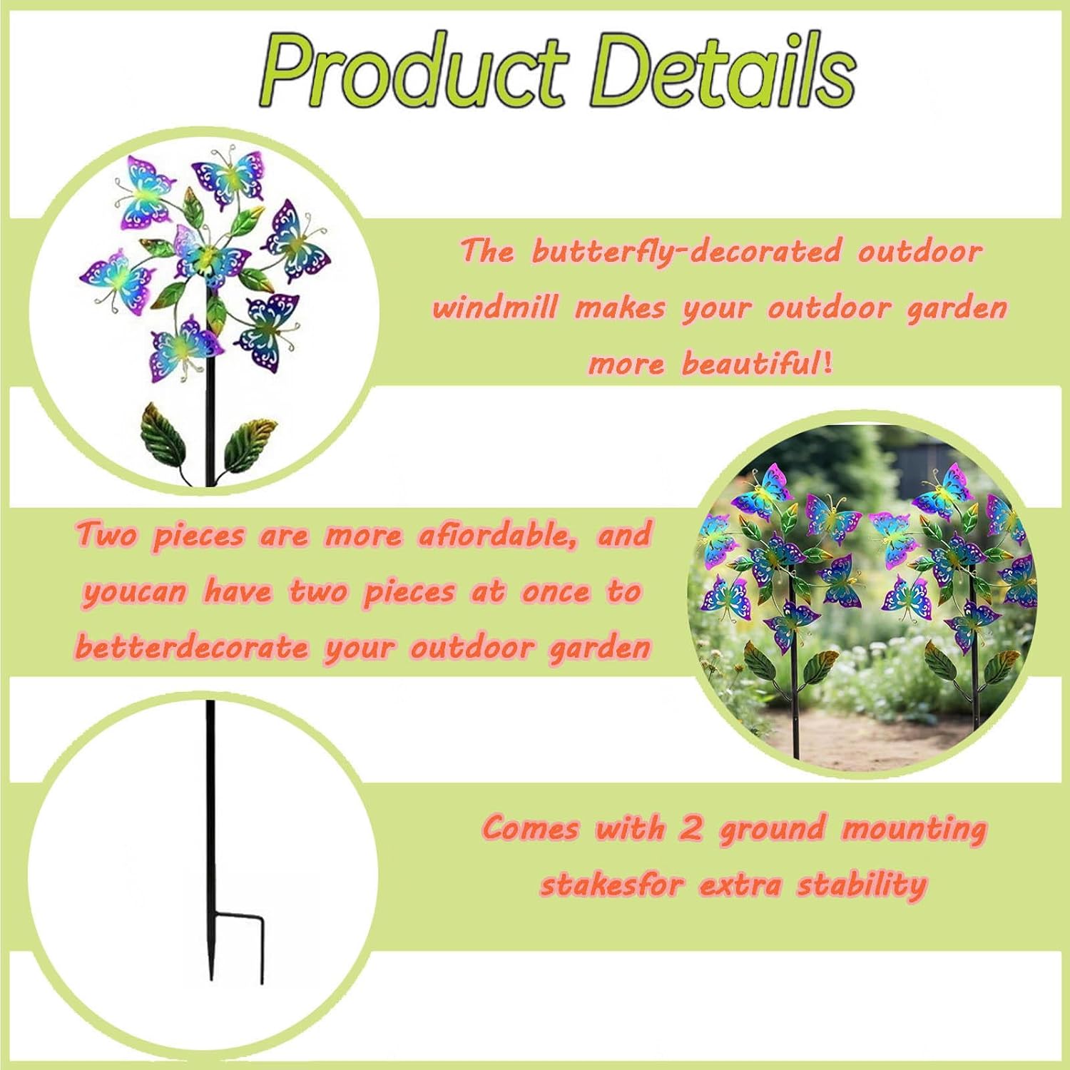 【Mulino a vento a farfalla】Questo set da 2 mulini a vento presenta un delizioso motivo a farfalla che aggiungerà colore al tuo spazio esterno a ogni leggera rotazione. 【Materiale robusto】 Lo spazio esterno delle girandole è caratterizzato da una struttura robusta che garantisce che possa resistere a varie condizioni meteorologiche e ambienti difficili e possa persino girare con brezze leggere. 【Design raffinato】La girandola a farfalla ha un design raffinato, che aggiunge un tocco di eleganza al tuo cortile e al tuo giardino. 【Facile da installare】Le parti della girandola del mulino a vento da giardino sono molto facili da installare, basta stringere tutte le parti e inserirle nel terreno o nel prato 【Bella decorazione per esterni】 Lo spinner solare può essere posizionato nella parte anteriore, nel cortile, lungo il vialetto, la passerella, il marciapiede, intorno al patio o al portico. È un fantastico regalo per la festa della mamma.