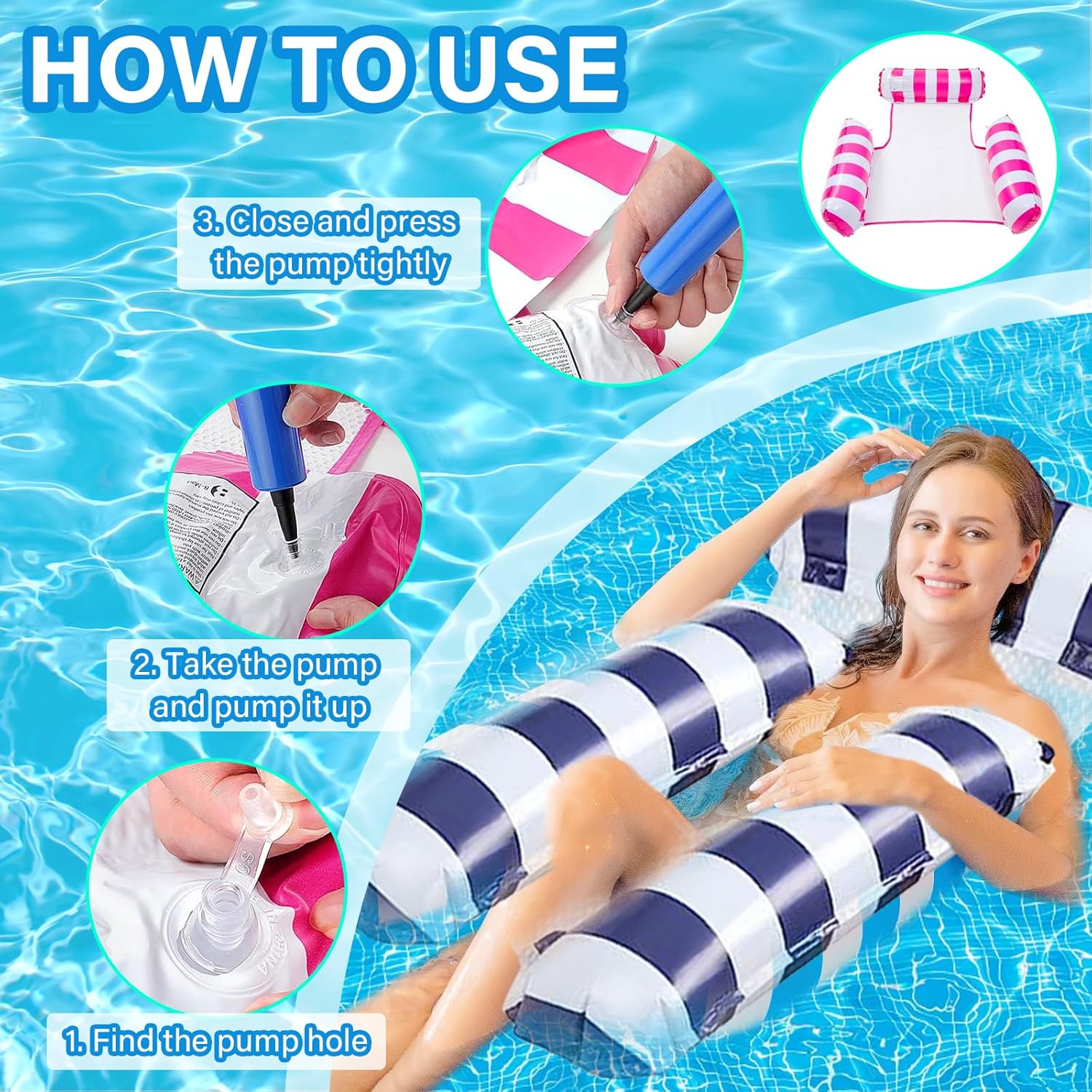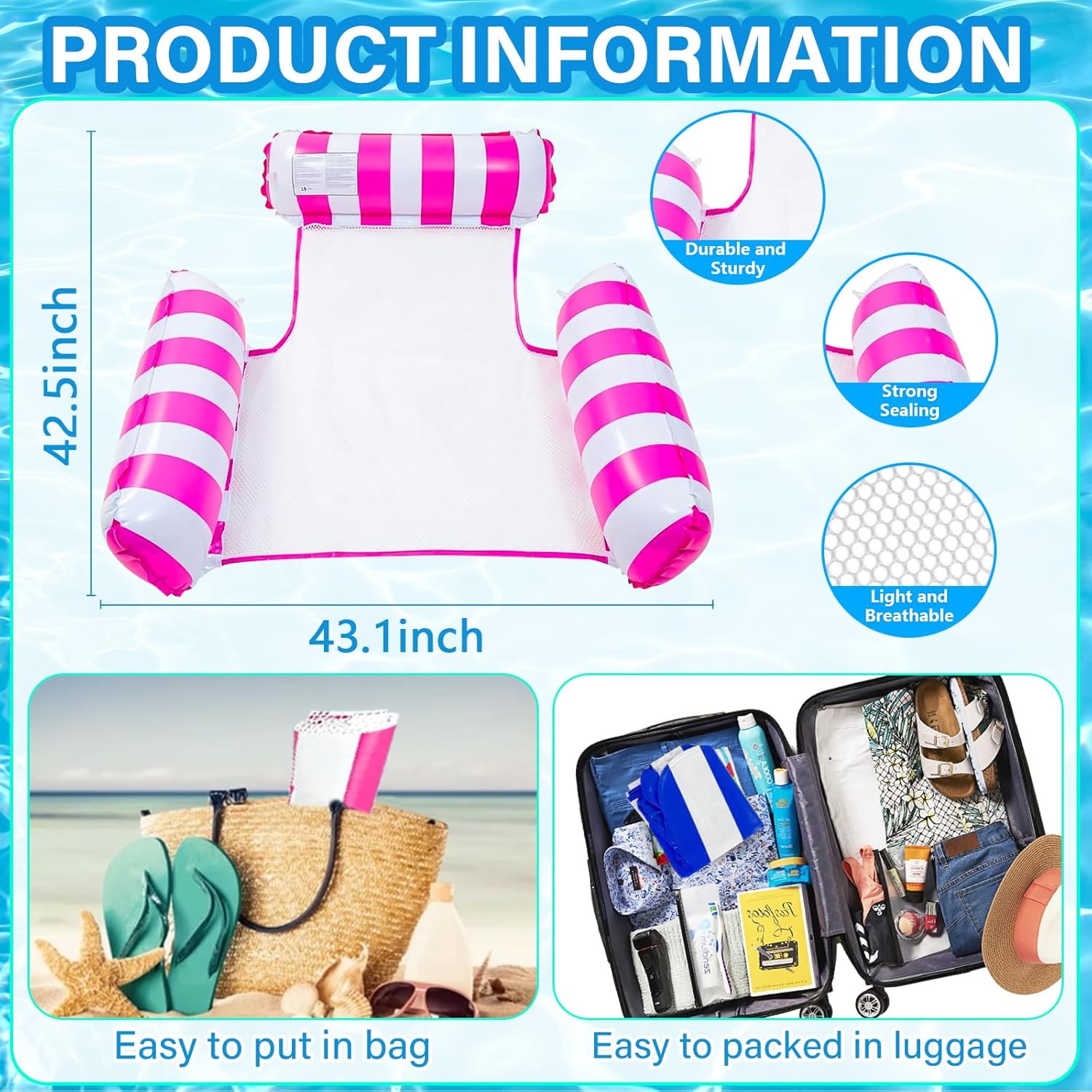 【Amaca d'Acqua 4 in 1】 Il nostro galleggiante gonfiabile, con la sua esclusiva funzione acqua 4 in 1, può essere utilizzato come amaca, lettino, galleggiante e sella per esercizi. Puoi cambiare liberamente la tua posizione sul galleggiante, permettendoti di divertirti e rilassarti in piscina. Viene fornito con una pompa ad aria manuale. Questo materasso ad aria ti permette di galleggiare sull'acqua come se stessi dormendo su un'amaca, è molto morbido e confortevole. Anche se non sai nuotare, puoi comunque goderti la vista dell'acqua. 【Design aggiornato】 La sedia da piscina gonfiabile è progettata ergonomicamente per offrire molto comfort, lo schienale gonfiabile ti consente di sdraiarti o reclinarti comodamente e i braccioli gonfiabili su entrambi i lati ti proteggono efficacemente dallo scivolamento fornendo supporto per tutto il giorno per la schiena e le braccia. È dotata di una base in rete al centro che mantiene il tuo corpo parzialmente immerso nell'acqua, mantenendoti fresco e facendoti sentire più a tuo agio e rilassato rispetto ad altre normali amache acquatiche. 【Comodo e durevole】 Il nostro galleggiante per poltrona da piscina è realizzato in materiale PVC di alta qualità, sicuro ed ecologico, non tossico, non danneggerà la pelle. Ci sono morbidi cuscini di galleggiamento, un sedile centrale fisso in rete e comode poltrone per garantire ore di relax. Con una capacità di carico fino a 150 kg e un design durevole, può essere utilizzato ripetutamente per lungo tempo e non è facile da deformare. Facile da trasportare e riporre: il divano gonfiabile può essere riempito in pochi minuti con la nostra pompa ad aria libera ed è anche facile da sgonfiare per riporlo. Il lettino gonfiabile della piscina misura solo 9 x 9 pollici quando piegato in una forma piatta, il che è molto comodo da riporre o trasportare, quindi puoi arrotolarlo di nuovo e metterlo nella borsa da spiaggia e nel bagaglio per estrarlo e usarlo sempre e ovunque. 【La scelta migliore per l'estate】 L'amaca galleggiante per piscina è il regalo perfetto per goderti il divertimento in acqua con il tuo partner, la famiglia e gli amici nelle calde giornate estive. Prendi il sole, ricaricati e galleggia con amici e familiari durante una festa in piscina o all'aperto nella sicurezza dell'oceano, del lago, del fiume o della spiaggia. Permette alla tua famiglia e ai tuoi amici di rilassarsi e godersi tutta l'estate con te. Naturalmente è anche un regalo ideale per i tuoi amici, familiari e bambini.