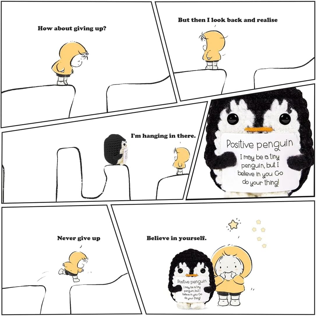 Il set include: Immergiti in un mondo di umorismo! Riceverai 2 gomitoli di lana a forma di pinguino con un messaggio di incoraggiamento stampato su di essi. La carta è incollata e non si stacca! Un regalo originale che si distingue: questo è perfetto per una festa di compleanno,Natale o semplicemente per rallegrare la giornata della persona amata. Puoi regalare questo incentivo al tuo partner,ai tuoi figli e a tutte le persone che sono importanti per te Scivola verso la felicità: non è solo un pinguino,è un maestro del buon umore! Ogni sguardo a questo piccolo pinguino ti regalerà oscillazioni positive e ti farà sorridere,anche nelle giornate più "grigie"! Personalizza i tuoi interni: decora il tuo spazio con un senso dell'umorismo inaspettato. Installa questo piccolo pinguino resistente allo stress nel tuo soggiorno,camera da letto,ufficio o persino in bagno: è il posto perfetto per darti la potenza di cui hai bisogno. Design superiore: realizzati con filato di lana di alta qualità,i nostri pinguini aggressivi resistono alla prova del tempo e alle risate ripetute. Anti-scala di grigi garantita!