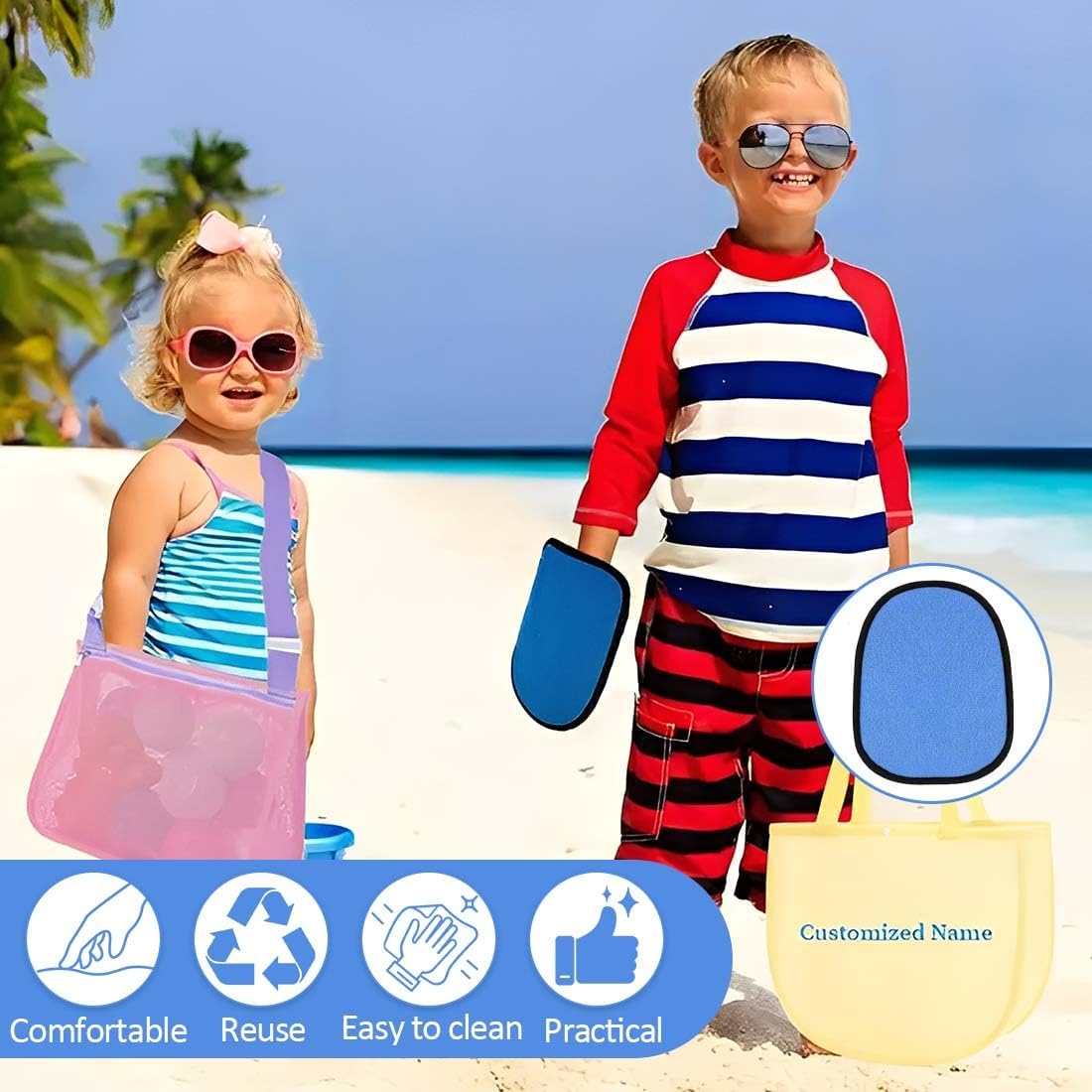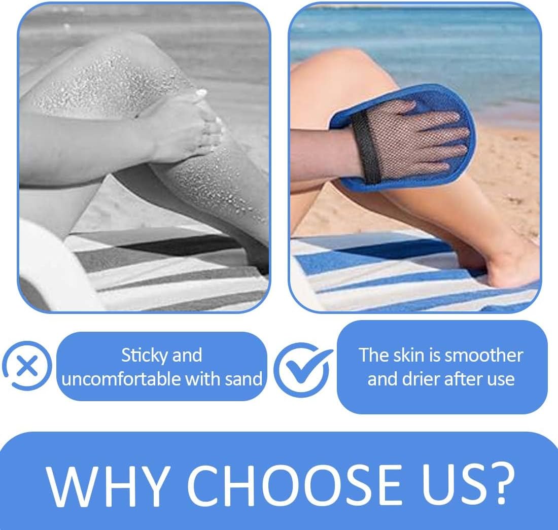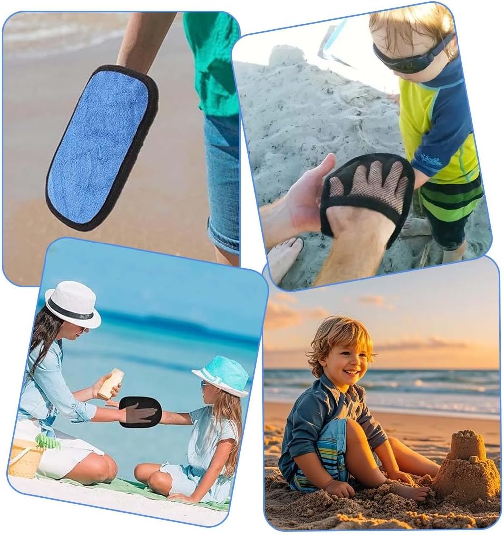 Dei compagni versatili in spiaggia: riceverete due guanti per rimuovere la sabbia. Con le dimensioni compatte di 15 x 20 cm e realizzati in pile di corallo e cotone, questi guanti diventano l’accessorio da spiaggia perfetto. Possono essere utilizzati sia come un accessorio per pulire il corpo dopo il nuoto che come una pratica spazzola per rimuovere la sabbia. Rimozione efficace della sabbia: i nostri guanti per rimuovere la sabbia con struttura a tre strati (parte anteriore in poliestere, retro in rete e cotone assorbente) rimuovono anche la sabbia più fine in pochi secondi. Il meccanismo integrato del sacchetto della polvere non richiede talco ed è perfetto per le pelli sensibili. Design delicato sulla pelle: La superficie in pile di corallo di questi guanti rimuovi-sabbia ideali per bambini è certificata. i bordi arrotondati e la morbida imbottitura proteggono la pelle dalle irritazioni durante la rimozione della sabbia in spiaggia. Adatti anche per chi soffre di neurodermite e per la pulizia delle zampe degli animali domestici! Facili da pulire: le spazzole per sabbia riutilizzabili si distinguono per la pulizia 3-in-1. 1. Risciacquare con acqua pulita. 2. Lasciare asciugare all'aria. 3. Se necessario, sono lavabili in lavatrice a 30°C. Il design a rete traspirante previene la formazione di muffa, ideale per l'uso frequente in spiaggia e in campeggio. Facili da trasportare: con soli 50 g per guanto, il set di guanti rimuovi-sabbia è leggerissimo. Gli accessori da spiaggia pieghevoli misurano 15 x 10 cm piegati per adattarsi a qualsiasi custodia per cellulare. I nostri guanti per rimuovere la sabbia sono compatti e si adattano a borse e zaini senza occupare molto spazio.