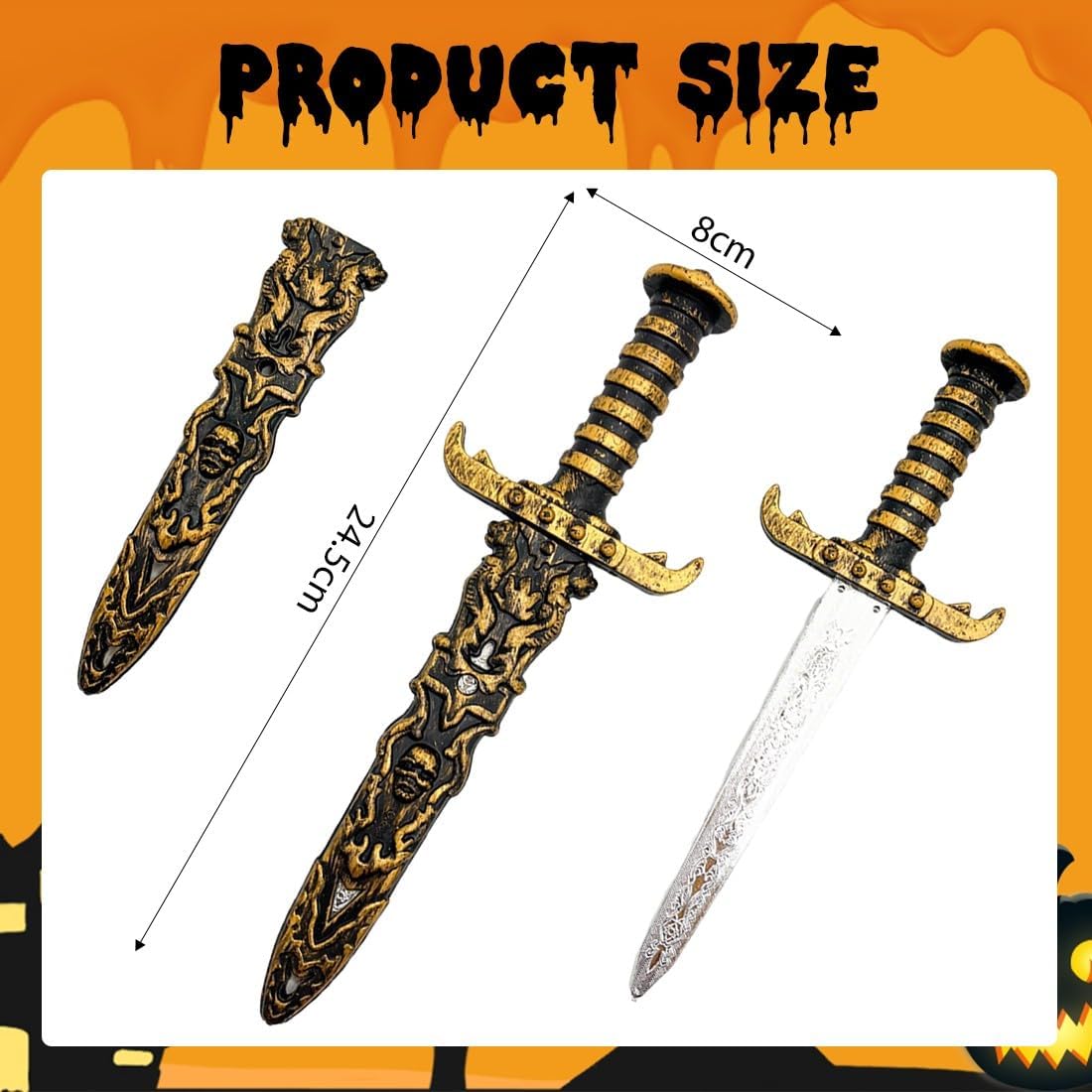 Facile da usare: spada pirata di Halloween. Semplice e intuitiva, facile da usare. Basta premere leggermente il pugnale; le due piccole lame arrotondate sulla parte superiore si inseriscono perfettamente nel fodero, rendendolo molto stabile. Non devi preoccuparti che la spada si sfaldi. Sia i bambini che gli adulti possono iniziare rapidamente e godersi il divertimento del gioco di ruolo. Facile da usare: spada pirata di Halloween. Semplice e intuitiva, facile da usare. Basta premere leggermente il pugnale; le due piccole lame arrotondate sulla parte superiore si inseriscono perfettamente nel fodero, rendendolo molto stabile. Non devi preoccuparti che la spada si sfaldi. Sia i bambini che gli adulti possono iniziare rapidamente e godersi il divertimento del gioco di ruolo. Facile da trasportare: la nostra spada di plastica è leggera e delle giuste dimensioni. Con un peso totale di 30 grammi e una lunghezza di 24,5 cm, non è né troppo pesante né troppo grande, è facile da trasportare e non si danneggia facilmente. È adatta alle mani dei bambini piccoli e non crea alcun fastidio né ai bambini né agli utenti. Questa spada da pirata può essere abbinata a qualsiasi costume da festa o spettacolo pirata. Design unico: il giocattolo è realizzato in oro retrò, con un aspetto squisito e unico. Accessori pirata: le squisite incisioni e texture, così come la realistica forma di pugnale, aumentano il realismo e il valore ornamentale del giocattolo, trasportano i bambini nell'avventuroso mondo dei pirati e stimolano l'immaginazione e la creatività dei bambini. I bambini lo mettono giù. Regalo perfetto: questo pugnale giocattolo presenta un design unico. Può essere utilizzato come oggetto di scena nei giochi per bambini per aumentarne il divertimento. Può anche essere usato come oggetto di scena per film o teatro, decorazione per feste a tema, giochi di ruolo, spettacoli scolastici e video. È un oggetto di scena ideale per Le mille e una notte. È un accessorio perfetto per costumi marroni, orientali o da pirata. Una spada da pirata è un regalo speciale per chiunque!