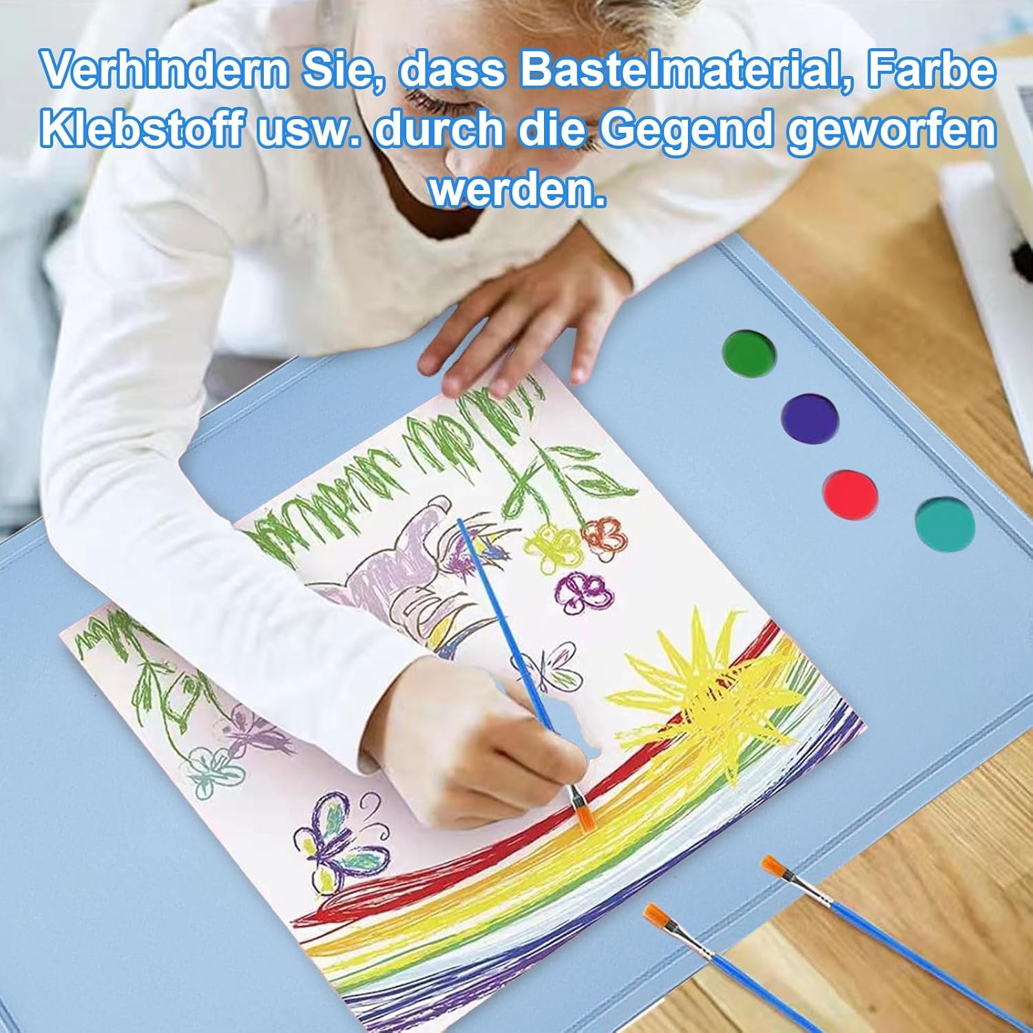 Kit creativo all-in-one per lavori puliti: include 1 grande base da disegno (60 x 40 cm) per tavoli + 1 piccola (45 x 30 cm) per un uso portatile + 2 braccialetti a scatto come pratico supporto. base da pittura per bambini Clip magnetiche adesive per pittura antiscivolo: i magneti integrati fissano carta/tela; ideali per acquerelli o colori acrilici, impediscono ai bambini di scivolare. Base da pittura Silicone alimentare e resistente al calore, privo di BPA, lattice e ftalati; resistente fino a 230 °C per perline o colla a caldo. Base per bricolage Facile da pulire e conservare: la superficie idrorepellente pulisce i colori; lavabile in lavastoviglie (fino a 70 °C). Arrotolabile con per risparmiare spazio. Multifunzione nella vita quotidiana tedesca: come base per bricolage, tappetino da forno o protezione da scrivania; i braccialetti a scatto mantengono pennelli o chiavi a portata di mano.