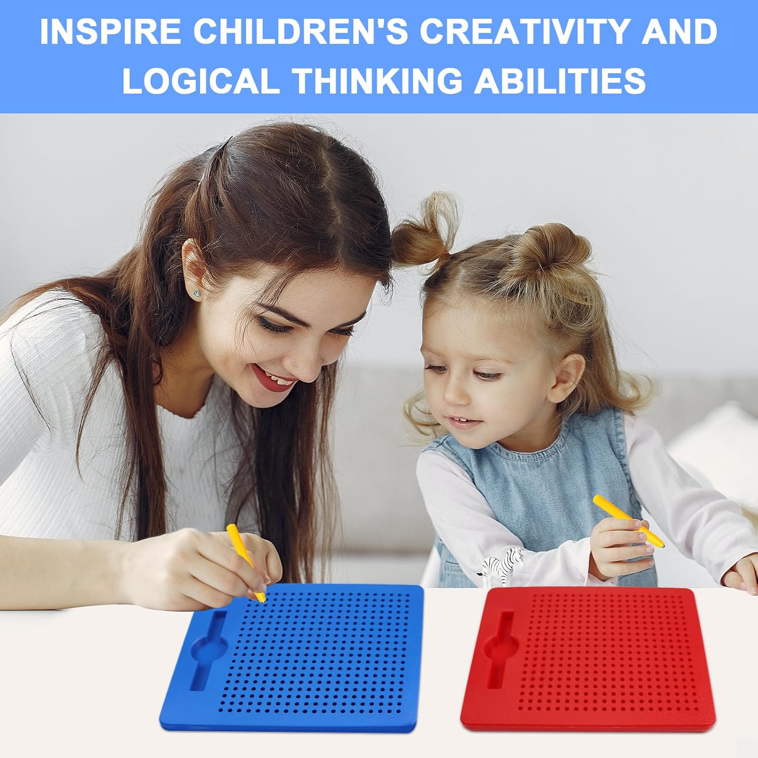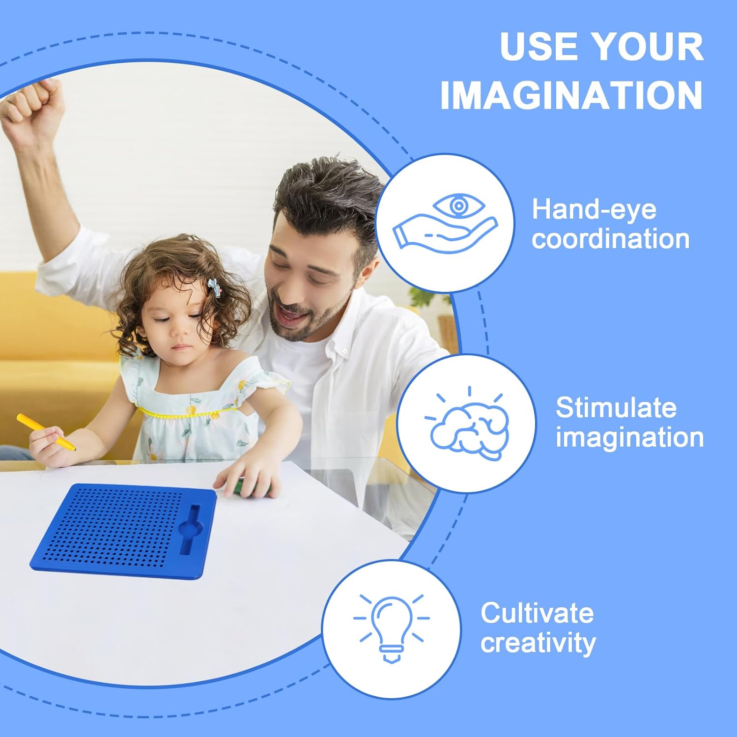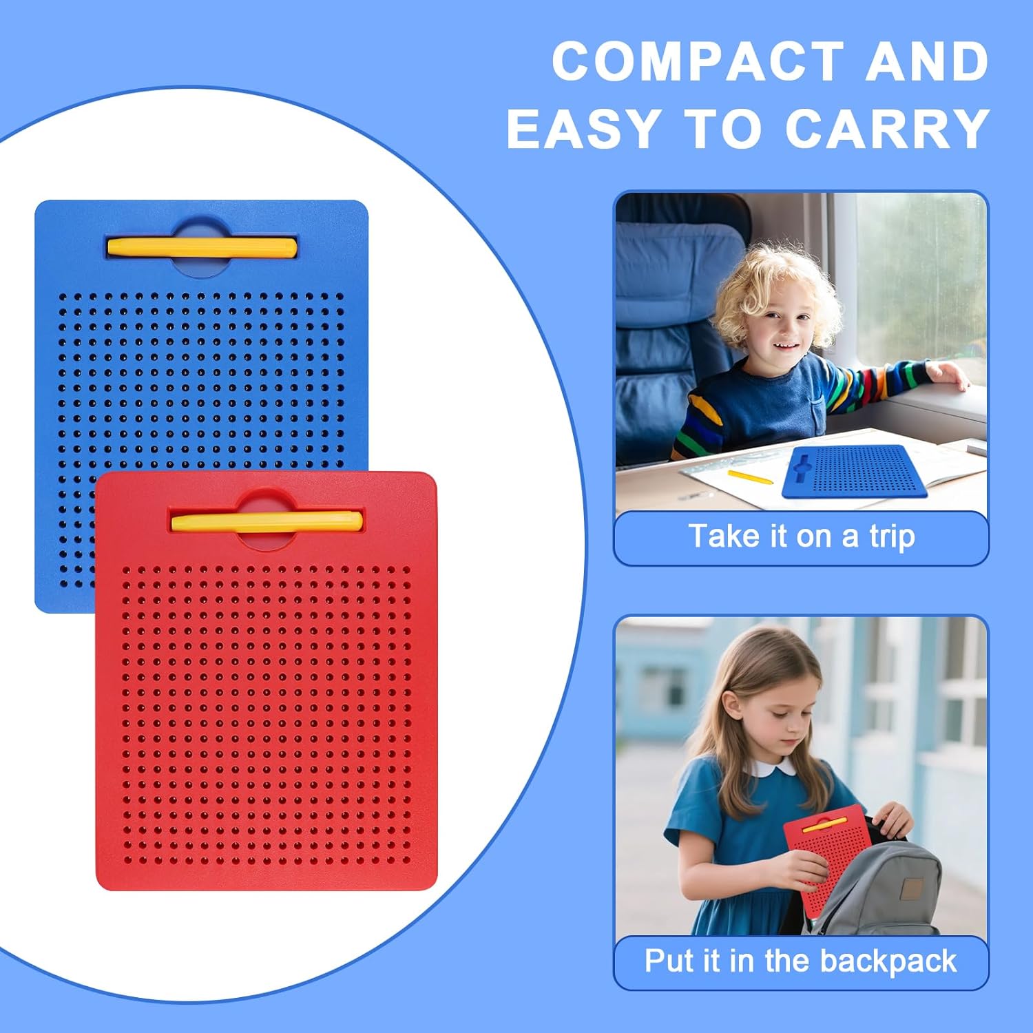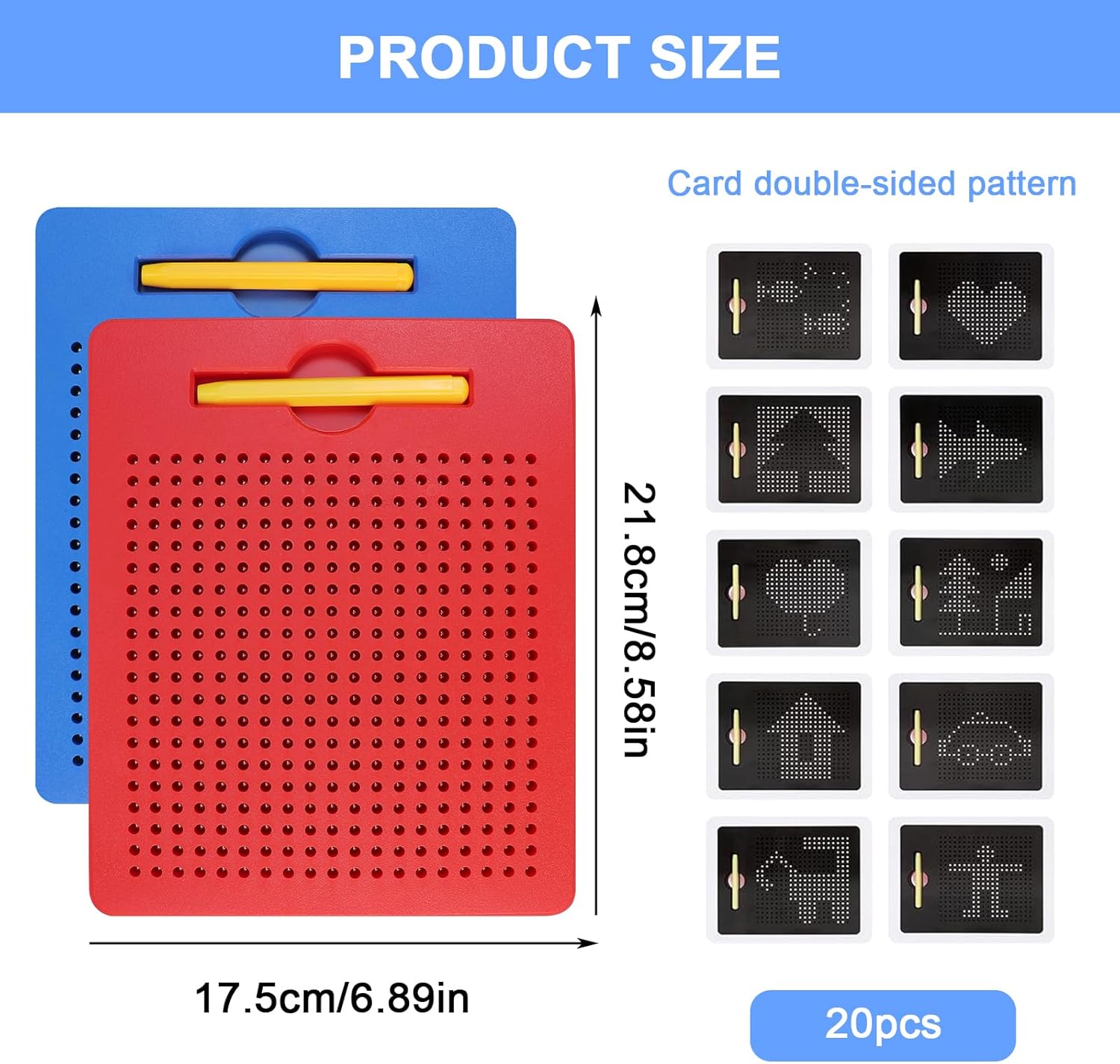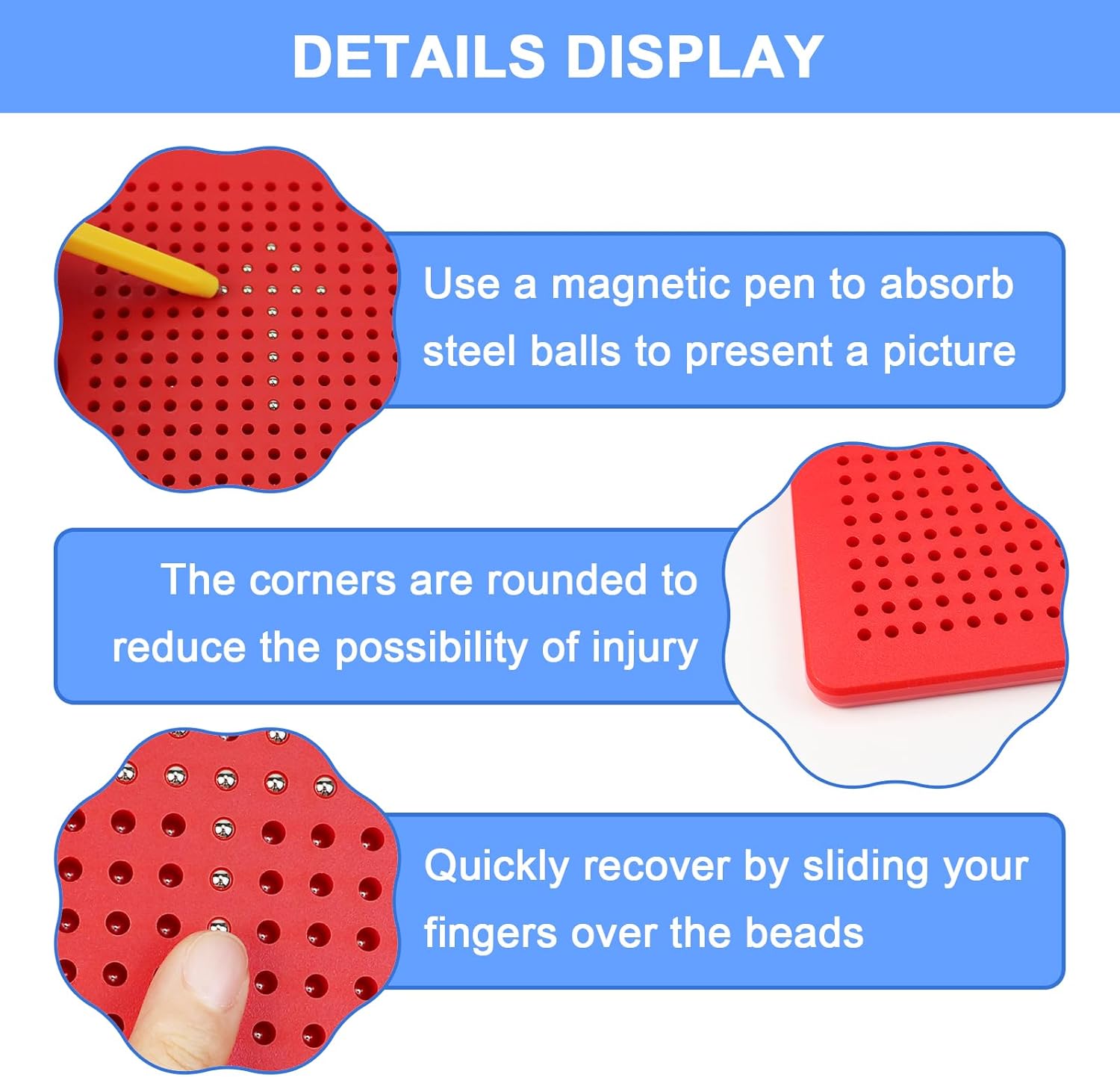 🖌️【Materiali di Alta Qualità e Sicuri】La lavagna magnetica per bambini è realizzata in plastica ABS resistente e atossica e sfere magnetiche. Queste sfere magnetiche sono fissate saldamente per evitare che vengano ingerite accidentalmente. I materiali resistenti garantiscono che questo giocattolo possa sopportare un uso frequente ed è ideale per bambini dai 3 anni in su. 🖌️【Promuove lo Sviluppo e la Creatività】Con la lavagna magnetica con palline d'acciaio, i bambini possono sviluppare le loro capacità motorie fini, la coordinazione occhio-mano e la creatività mentre giocano. Questo giocattolo magnetico è perfetto per i bambini in età prescolare o dell'asilo per esercitarsi con numeri, lettere e forme. Attraverso il gioco interattivo, le capacità cognitive dei bambini vengono potenziate mentre viene stimolata la loro immaginazione. 🖌️【Design Creativo】La nostra lavagna magnetica con sfere in acciaio permette ai bambini di creare splendide immagini in rilievo e incassate utilizzando penne magnetiche. Questo design creativo offre divertimento senza fine e stimola la creatività dei bambini. Il controllo preciso delle sfere in acciaio permette ai bambini di creare opere d'arte uniche e di esporle con orgoglio. 🖌️【Compatto e Portatile】La nostra lavagna magnetica è leggera e facile da trasportare, rendendola la compagna ideale per i viaggi. Che si tratti di un lungo viaggio in auto, di un volo o di una cena al ristorante, questo giocattolo magnetico per bambini è sempre a portata di mano, offrendo ore di divertimento senza occupare troppo spazio. Grazie alle sue dimensioni pratiche e al design leggero, la lavagna può essere facilmente trasportata in qualsiasi tasca o zaino. 🖌️【Giocattolo Educativo】La nostra lavagna magnetica misura circa 21,5 x 17,5 centimetri, è progettata per essere compatta, facile da trasportare e adatta all'uso in viaggio. La confezione include 2 lavagne magnetiche con palline d'acciaio, 2 penne magnetiche e 20 schede con motivi. La lavagna magnetica incoraggia il tempo di qualità con il vostro bambino. Approfittate di questa opportunità per interagire con il vostro bambino, incoraggiarlo e godervi insieme momenti creativi.