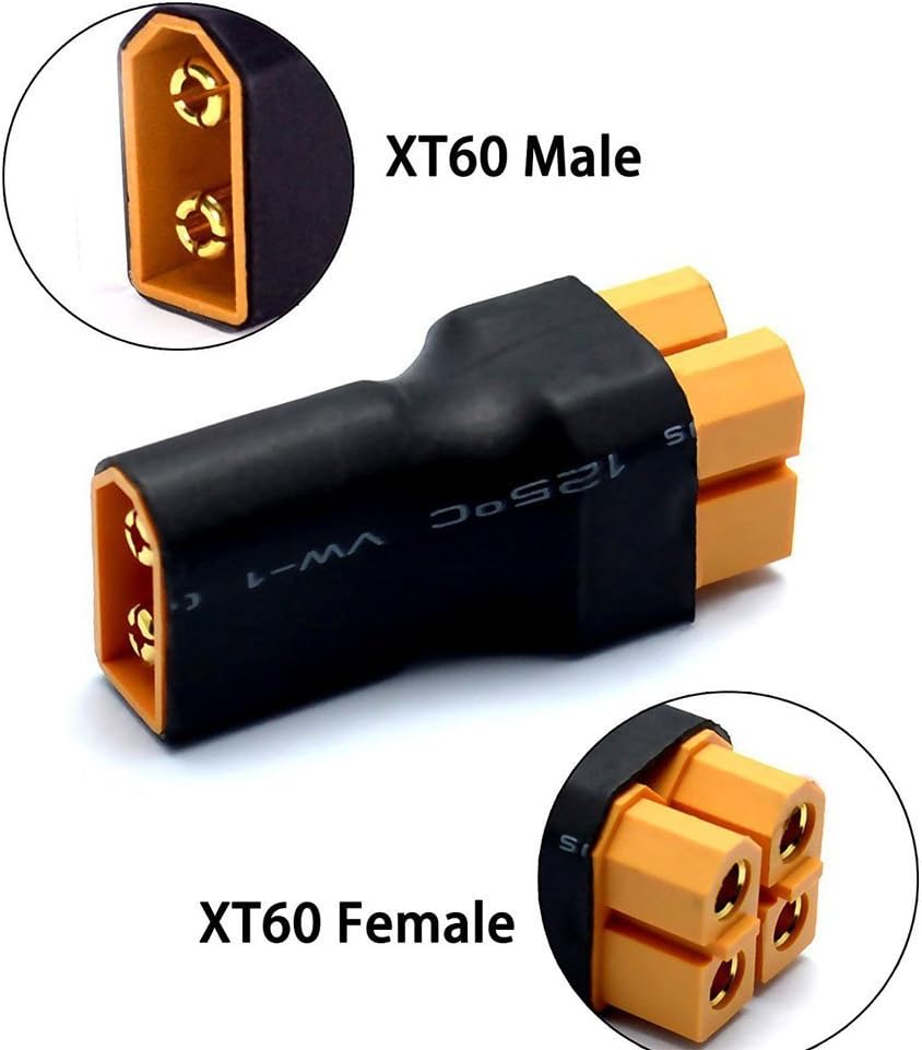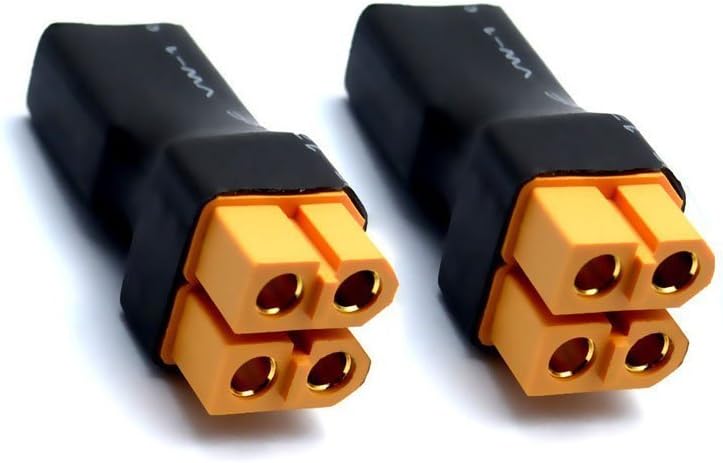 Adattatore adattatore XT60 da maschio a 2 femmina. Ottimo per un metodo compatto di commutazione parallela delle batterie, buono per caricare 2 batterie contemporaneamente. Nessun design del cavo può risparmiare più spazio, portatile e facile da usare. Risparmia tempo durante la saldatura utilizzando questi connettori. Per convertire due batterie parallele / doppia capacità. ad esempio Se sono collegate 2 batterie 3S 11,1 V 5000 mAh, si ottiene 1 3S 11,1 V 10000 mAh.