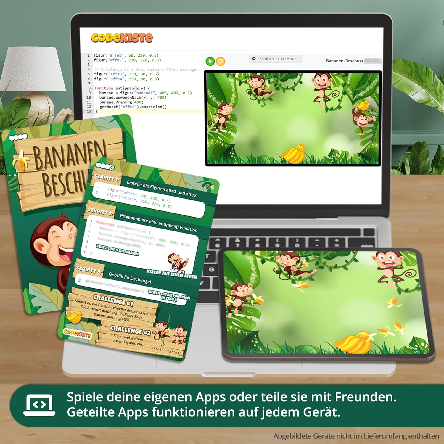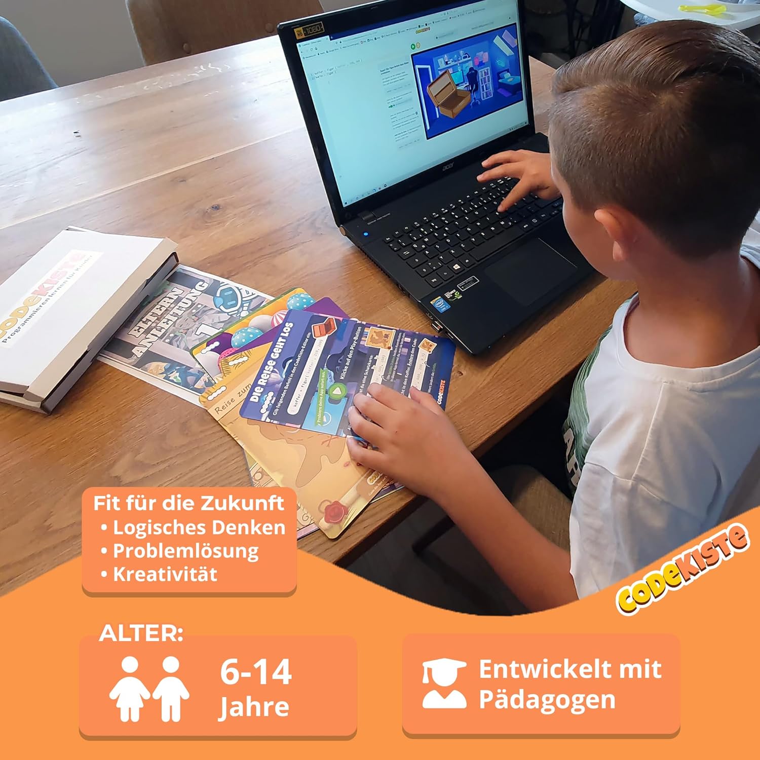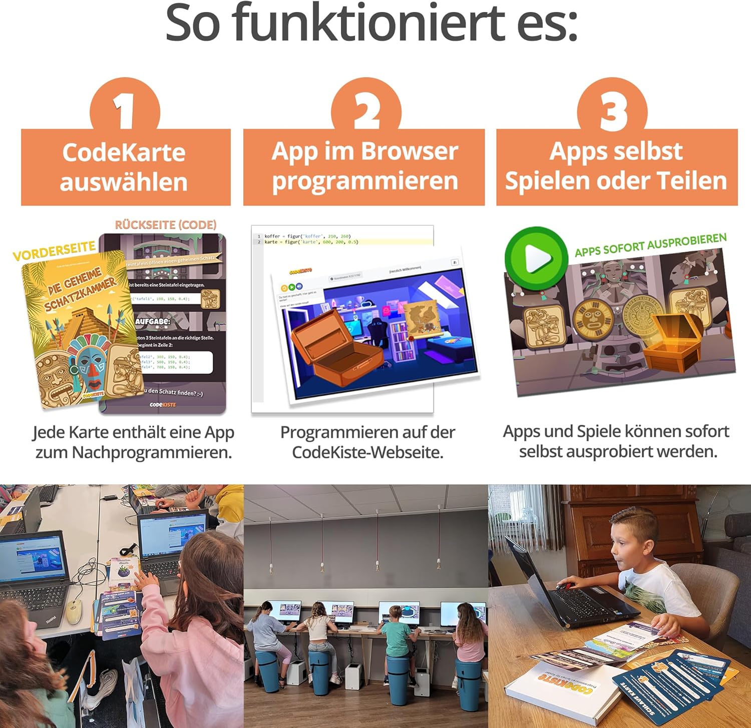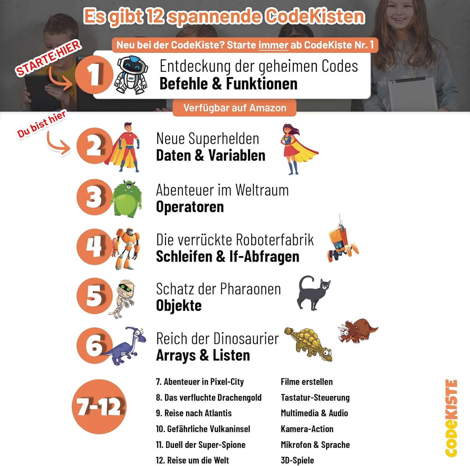 Attenzione genitori e figli: la scatola dei codici insegna ai bambini a programmare in modo semplice e divertente. Riceverai progetti app divertenti ed entusiasmanti da riprogrammare. Testato da oltre 1.000 bambini! Ideale dai 6 ai 14 anni: non è necessaria alcuna conoscenza preliminare di programmazione. Programmato direttamente nel browser, senza installazione!!! Include una guida introduttiva e una guida per i genitori (senza competenze di programmazione). Funziona su qualsiasi computer: tutte le applicazioni e i giochi programmati funzionano su computer, smartphone e tablet. Ogni scatola offre ore di divertimento e sfida. Nuovi concetti in ogni scatola: ci sono 12 CodeCaisses (sei al CodeBox #2 - New Superheroes). Ogni cassa si basa sulla precedente e incoraggia i bambini a creare applicazioni più complesse ed entusiasmanti. Digitalizzazione e informatica: programmare con la codebox aiuta anche nella formazione informatica. I bambini apprendono competenze importanti come la risoluzione dei problemi, la tastiera, la logica e il pensiero creativo.