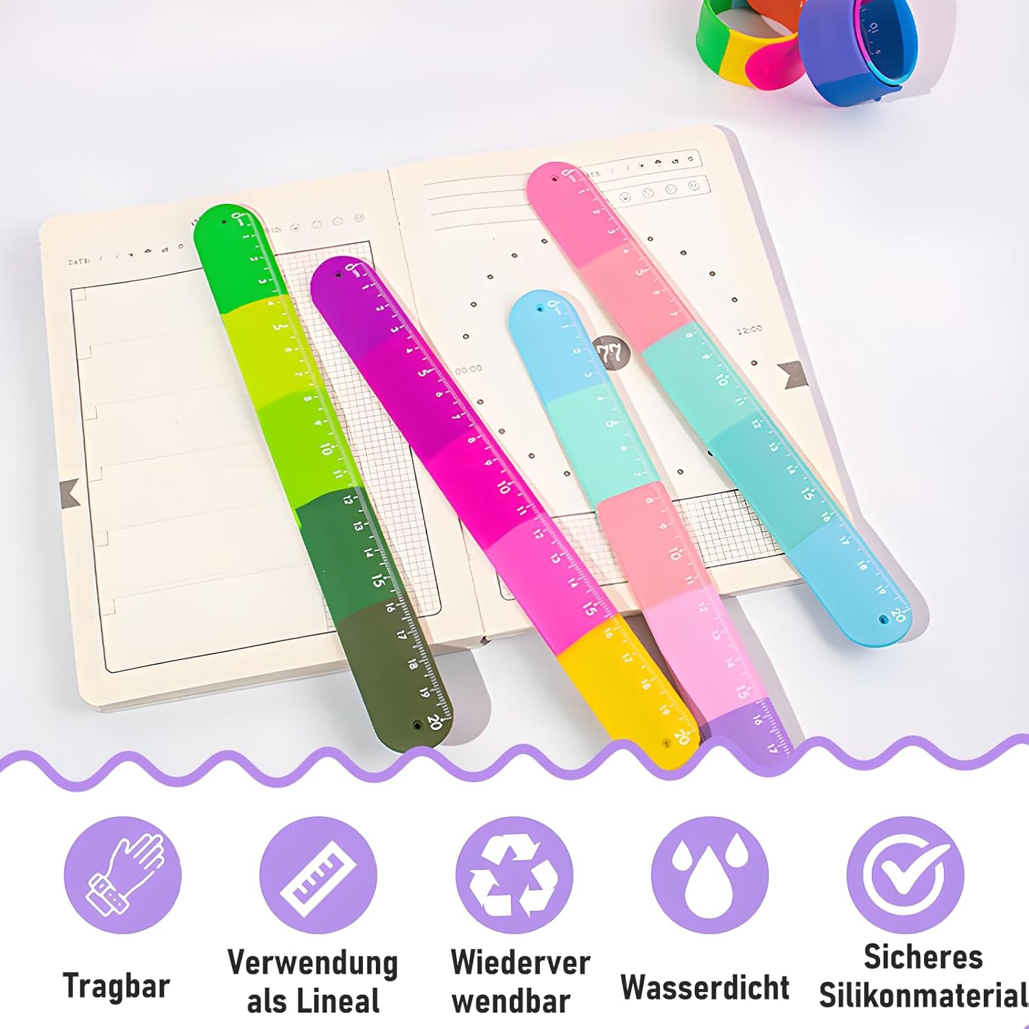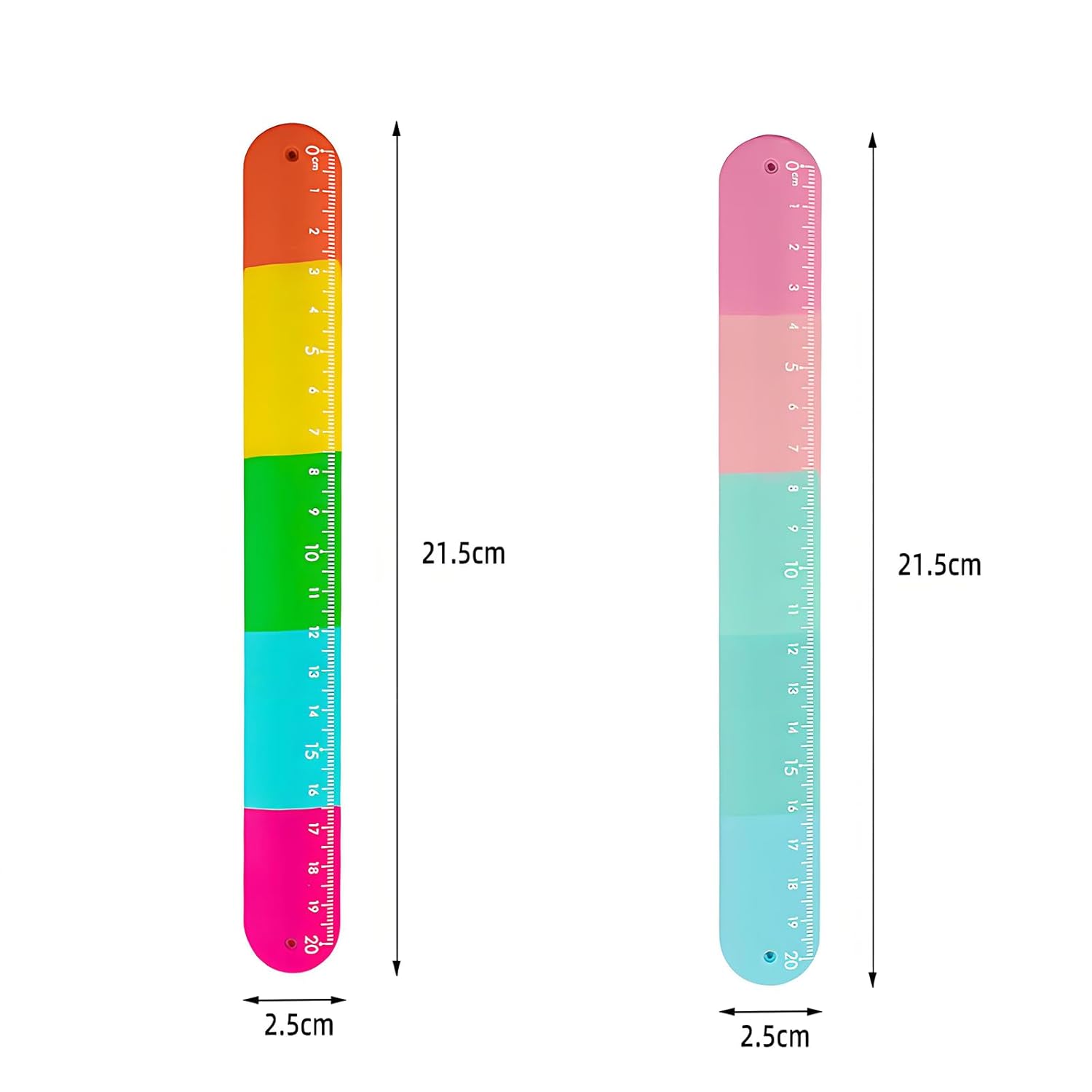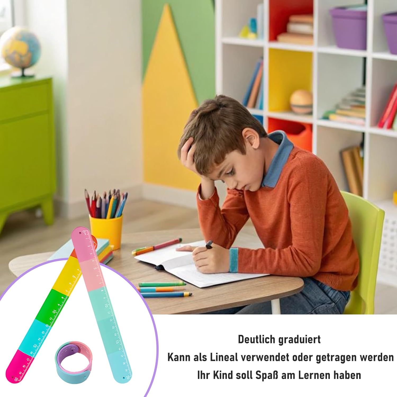 Contenuto del set: riceverete 2 righelli in silicone, un righello color macaron e un righello arcobaleno, la scala del righello è di 0-20 cm. Materiale confortevole: questo righello è realizzato in silicone e lamiera d'acciaio, il silicone è morbido e delicato sulla pelle, impermeabile e resistente al sudore, la lamiera d'acciaio non facile da deformare e durevole. Doppio design: è sia un braccialetto colorato in silicone che può essere indossato con un rubinetto, sia un righello con scala per soddisfare le esigenze di misurazione quotidiana. Scena applicabile: questo righello in silicone adatto per lo studio quotidiano degli studenti, la misurazione di disegni, cancelleria decorativa, può anche essere usato come braccialetto divertente e così via. Regalo unico: il braccialetto con righello in silicone può essere utilizzato come regalo per l'inizio dell'anno scolastico, come piccolo regalo per attività, ricompense in classe, ecc. Interattivo e pratico.