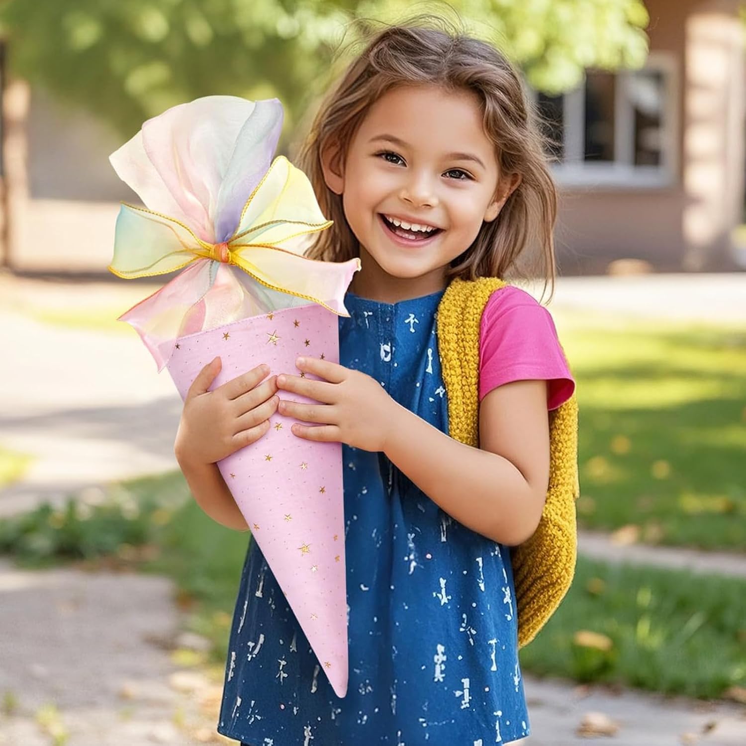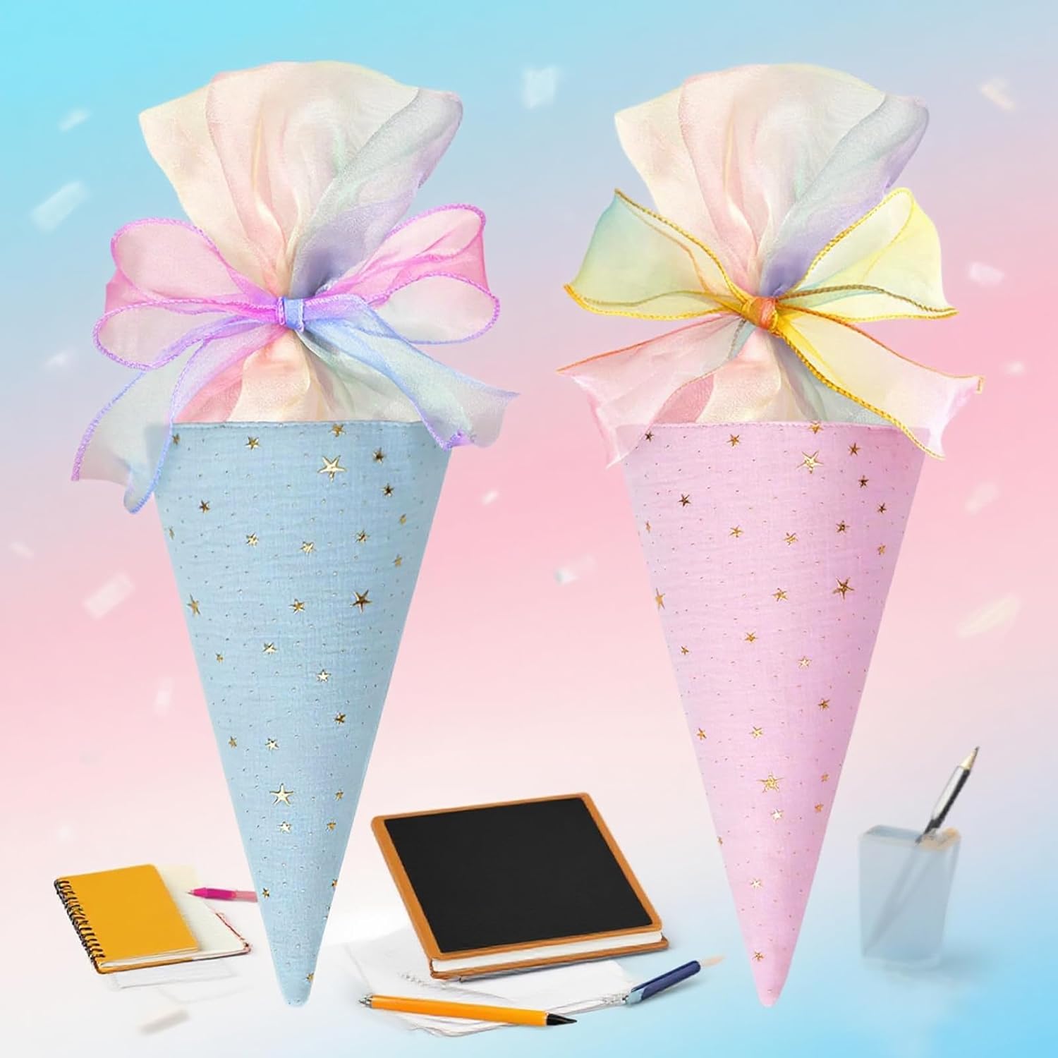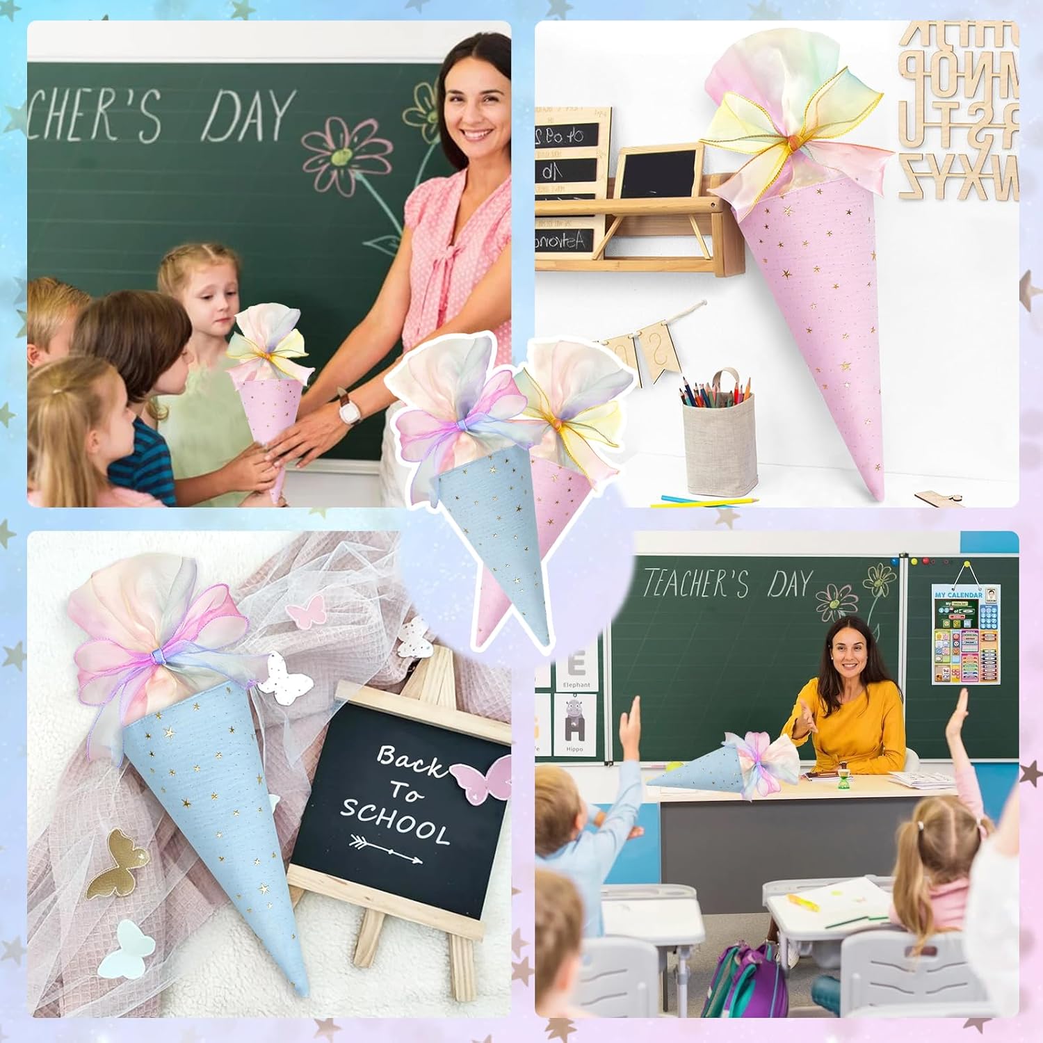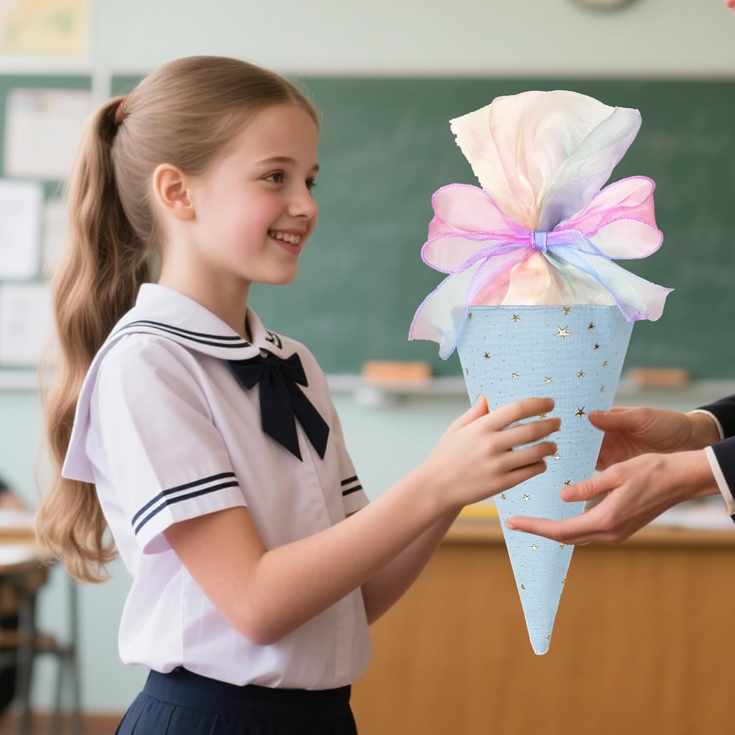 Versatile per molteplici occasioni: con la sua tavolozza di colori macaron e gli accenti stellari stampati a caldo, il fiocco in nastro vanta tonalità da sogno e una texture leggerissima. Che si tratti di esprimere gratitudine agli insegnanti durante la Giornata degli insegnanti, di inviare auguri di rientro a scuola o di confezionare un regalo di tutti i giorni, il suo aspetto fresco e morbido attira immediatamente l'attenzione, aggiungendo calore e romanticismo a ogni occasione. Design generoso: misura 49 cm di lunghezza totale e 18,5 cm di larghezza superiore, offre spazio interno sufficiente. Può contenere facilmente articoli di cancelleria, piccoli accessori, caramelle e altri oggetti compatti. Utilizzato come organizer per cancelleria o come confezione regalo, mantiene il suo contenuto al sicuro e offre una praticità eccezionale. MATERIALI PREMIUM: Realizzati in tessuto di alta qualità con raffinata goffratura in lamina d'oro che resiste alle scheggiature. Il nastro è realizzato in tulle leggero e traslucido, morbido, liscio e senza pieghe. L'arco mantiene la sua forma tridimensionale anche dopo un uso prolungato, garantendo una qualità duratura. Facile da personalizzare: il lungo nastro ti consente di regolare liberamente la dimensione del fiocco e lo stile di allacciatura. È possibile aggiungere ulteriori elementi decorativi in base al gusto personale, consentendo agli utenti di liberare la propria creatività e creare un design davvero unico e su misura, unendo divertimento e individualità. Dettagli curati: la chiusura con coulisse nella parte superiore facilita la tensione del nastro, impedendo efficacemente la fuoriuscita del contenuto. La forma affusolata non è solo esteticamente gradevole, ma facilita anche la manipolazione o la presentazione, dimostrando una meticolosa attenzione ai dettagli.
