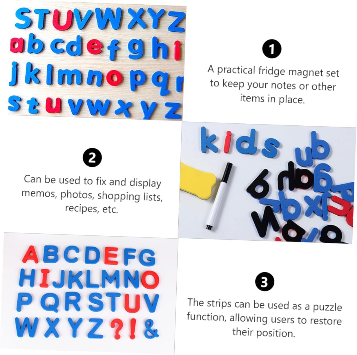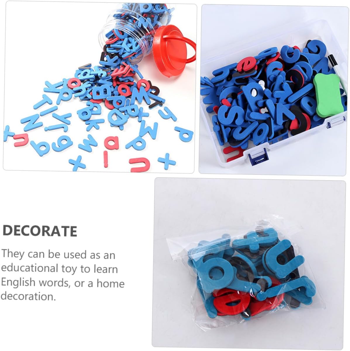 Con lettere maiuscole: un pratico set da frigorifero per tenere i tuoi appunti o altri oggetti, giocattoli per l'apprendimento prescolare Con lettere minuscole: strisce possono essere utilizzate come funzione puzzle, consentendo agli utenti ripristinare la loro posizione, con lettere magnetiche Calamite da frigorifero: uno strumento didattico fantastico per i vogliono iniziare a imparare l'inglese, calamite da frigorifero Giocattoli educativi: educativi e significativi, possono essere scritti in diverse parole difficili e facili da imparare in qualsiasi , con lettere inglesi Toppe magnetiche con alfabeto: i possono essere adsorbiti su materiali ferrosi, come lavagne, frigoriferi, ecc., con lettere maiuscole e minuscole