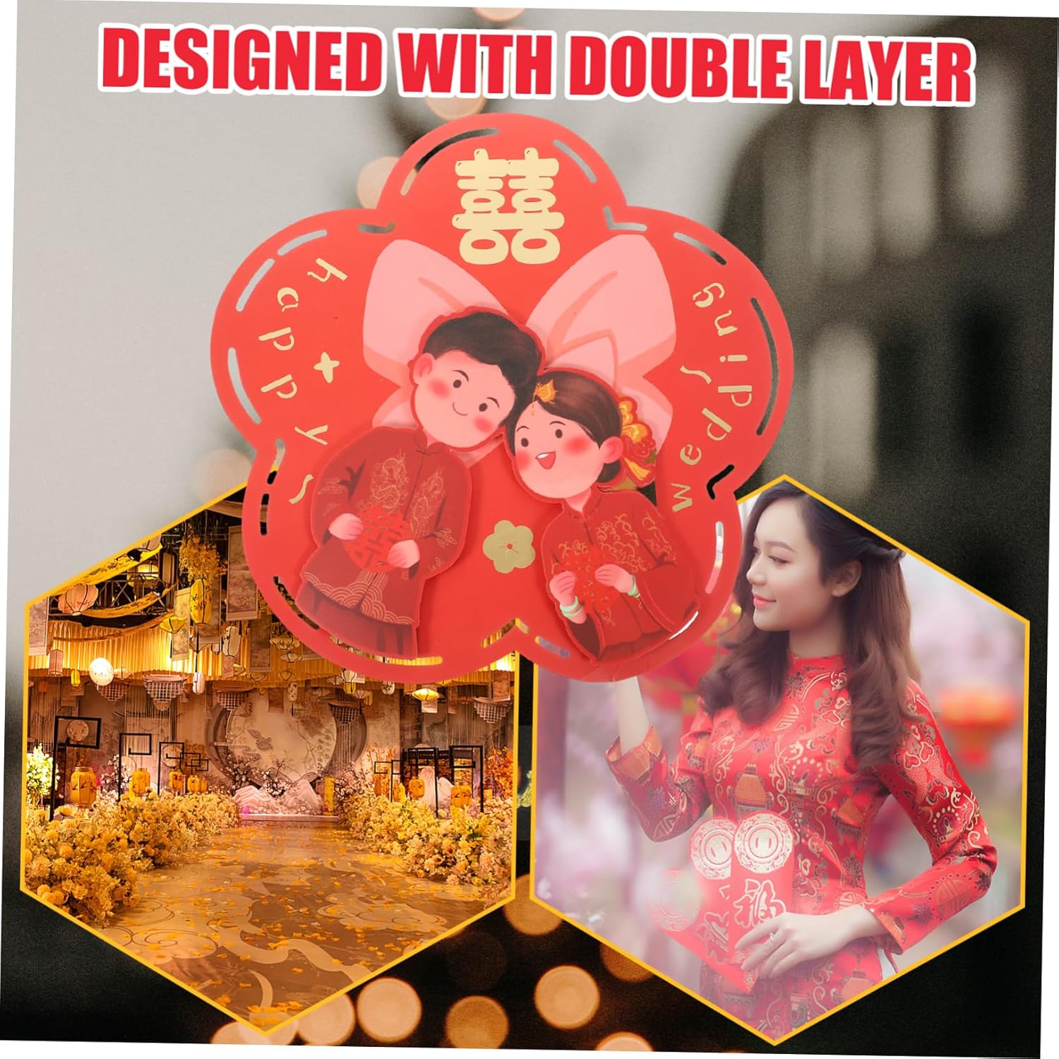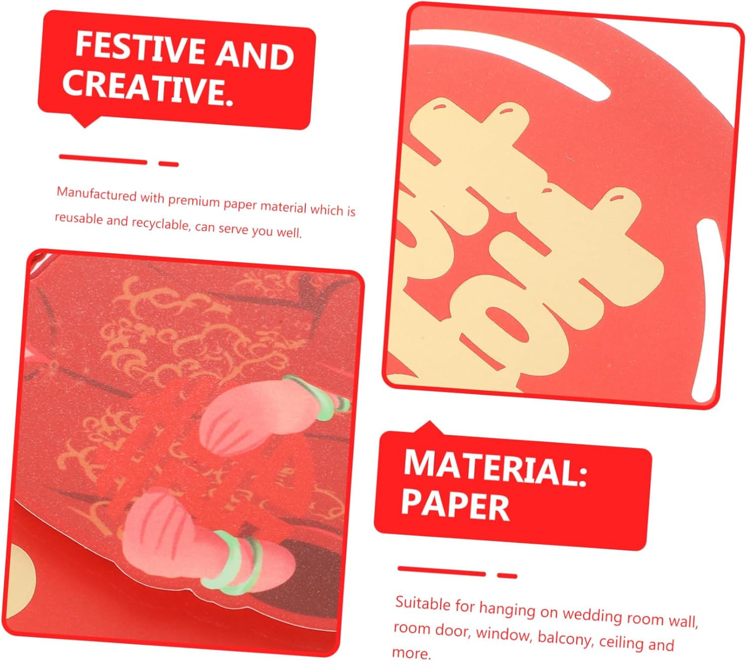 Nuovo adesivo per la casa: può essere utilizzato per la decorazione della festa di nozze, può creare matrimoni tradizionali, decorazioni di nozze cinesi Collage di parole appese: squisita benedizione stampata Il cinese è più festoso, aggiunge un'atmosfera più romantica e gioiosa, decorazione della stanza del matrimonio Decorazione a doppio taglio: queste decorazioni nuziali indicano che il matrimonio è iniziato bene, per mostrare la benedizione per la nuova coppia, decorazione tradizionale cinese Forniture nuziali: questo è un set di decorazioni nuziali in stile cinese per i vostri sposi, delicato e significativo, ornamento a ventaglio di carta nuziale Pasta rossa per parole: fatta di carta resistente e sicura, classica e creativa, taglio a doppia felicità