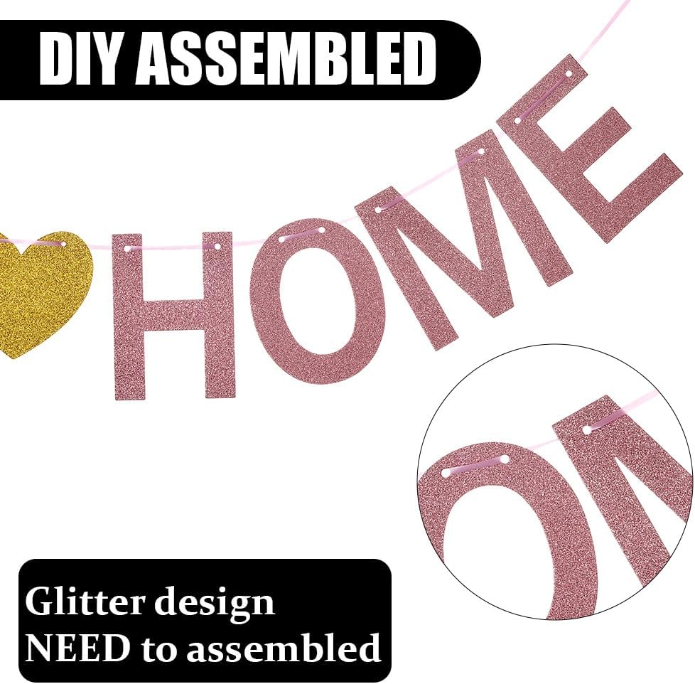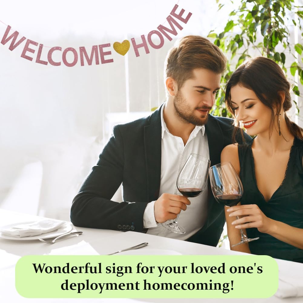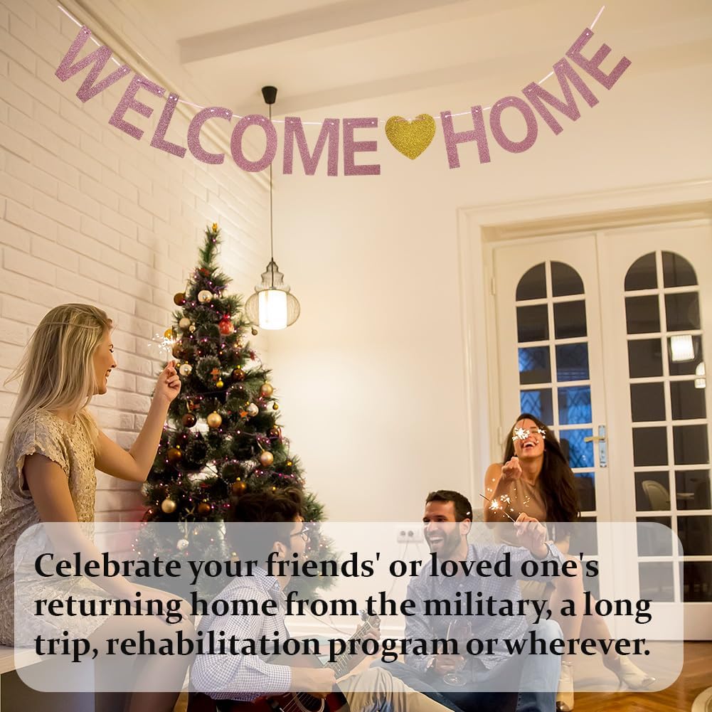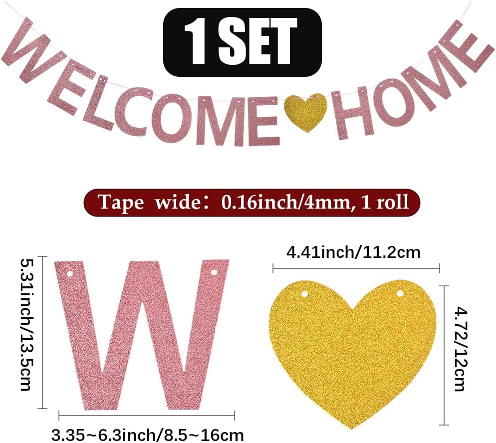 2 set di striscioni di benvenuto: 2 set di striscioni con lettere rosa glitterate, dettagli oro rosa e un cuore dorato. Migliora l'arredamento del ritorno a casa con un fascino alla moda, perfetto per cortili, porte o garage. Banner di benvenuto in oro rosa: il cuore dorato simboleggia il calore, abbinalo all'oro rosa/rosa per un look tenero e invitante. Trasforma gli arrivi ordinari in momenti preziosi, creando ricordi duraturi per le famiglie. Dimensioni: le nostre lettere di benvenuto per banner misurano circa 135 x 85 x 160 x 0,5 mm (da 5,31 x 3,35 a 6,30 x 0,02 pollici), il cuore rosso misura circa 112 x 120 x 0,5 mm (4,41 x 4,72 x 0,02 pollici) tipografia accattivante: audace, le lettere sovradimensionate garantiscono la visibilità. Ideale per spazi esterni (garage/cortile) o porte d'ingresso, rende ogni ritorno a casa grandioso ed elegante con vivaci tonalità rosa. Versatile per tutte le occasioni di ritorno a casa: adatto per riunioni di famiglia, ritorni militari o feste festive. Utilizzare come cartello per la porta d'ingresso, decorazione del garage o striscioni da giardino. Adatto a feste a tema rosa, aggiunge un tocco festoso e un'atmosfera accogliente